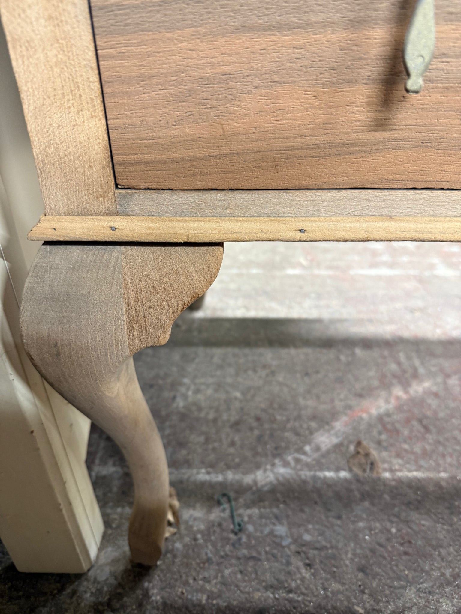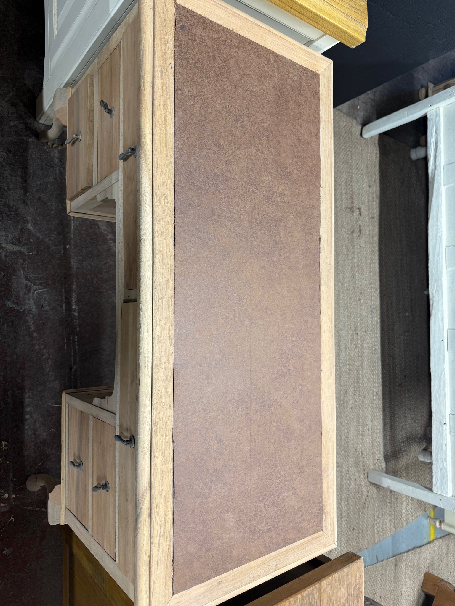 A beautiful stripped oak desk that combines solid construction with timeless appeal. The natural bare wood finish showcases the grain and character of quality oak, ready for your personal touch with wax or oil. The classic leather inlay adds sophistication, showing only minor wear. Six generously proportioned dovetail-jointed drawers provide ample storage for your workspace essentials.