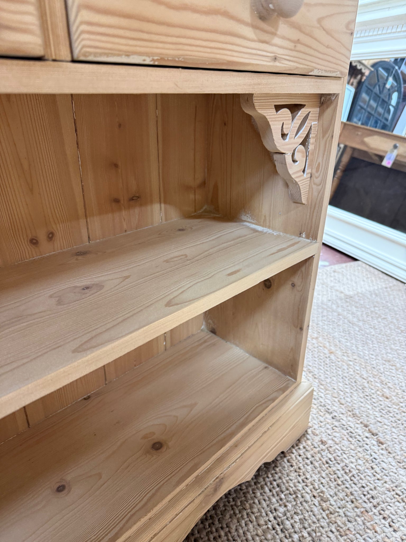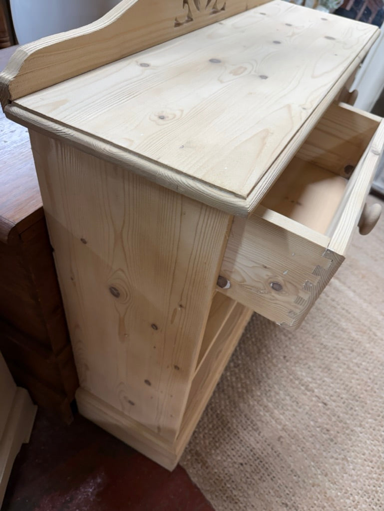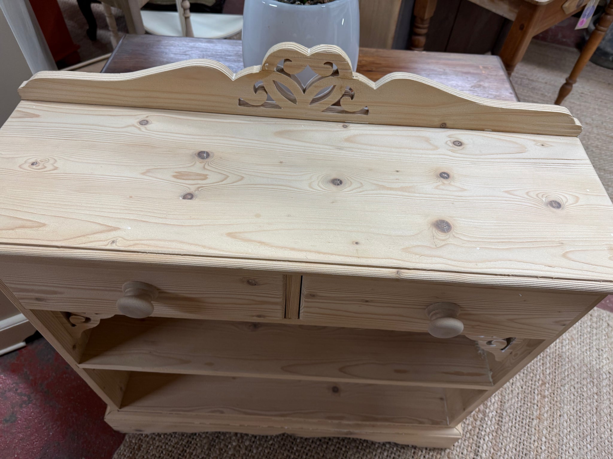 Solid pine bookcase in structurally sound condition with authentic character. Stripped back to reveal natural wood grain, with minimal white paint patina remaining. Features two dovetail-jointed drawers above a single shelf, offering practical storage for books and display items. A versatile piece that works beautifully in period or contemporary interiors.