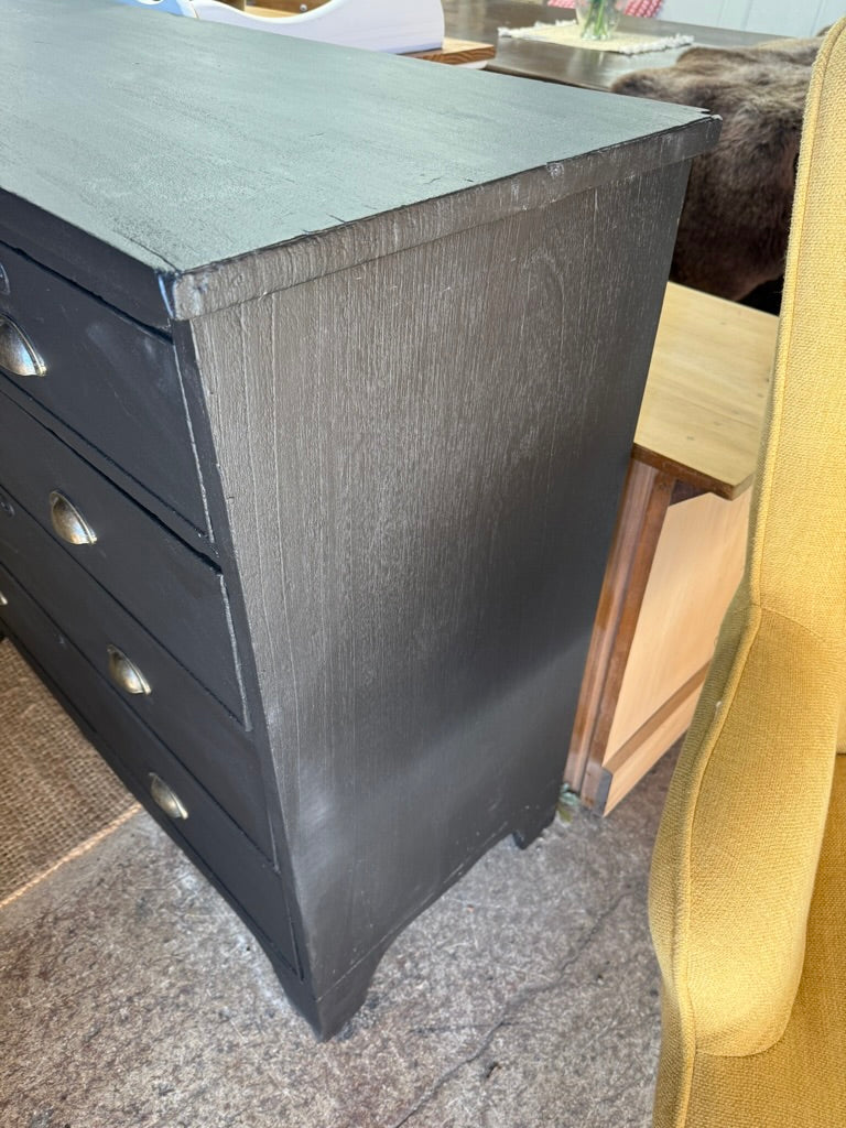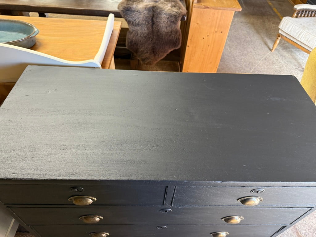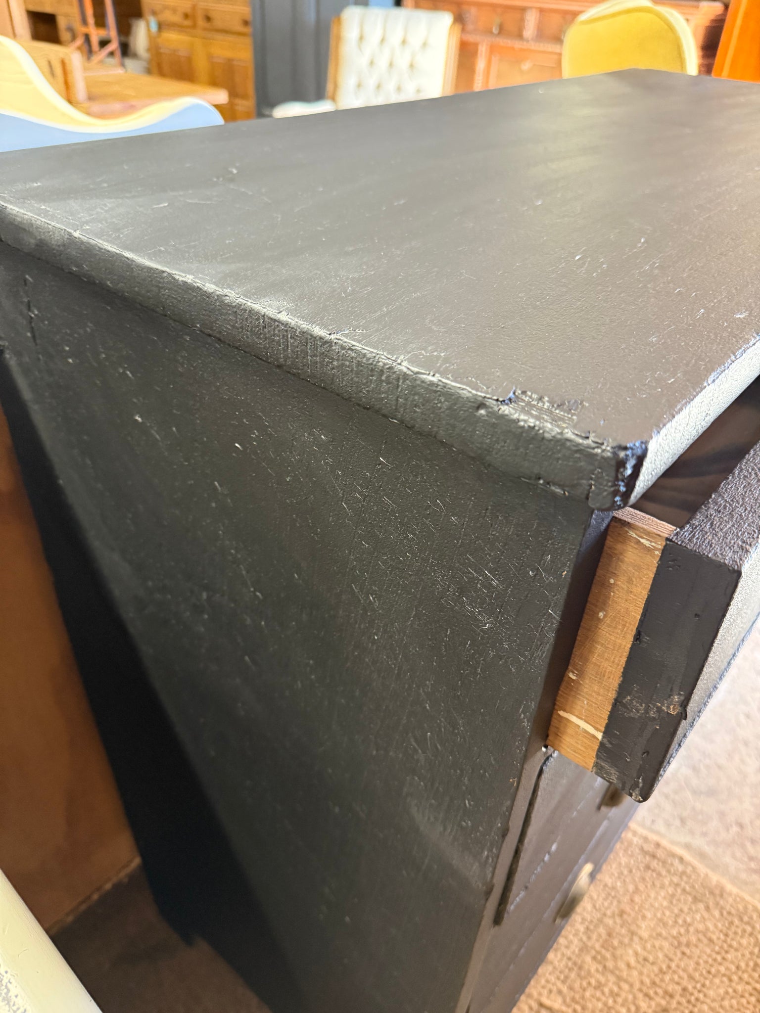 This lovely mahogany chest of drawers has been stripped and given a fresh coat of Frenchic’s 'Black Jack' paint. It shows some light signs of use, but nothing significant. With two small dovetail jointed drawers above three larger ones, it provides plenty of storage space.