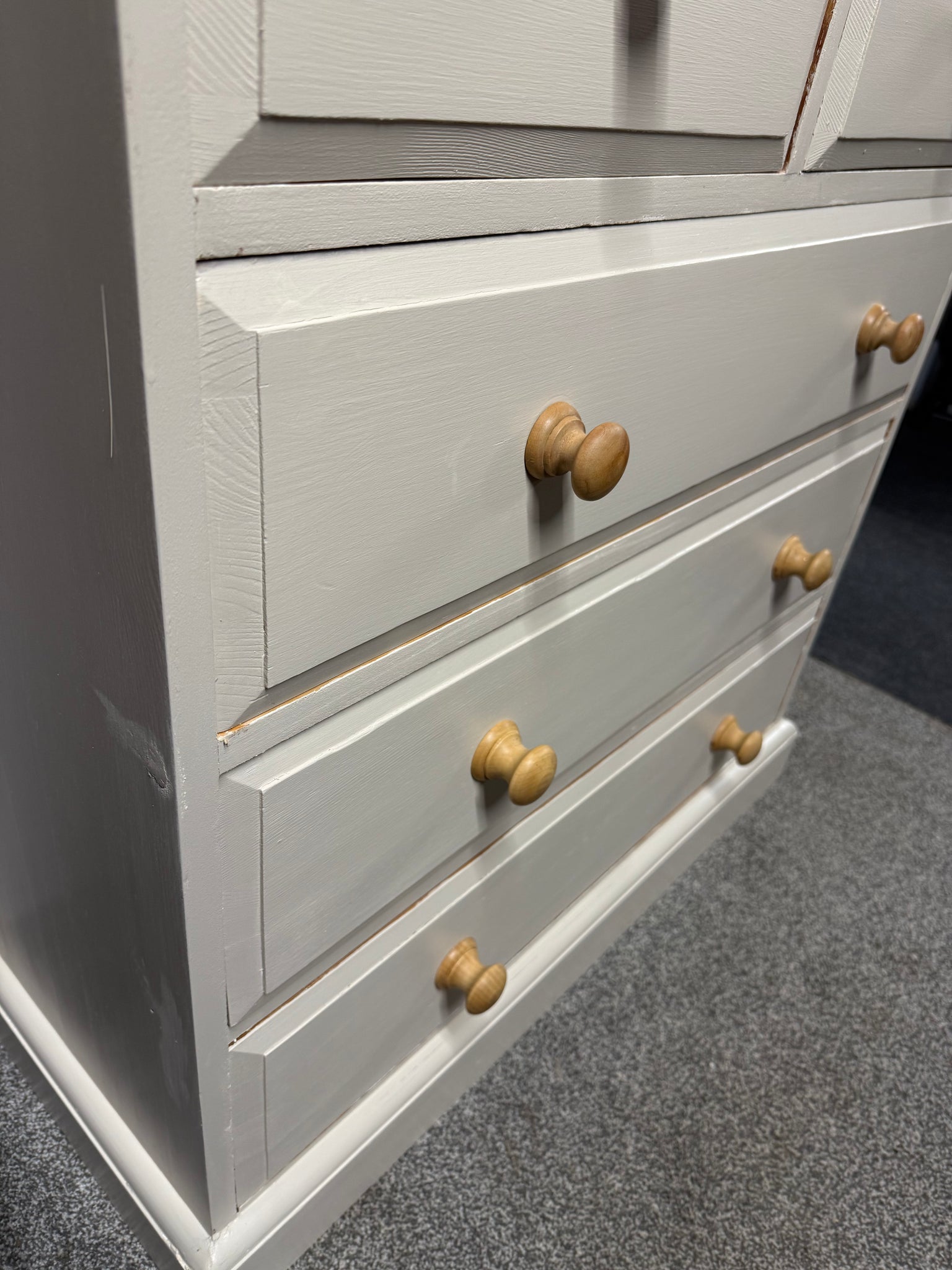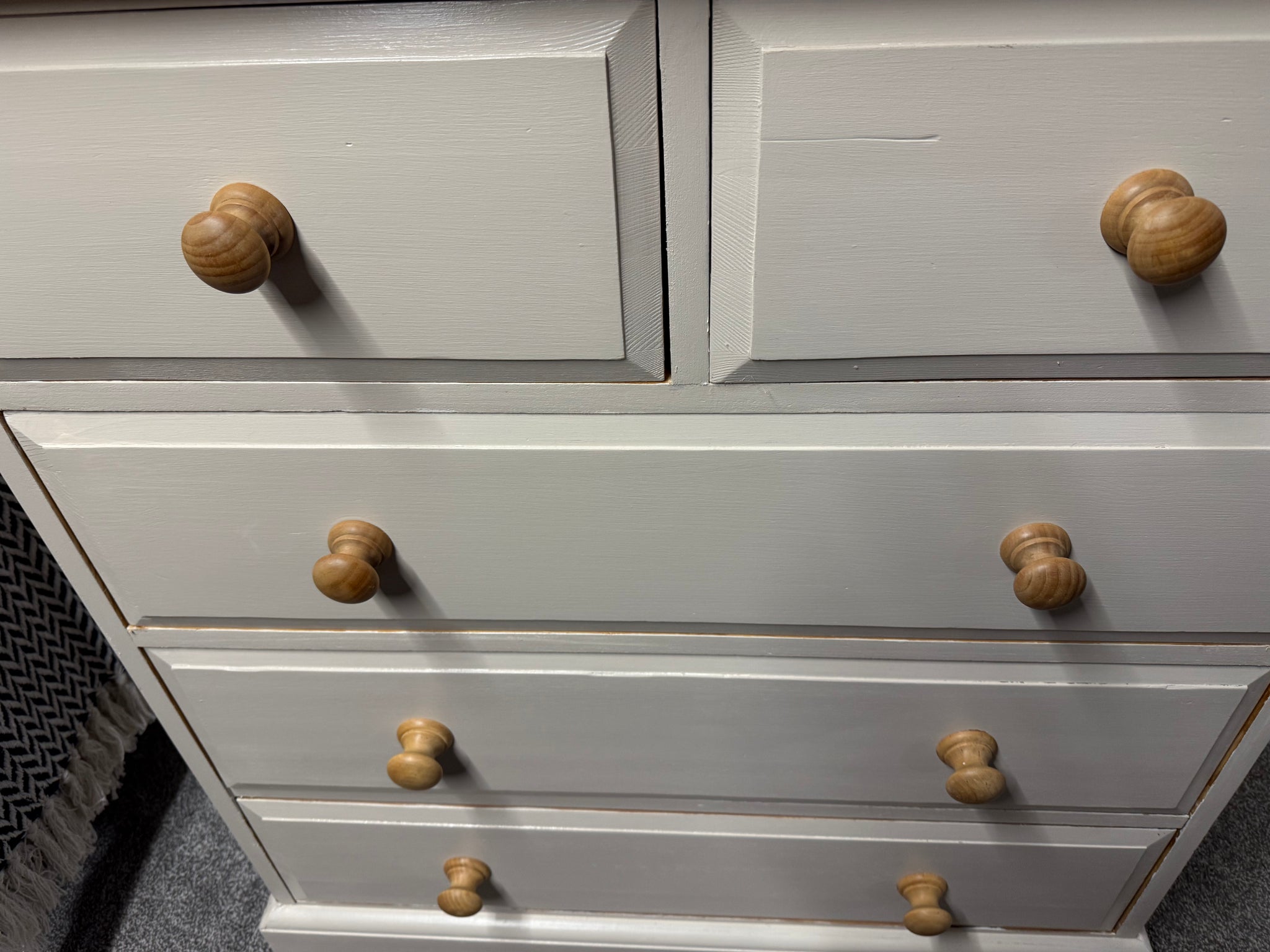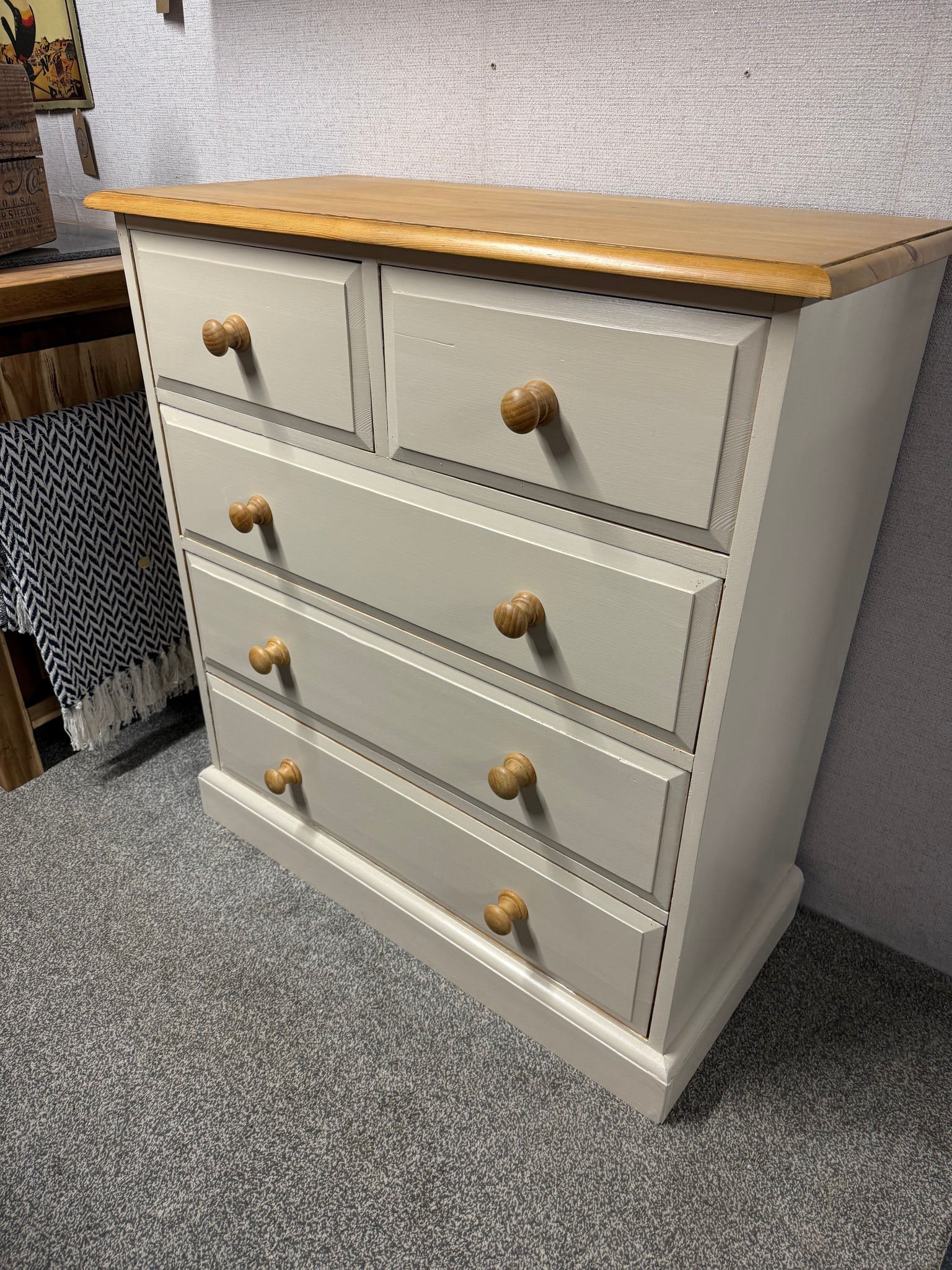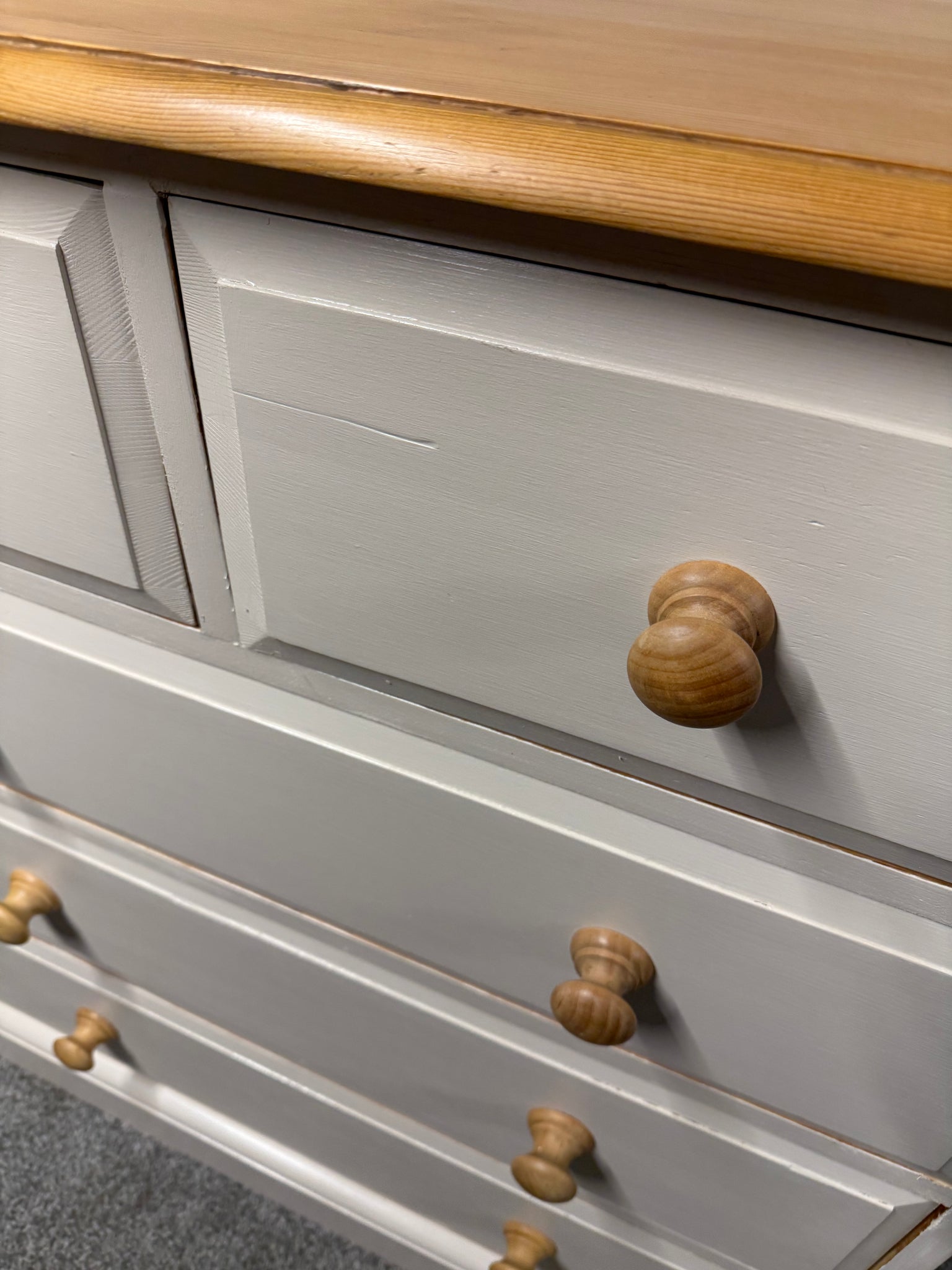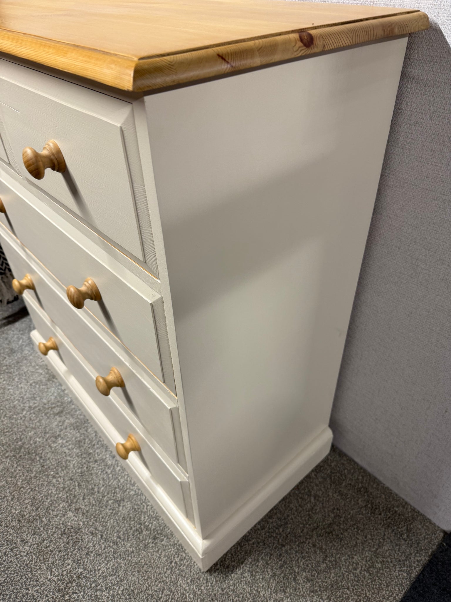 A charming solid pine chest of drawers that brings rustic character to any room. Featuring five generously proportioned drawers—two dovetail-jointed compartments above three spacious ones—this piece offers excellent storage versatility. The light beige painted base provides a soft, neutral foundation, while the natural waxed pine top showcases the wood's warm grain. Built to last with sturdy construction and in wonderful condition, it's a timeless addition to country-style interiors.