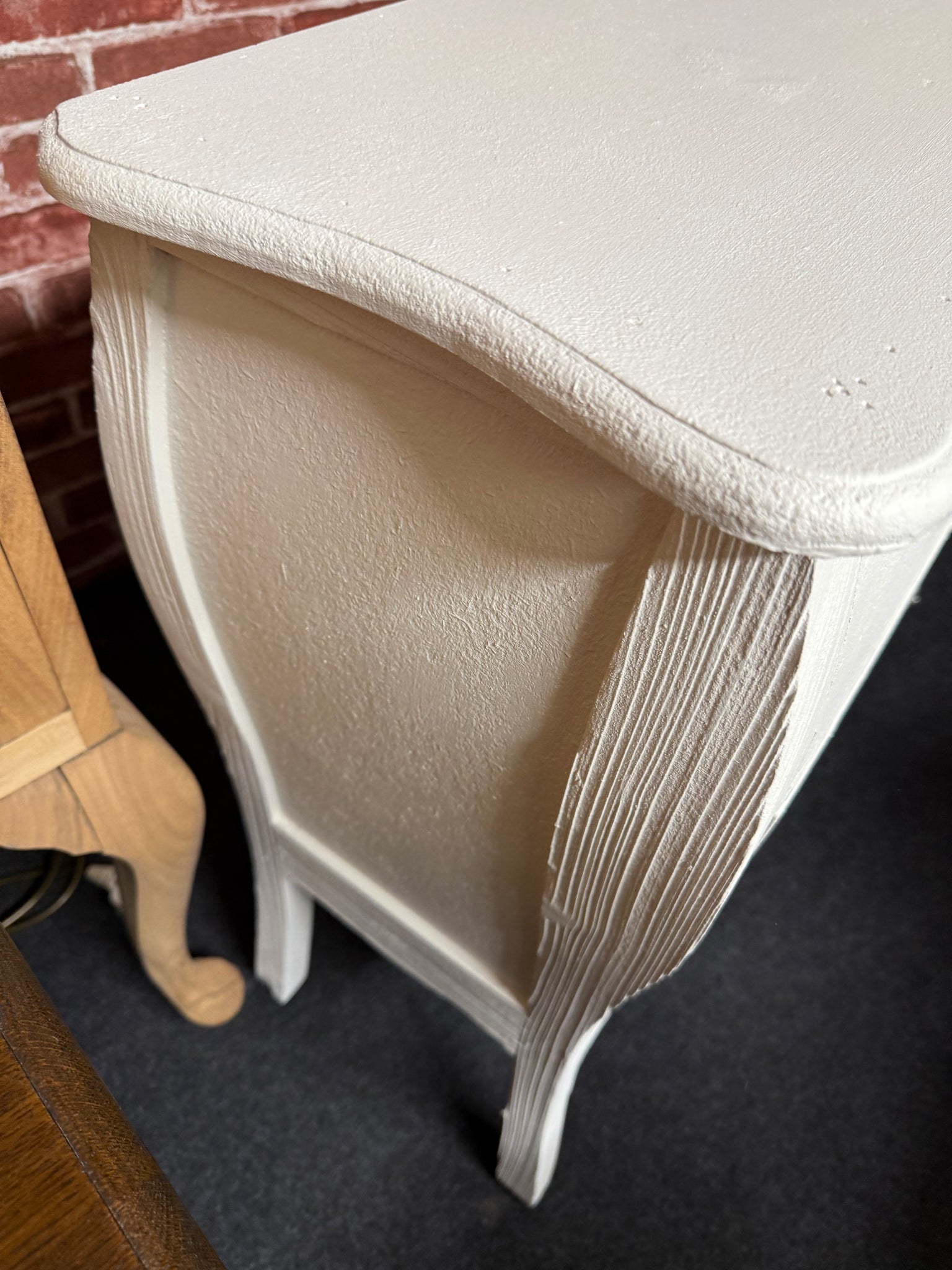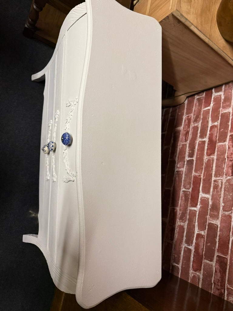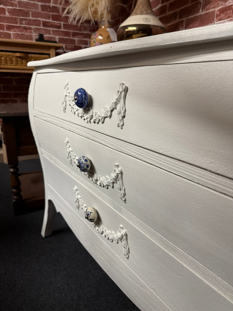 This charming small French-style chest of drawers is finished in a fresh, bright white. It is sturdy and well-maintained, featuring three spacious drawers ideal for storage. A delightful addition to a hallway or nursery.