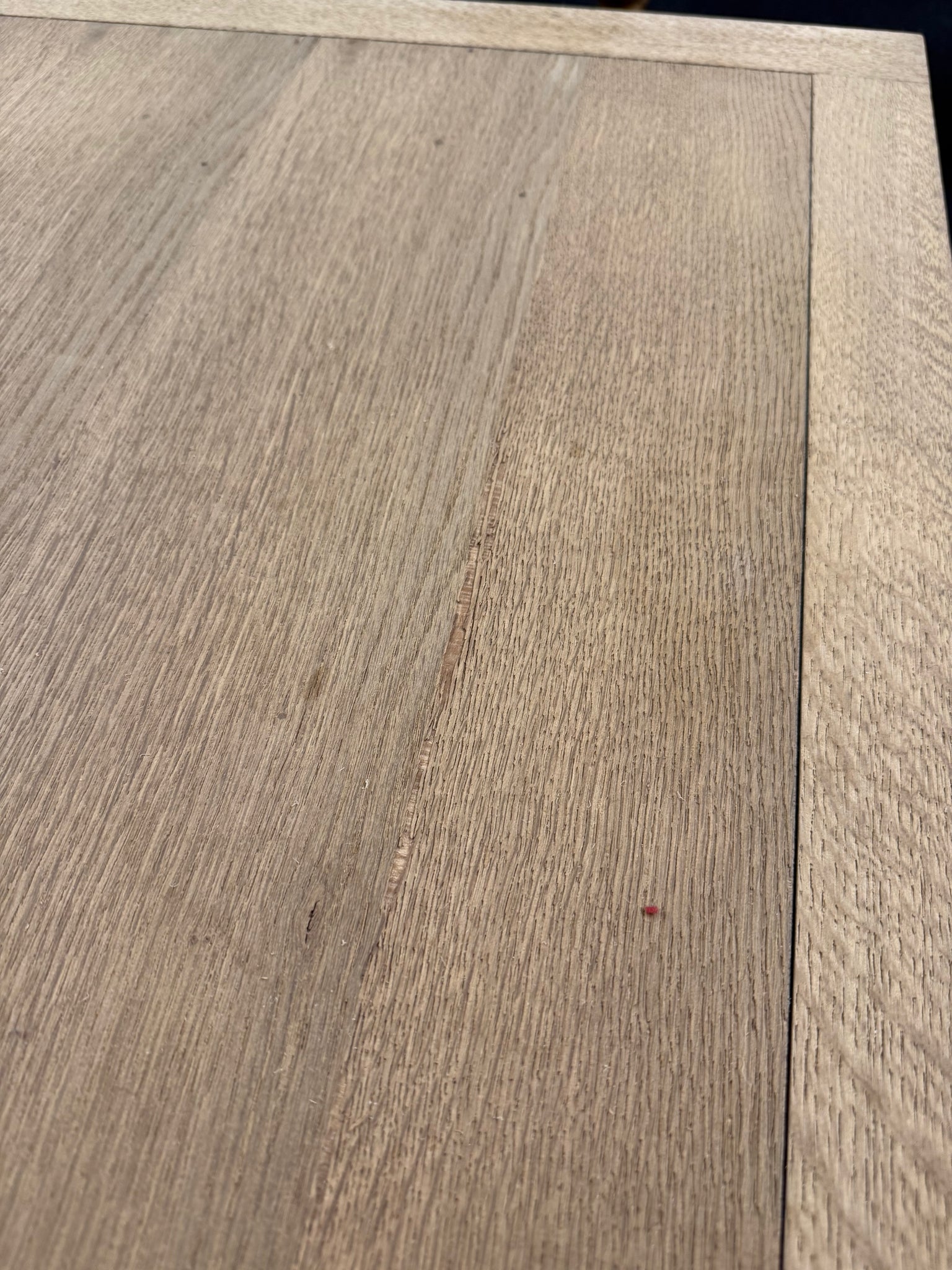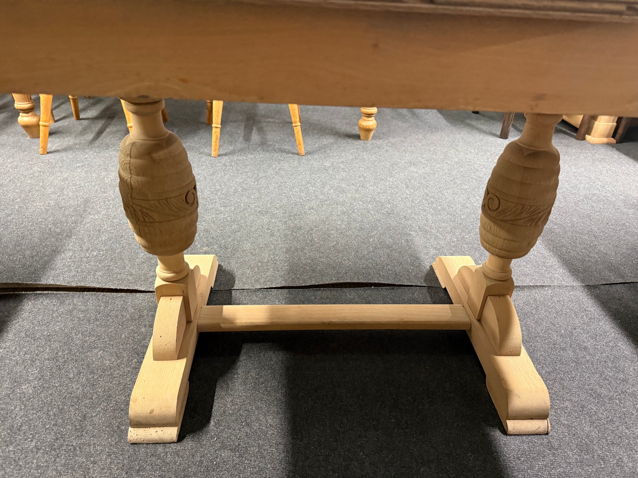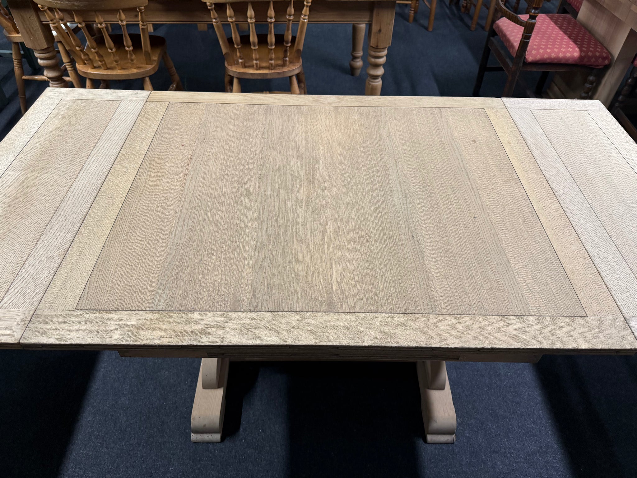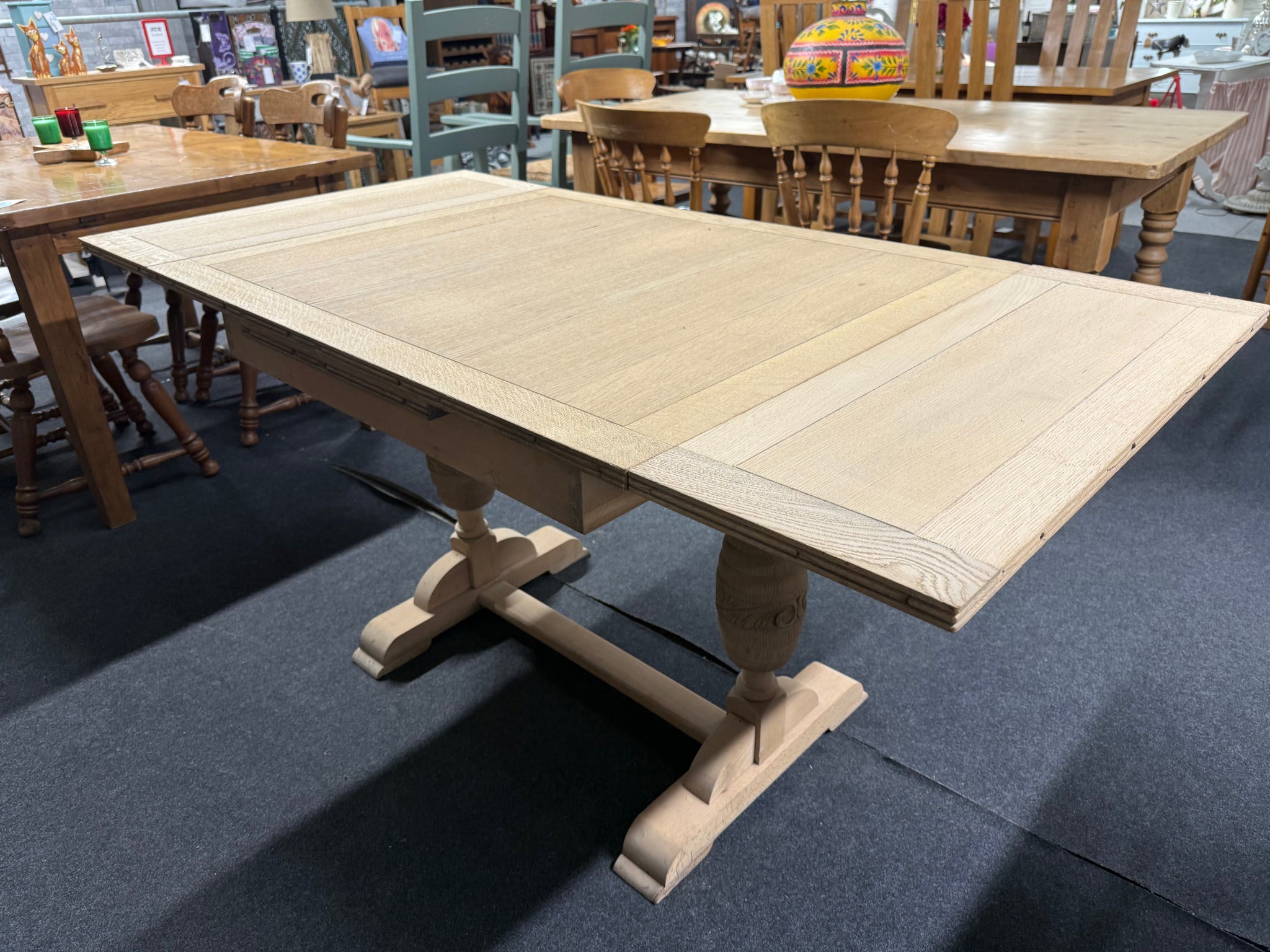 This beautiful extendable oak dining table is sturdy and generally well maintained. It has been stripped down, so a layer of wax might be needed to protect the surface. Although some veneer has peeled off the top, it doesn't impact its functionality. It comfortably seats 4 when closed and expands to fit 6-8 guests.