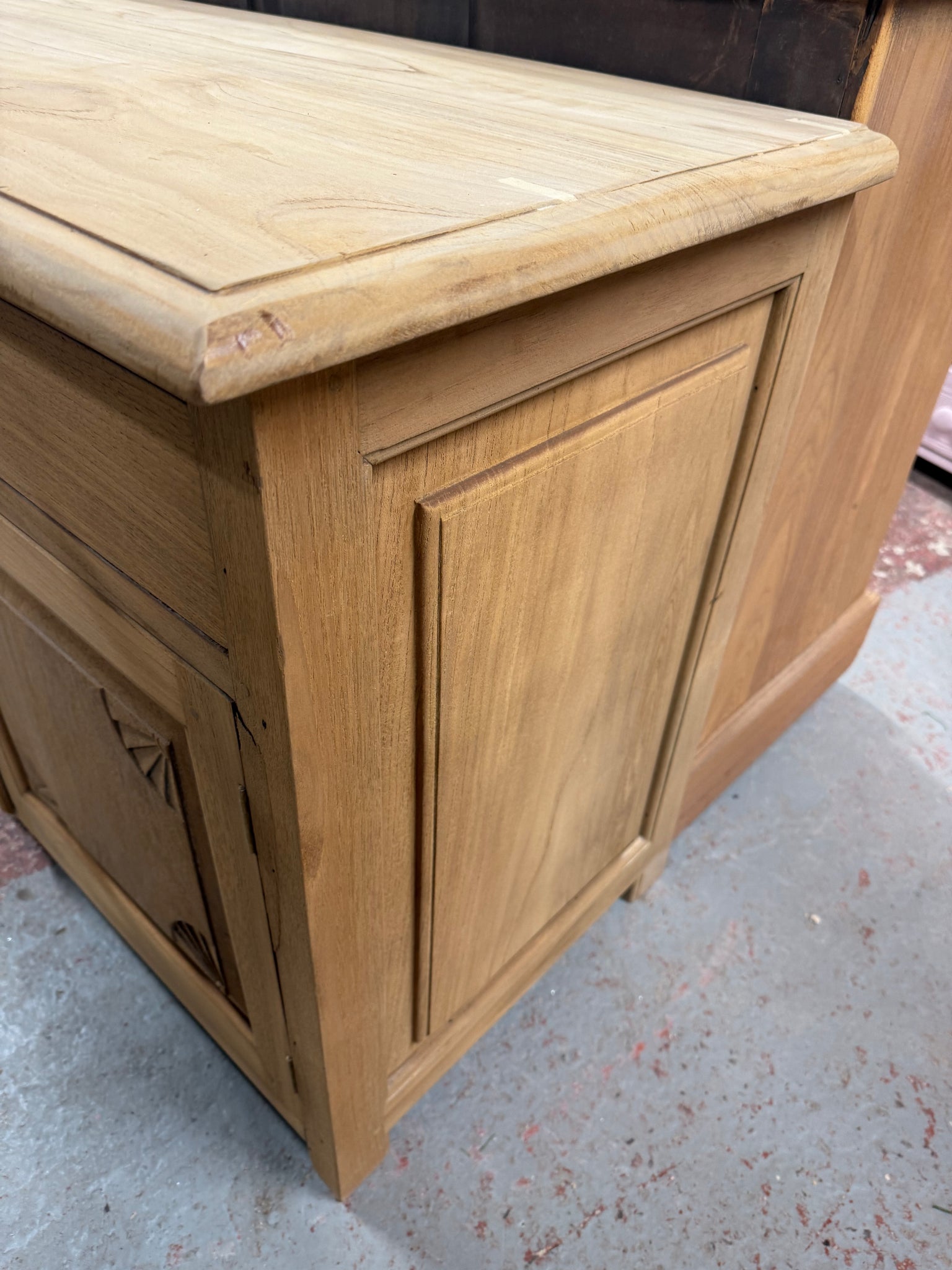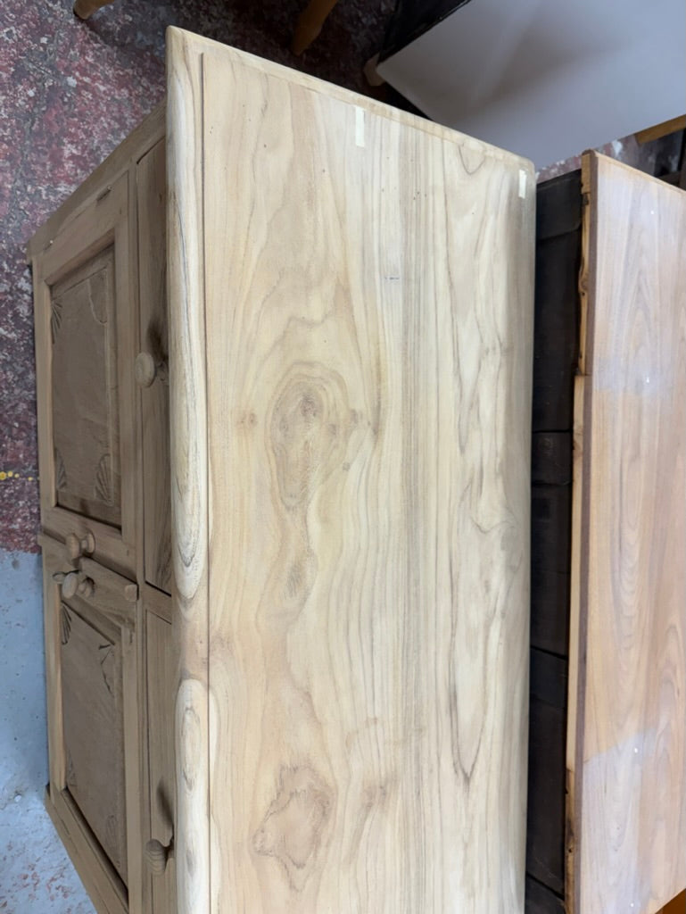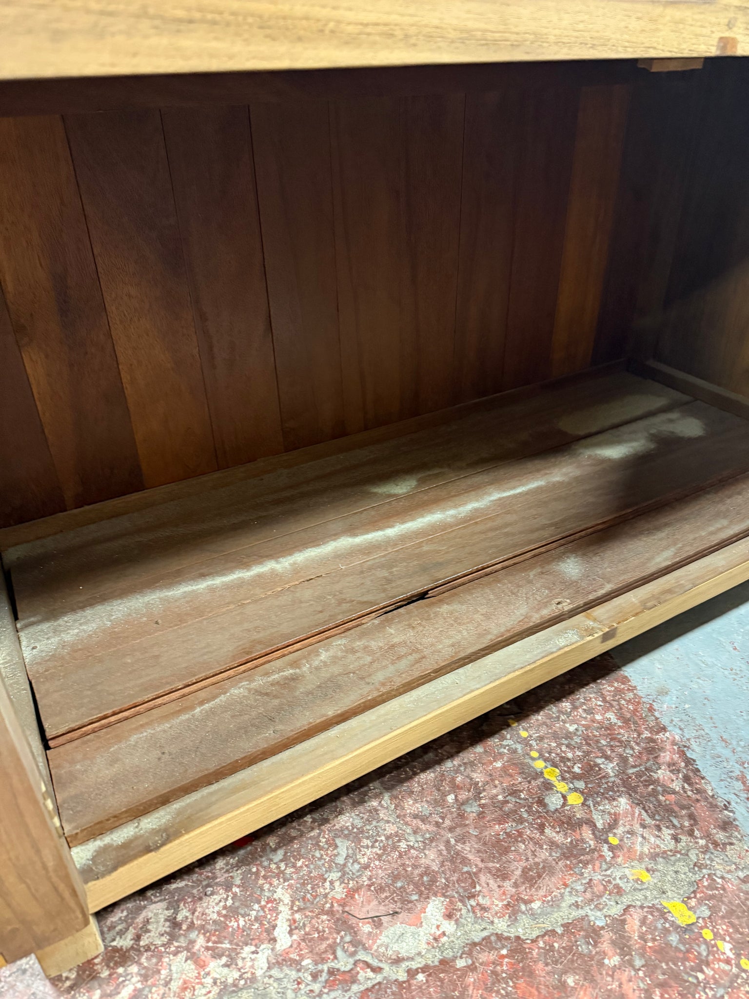 Discover the raw beauty of this exceptional hardwood sideboard, restored to reveal its authentic character and grain. With two elegantly crafted dovetail drawers positioned above a spacious double cupboard, it offers generous storage while celebrating the wood's natural finish. A protective wax coating will enhance its lustre and durability, making it a timeless addition to any room.