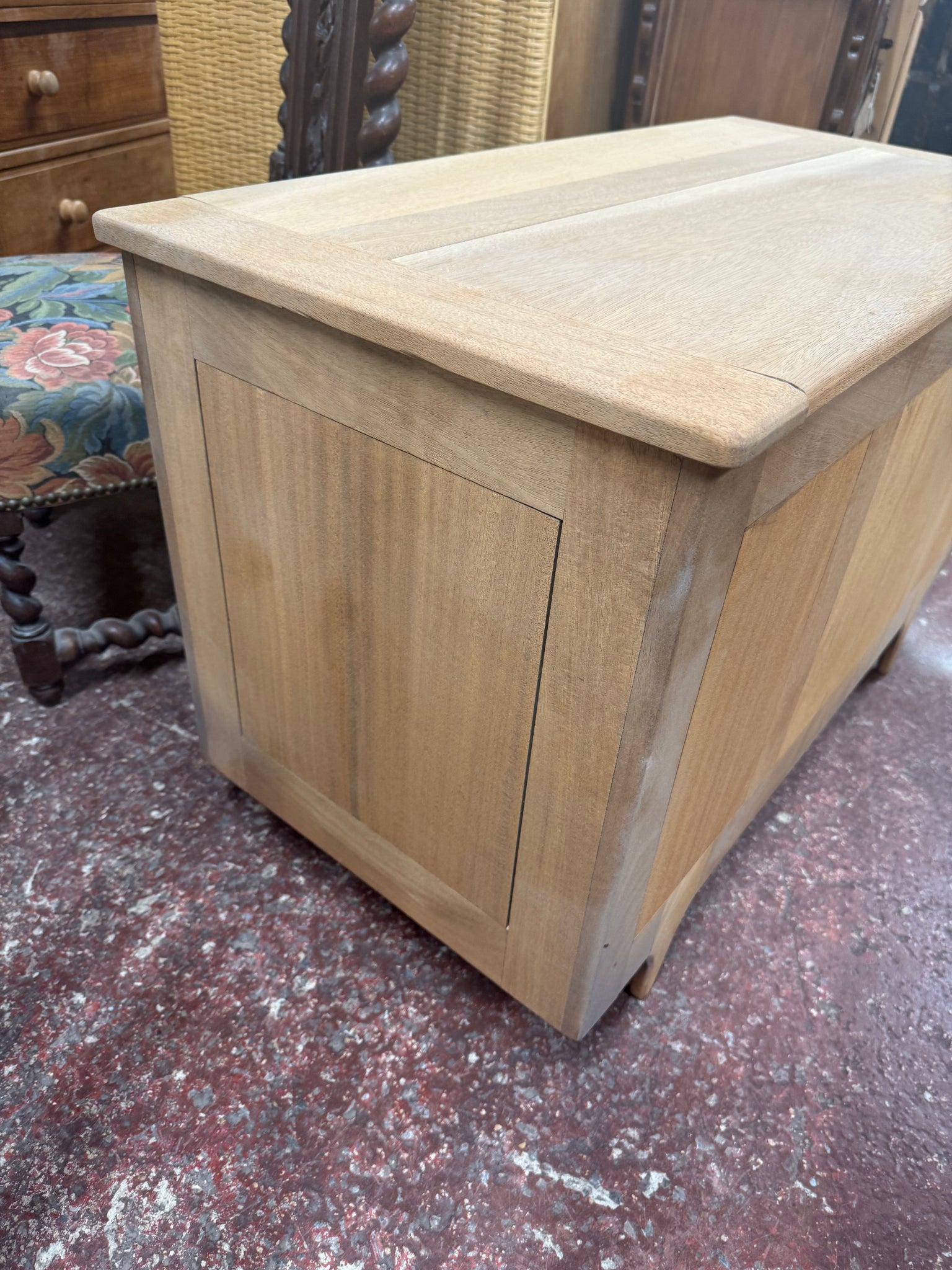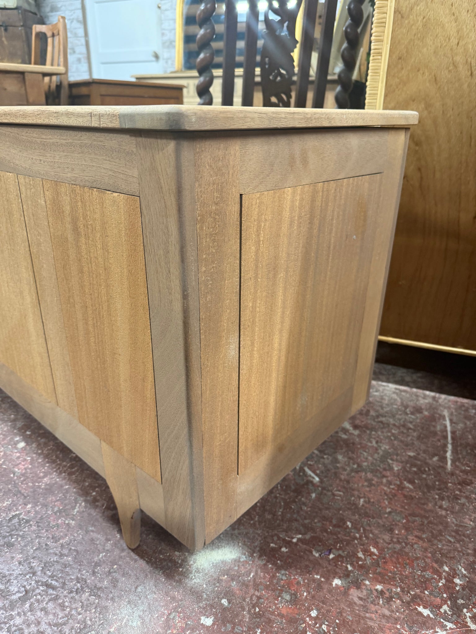 This charming retro teak blanket box has been restored to its original natural finish and might benefit from a coat of wax to keep it protected. Its natural style fits beautifully into any room, and the lid opens to reveal generous storage space.