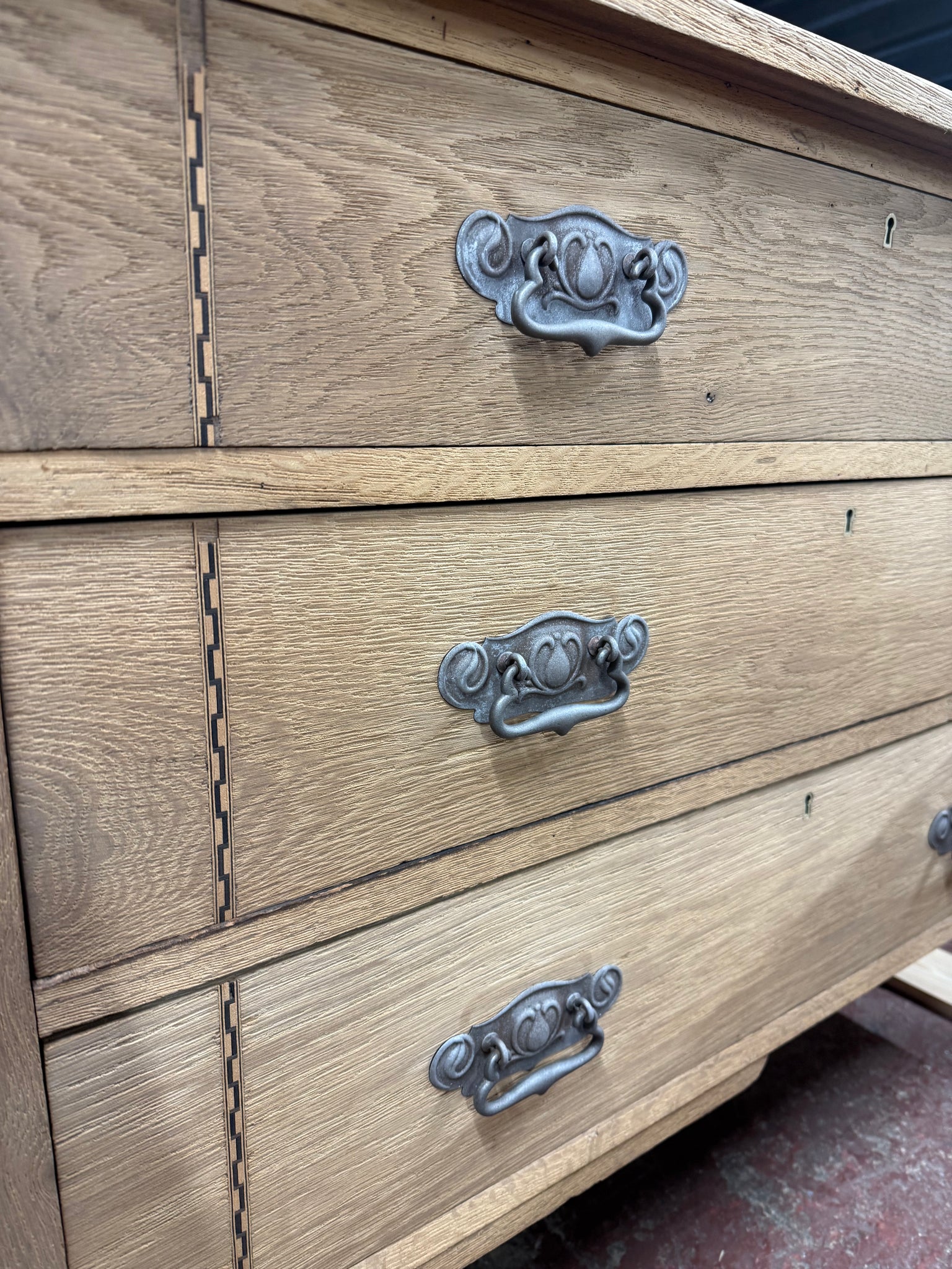 A beautiful Art Nouveau oak chest of drawers, stripped back to reveal its natural grain and character. Three spacious dovetail-jointed drawers provide generous storage. Structurally sound and in excellent condition. The bare wood finish showcases authentic craftsmanship and allows you to personalise with your choice of wax or oil for protection.