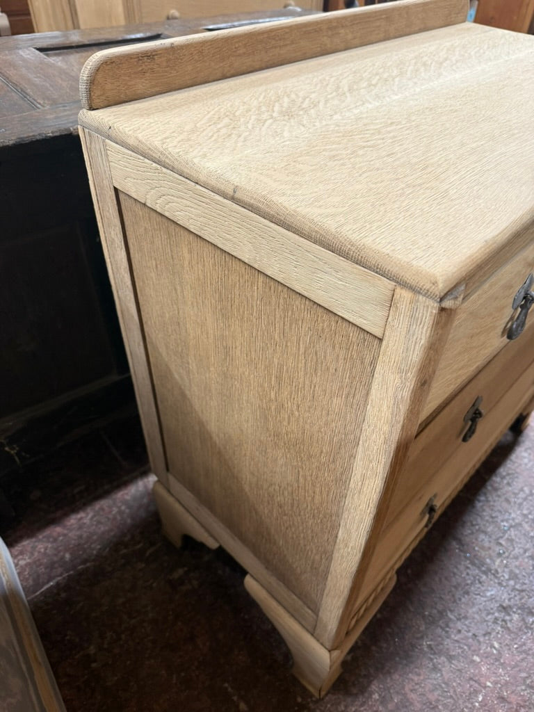 This oak chest of drawers has been stripped back to reveal its natural wood surface, showcasing authentic grain and character. Three spacious drawers feature traditional dovetail joinery, ensuring durability and smooth operation. The unfinished state allows you to customize the final look—apply wax for a natural sheen, stain for deeper colour, or leave as is for a rustic aesthetic.