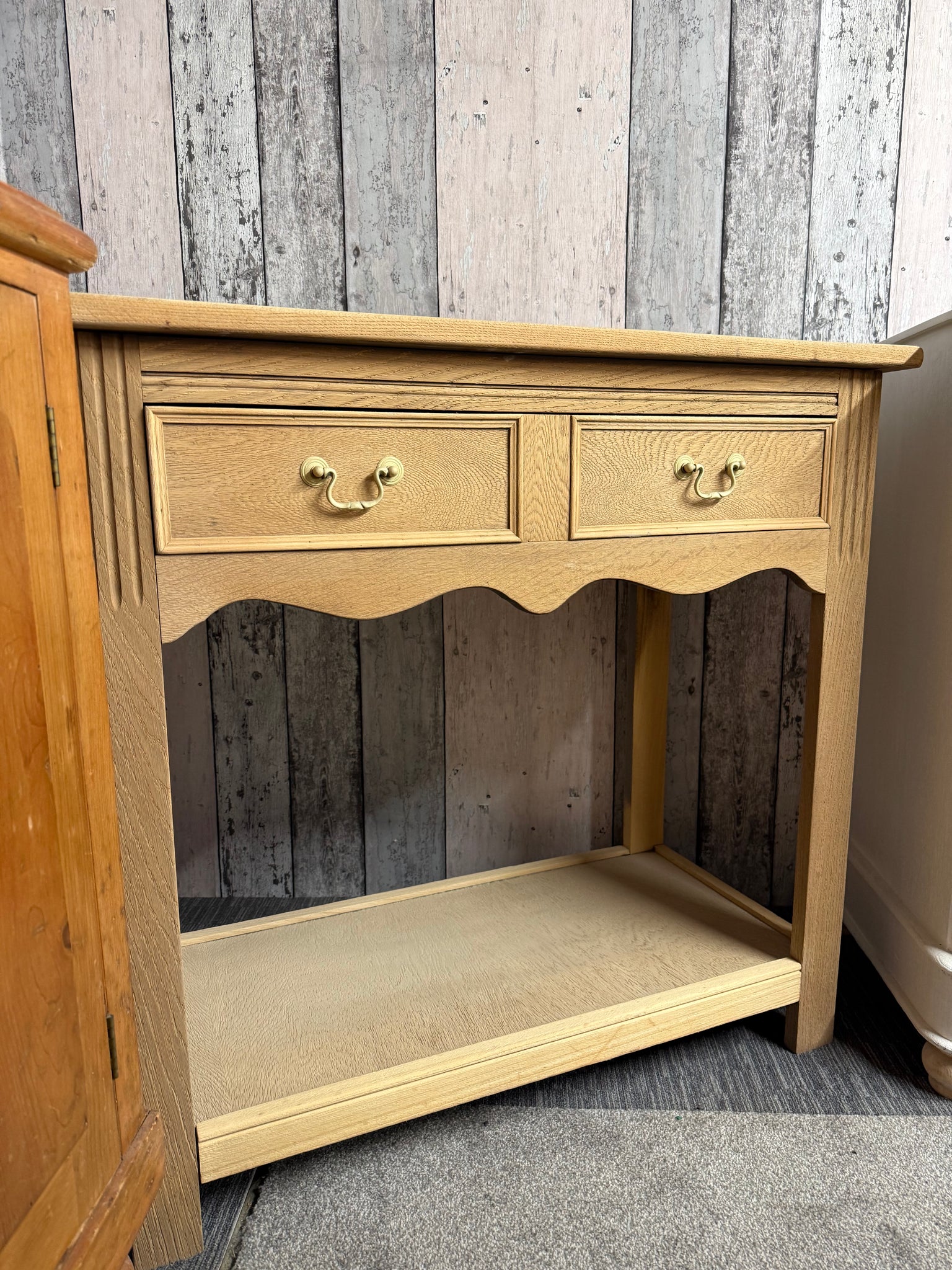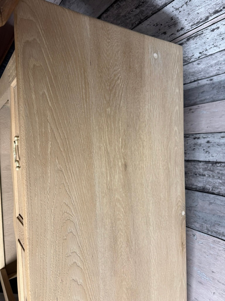 This beautiful stripped oak hall table showcases the wood's natural grain and character. Featuring traditional dovetail joinery, it includes a spacious drawer and lower shelf for practical storage. The bare wood finish allows you to personalise the look with your choice of stain or wax, making it a versatile addition to any hallway or entryway.