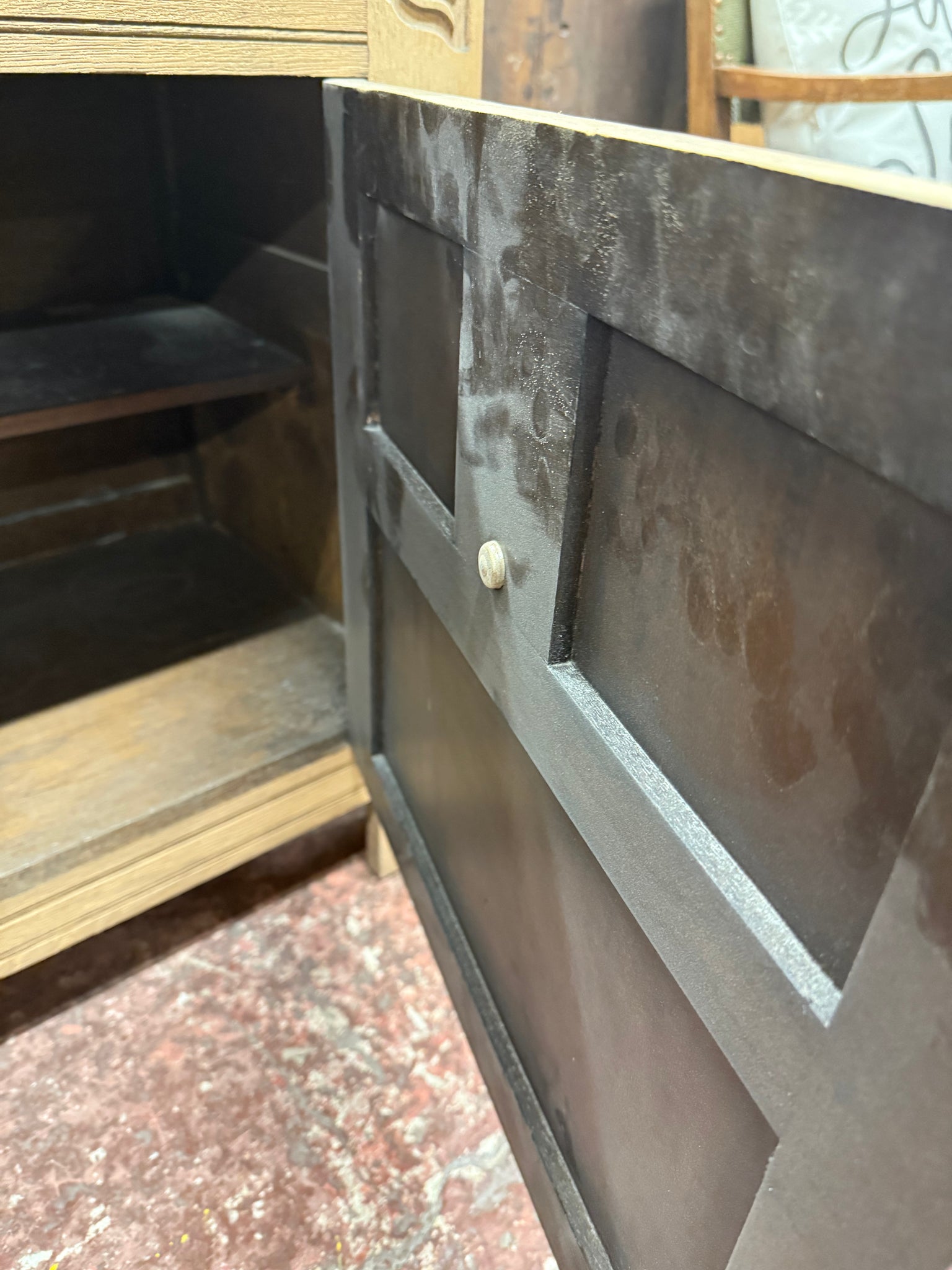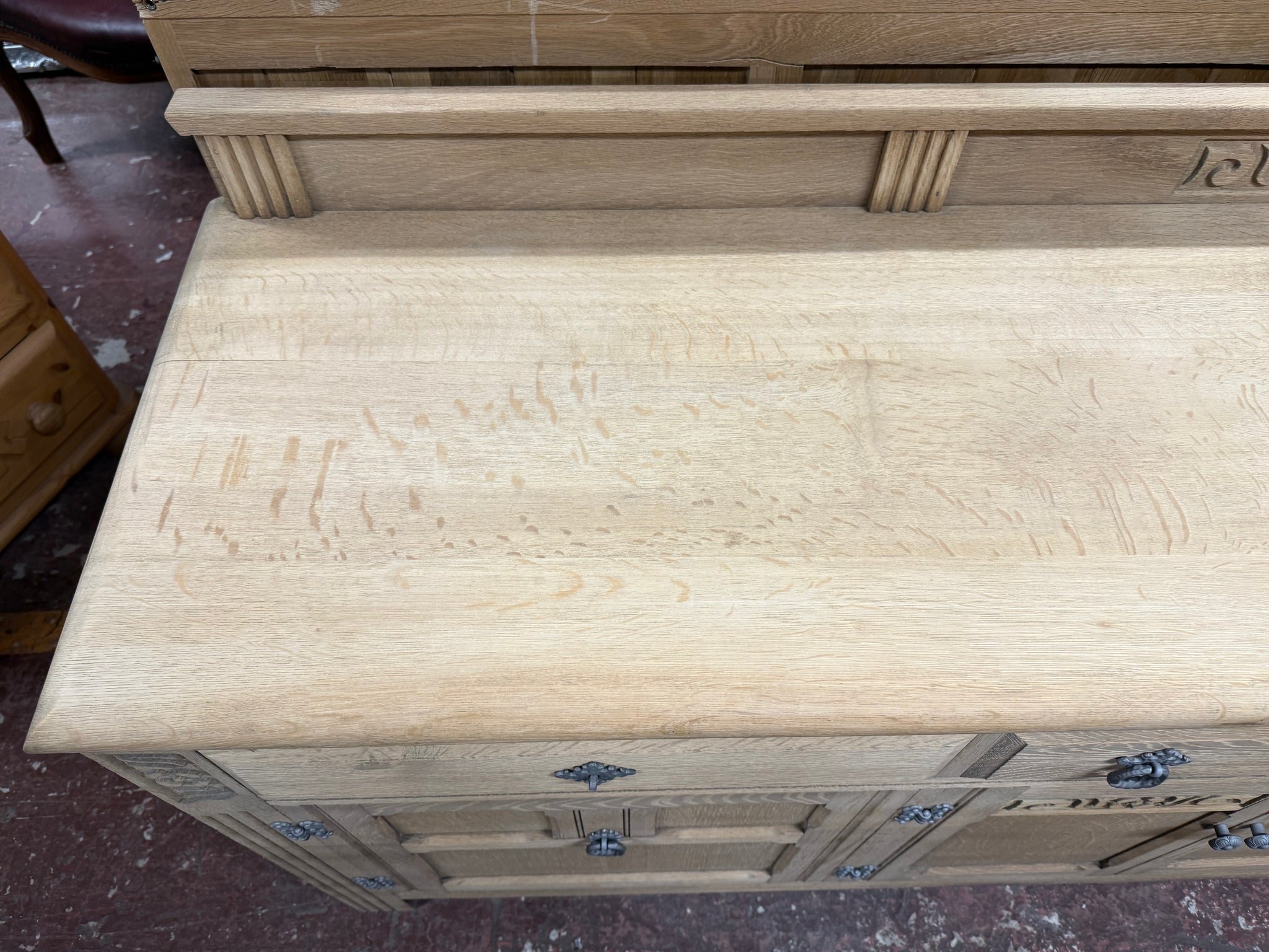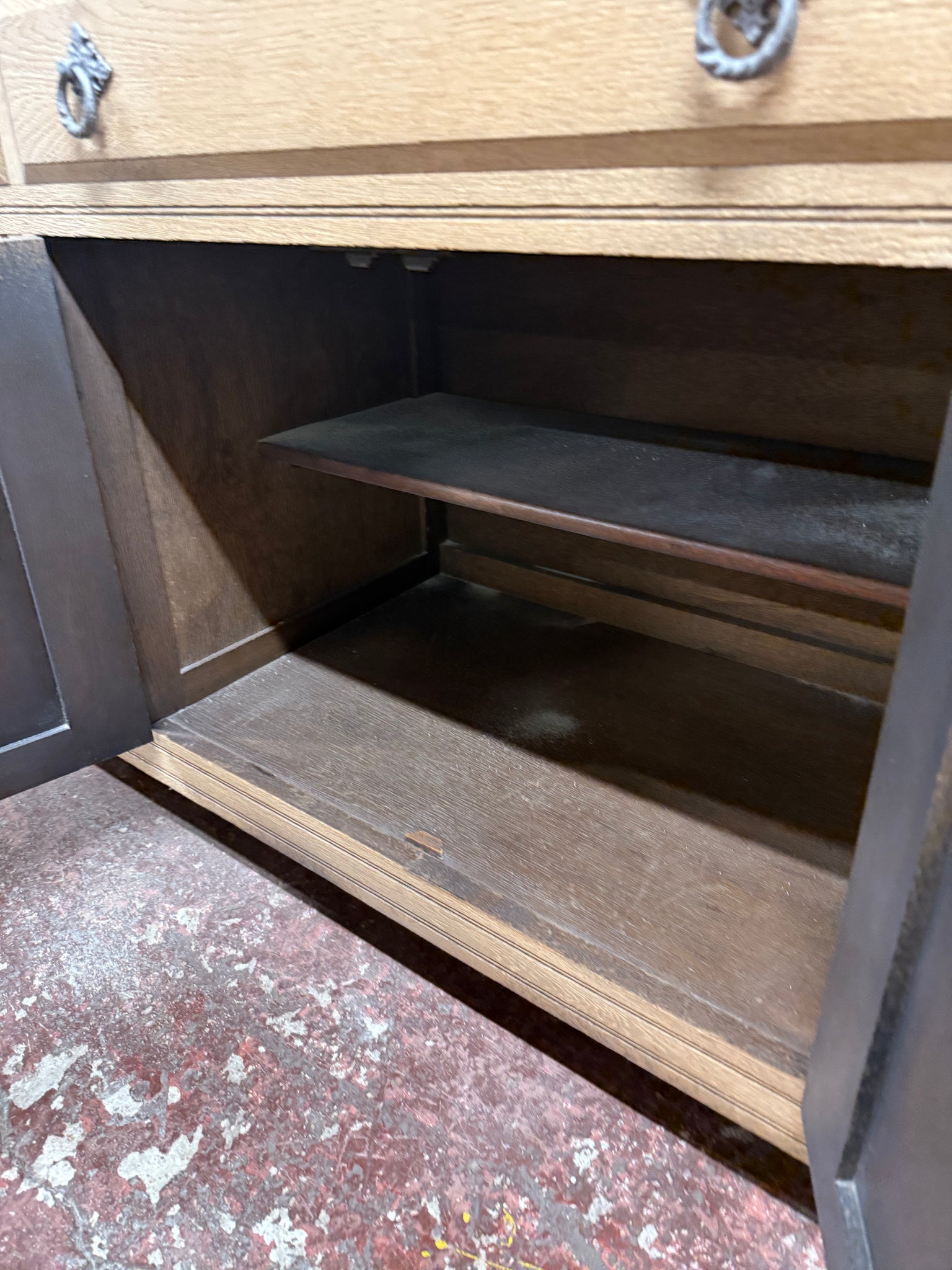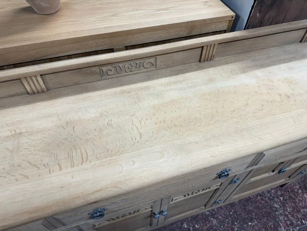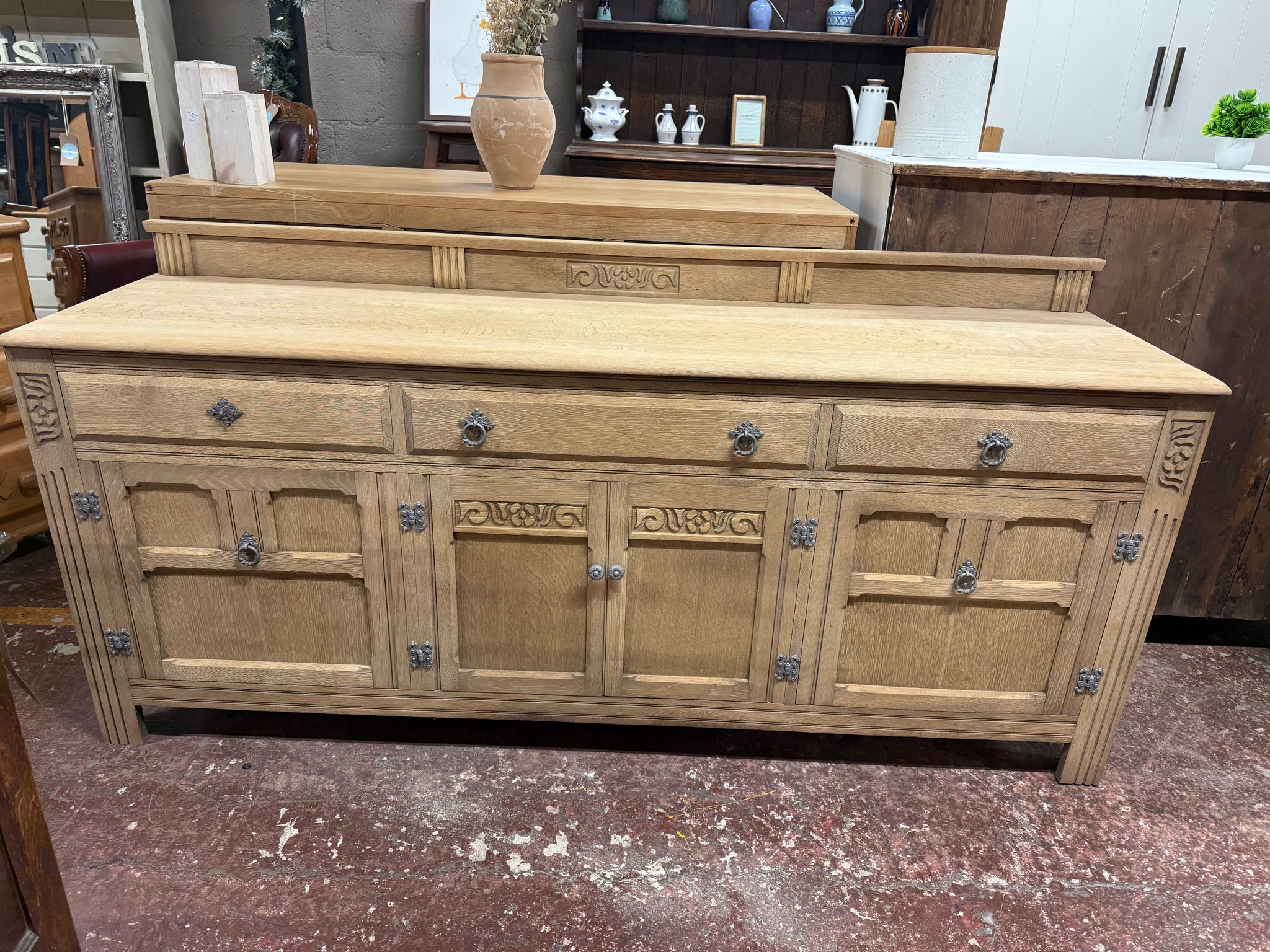 Crafted from oak, this sideboard showcases beautiful natural grain after being stripped to bare wood—ideal for those seeking an authentic, unfinished aesthetic. A protective wax finish is recommended to enhance durability. The piece offers generous storage through three dovetail-jointed drawers positioned above three enclosed cupboards, making it practical for any room. Overall condition is excellent, though one handle requires replacement. A versatile addition to period or contemporary interiors alike.
