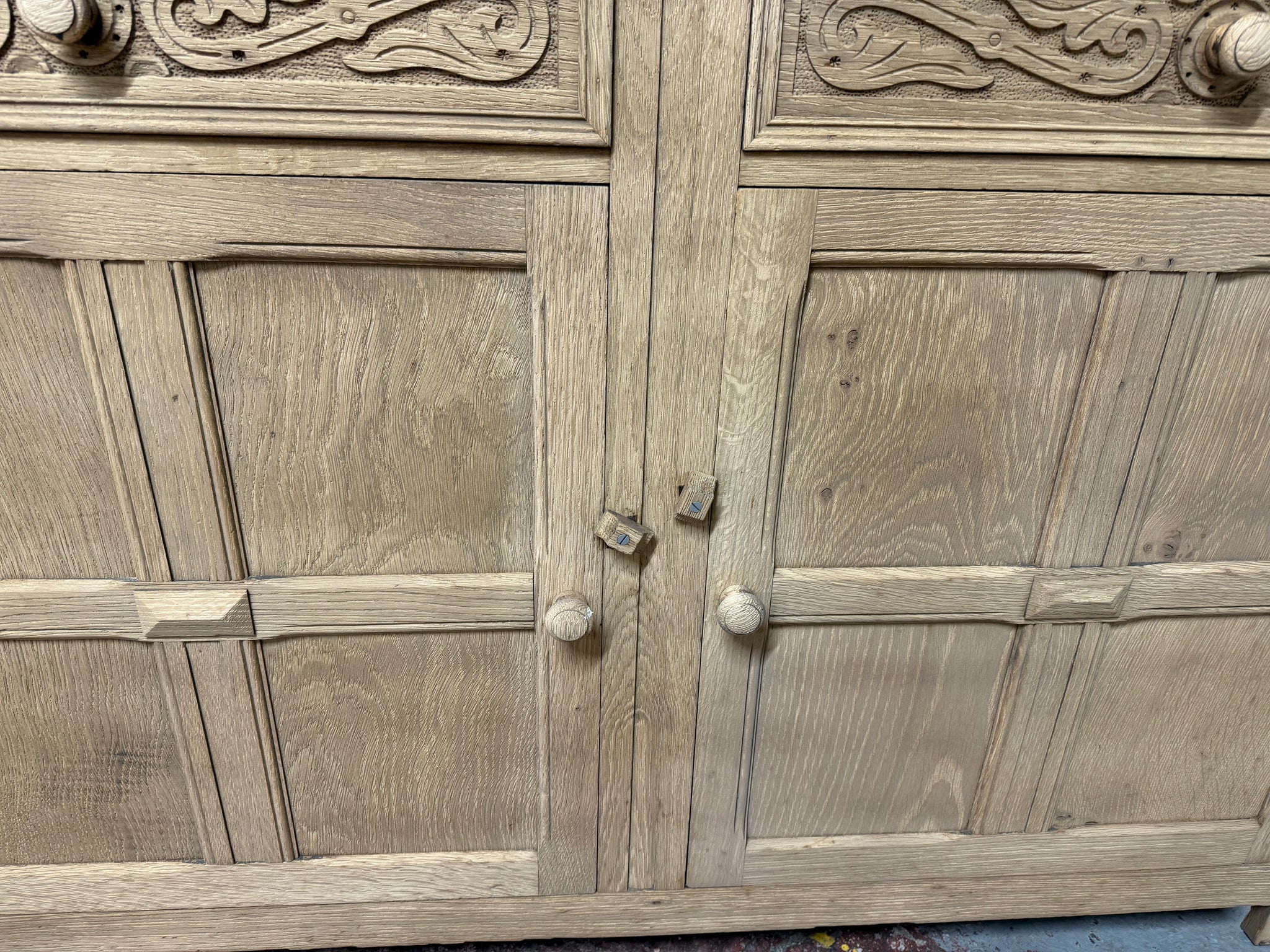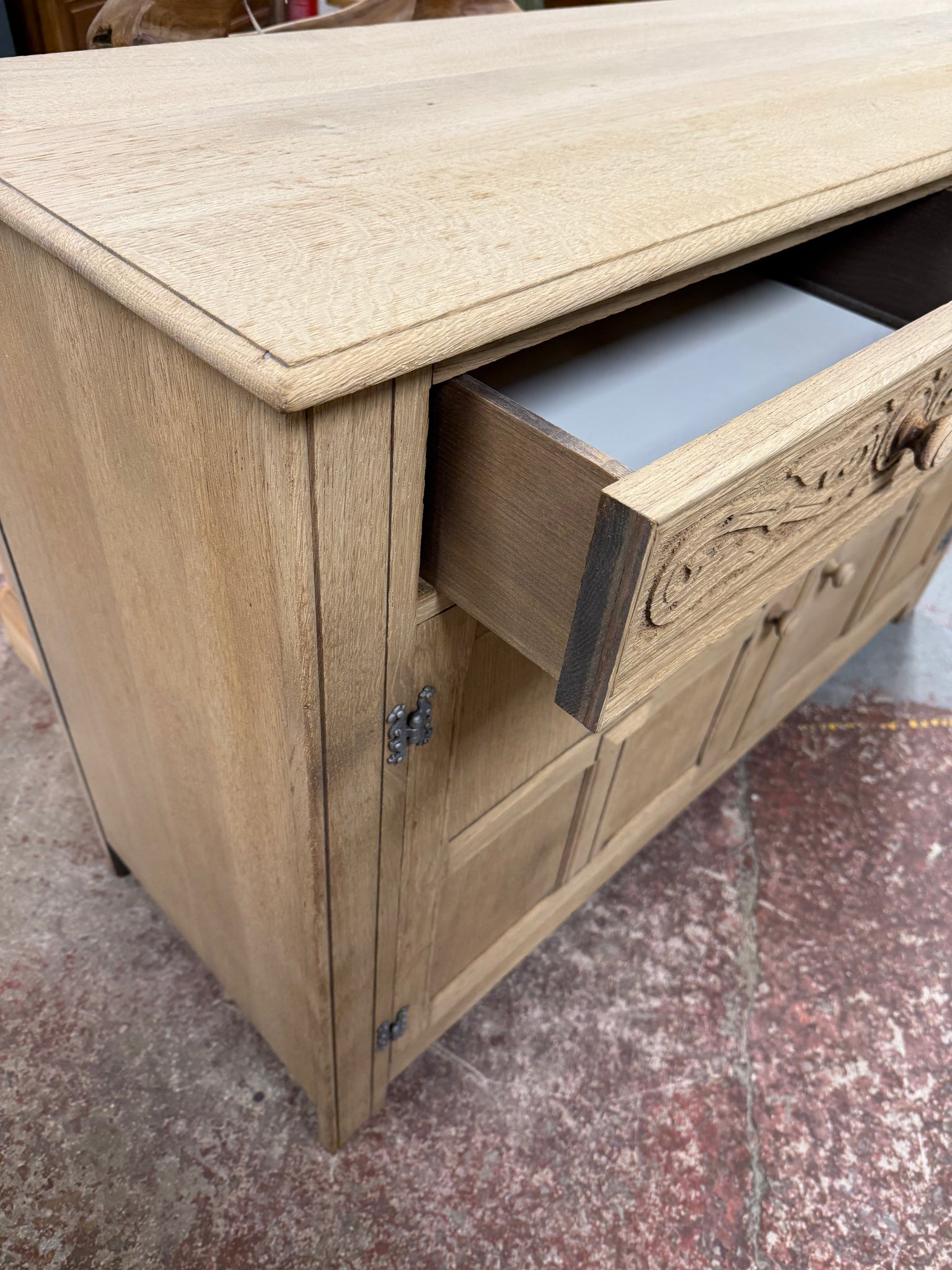 Discover the natural beauty of this stripped oak sideboard, revealing the wood's authentic grain and character. Structurally sound and ready for finishing, it's an ideal canvas for personalisation with wax or your chosen protective coating. Featuring carved drawers that add distinctive charm, this piece combines practical storage with timeless appeal. Two shallow drawers sit above a spacious double cupboard, offering ample room for your belongings. A versatile addition to any home, perfect for those who appreciate quality craftsmanship and vintage character.