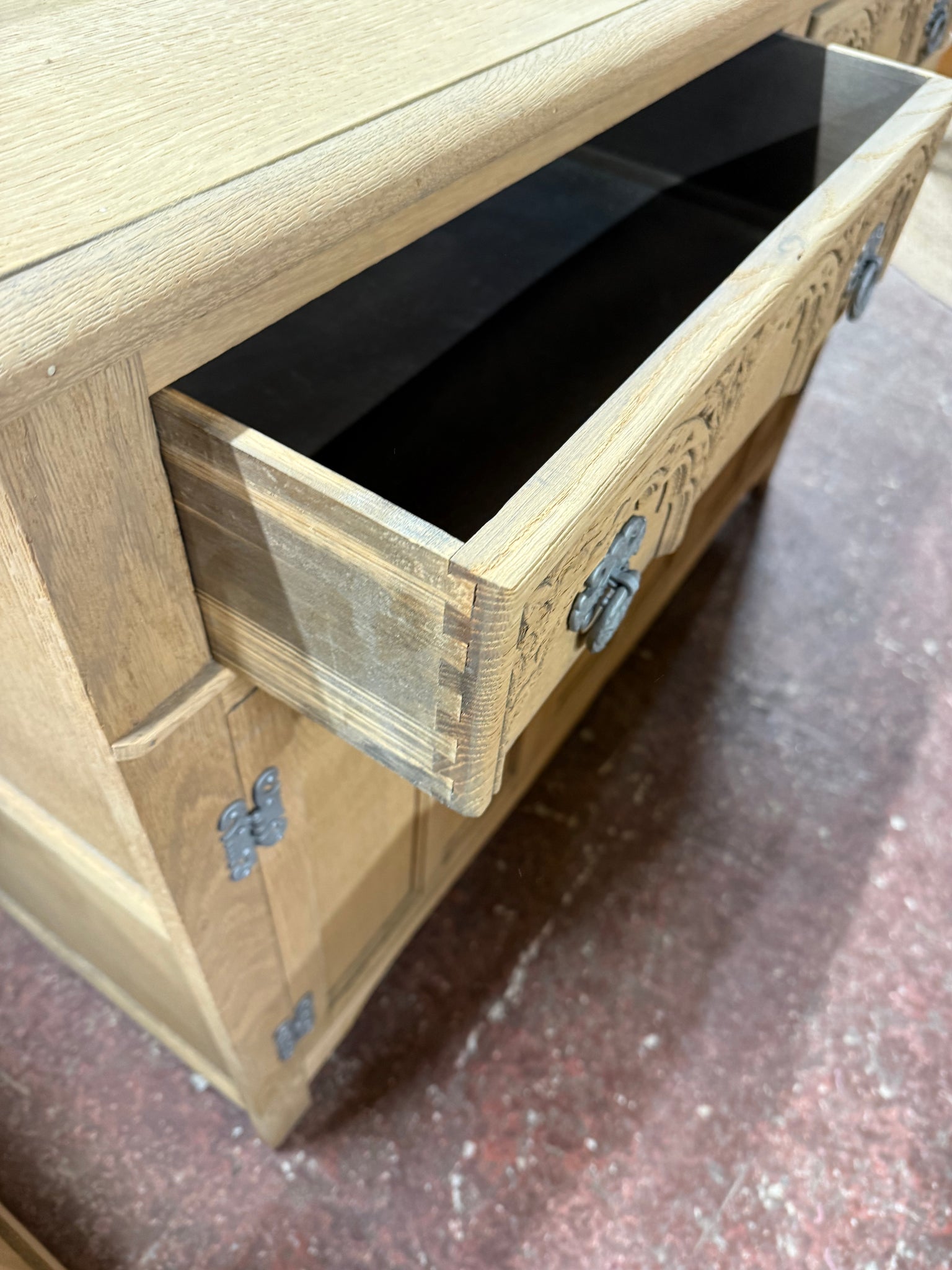 Discover the natural beauty of this stripped oak sideboard, revealing the wood's authentic character and grain. Featuring intricately carved drawer fronts that serve as a striking focal point, this piece combines form with function. Two dovetail-jointed drawers sit above spacious cupboards, offering versatile storage solutions. Structurally sound and well-maintained, it's ready to enhance any room. A protective coat of wax will help preserve its finish and bring out the wood's warmth.