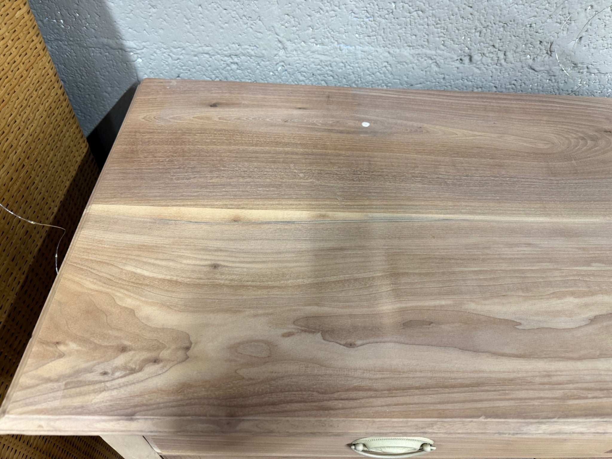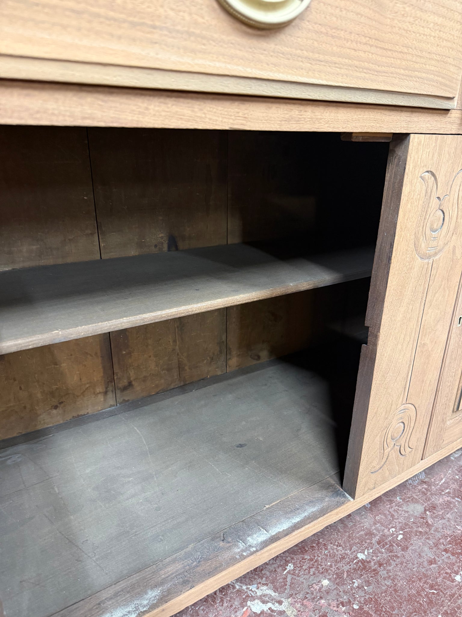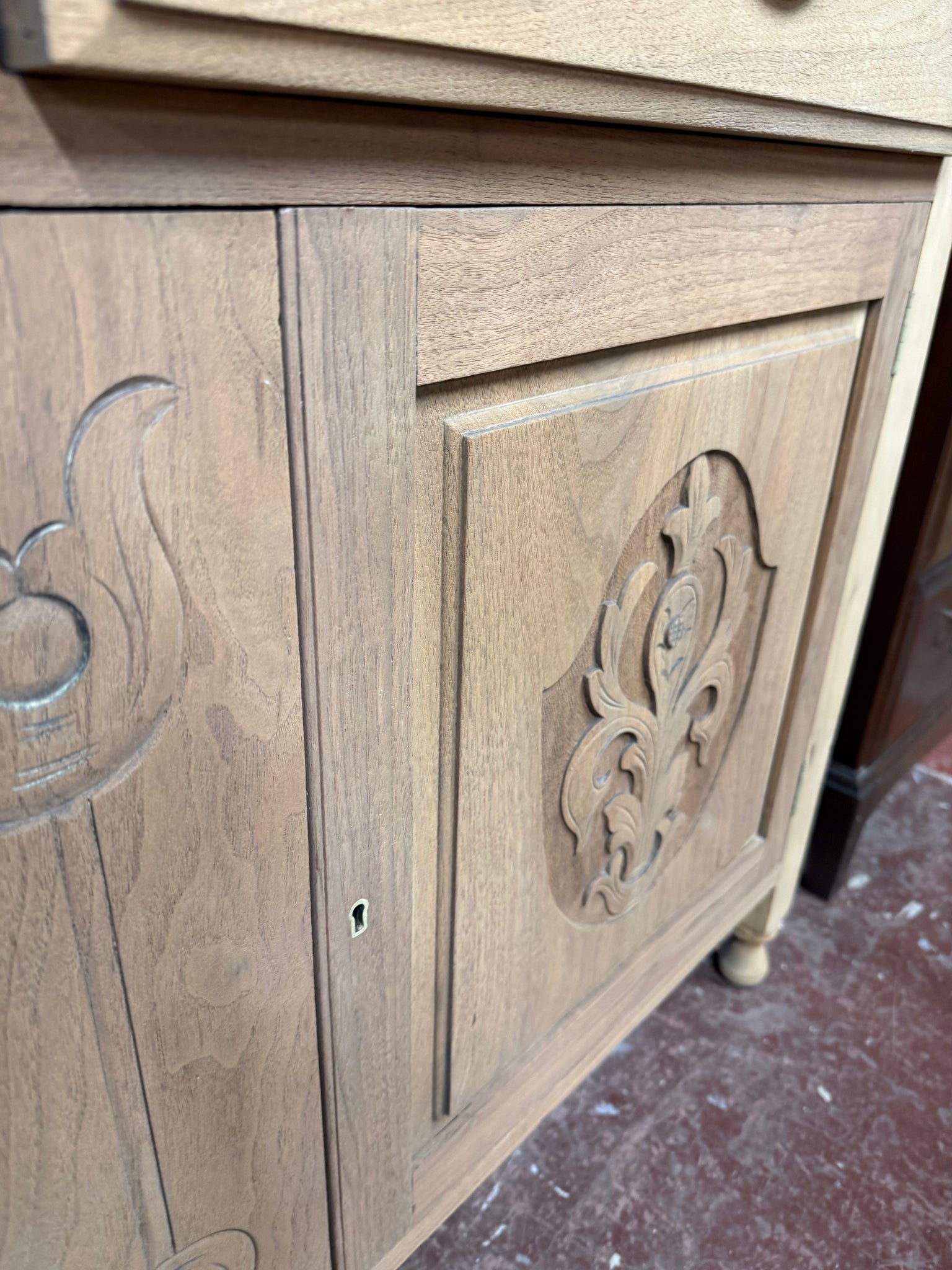 A beautiful satinwood sideboard restored to bare wood, revealing the natural grain and character of the wood. The piece shows authentic patina with minor surface marks and a crack to one side—testament to its age and heritage rather than any structural concern. Practical storage combines two dovetail-jointed drawers with a spacious double cupboard below. The stripped finish offers flexibility: leave as is for a rustic aesthetic, or apply wax or oil to enhance colour and provide a protective layer. An excellent choice for those who appreciate vintage furniture with genuine provenance.