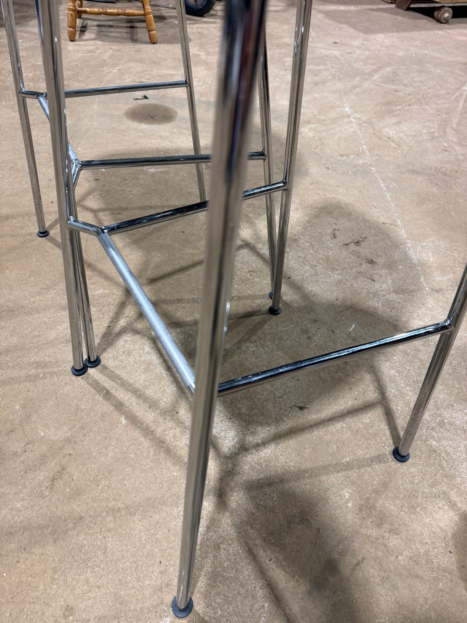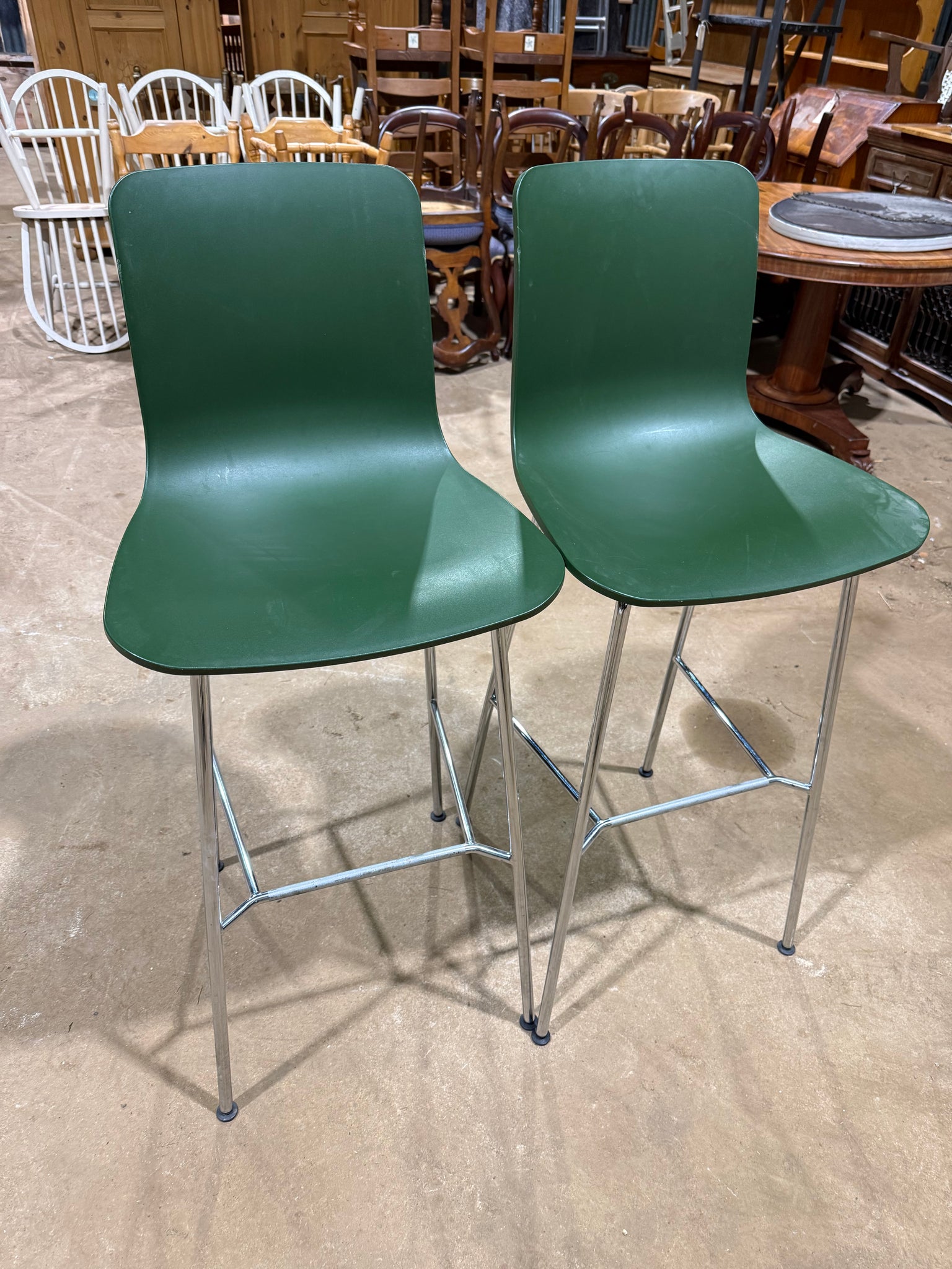 A matching pair of green stools in solid working order, showing only light cosmetic wear consistent with use. Ideal for positioning at a kitchen counter or breakfast bar, these practical seating pieces combine functionality with understated colour that complements most interiors.