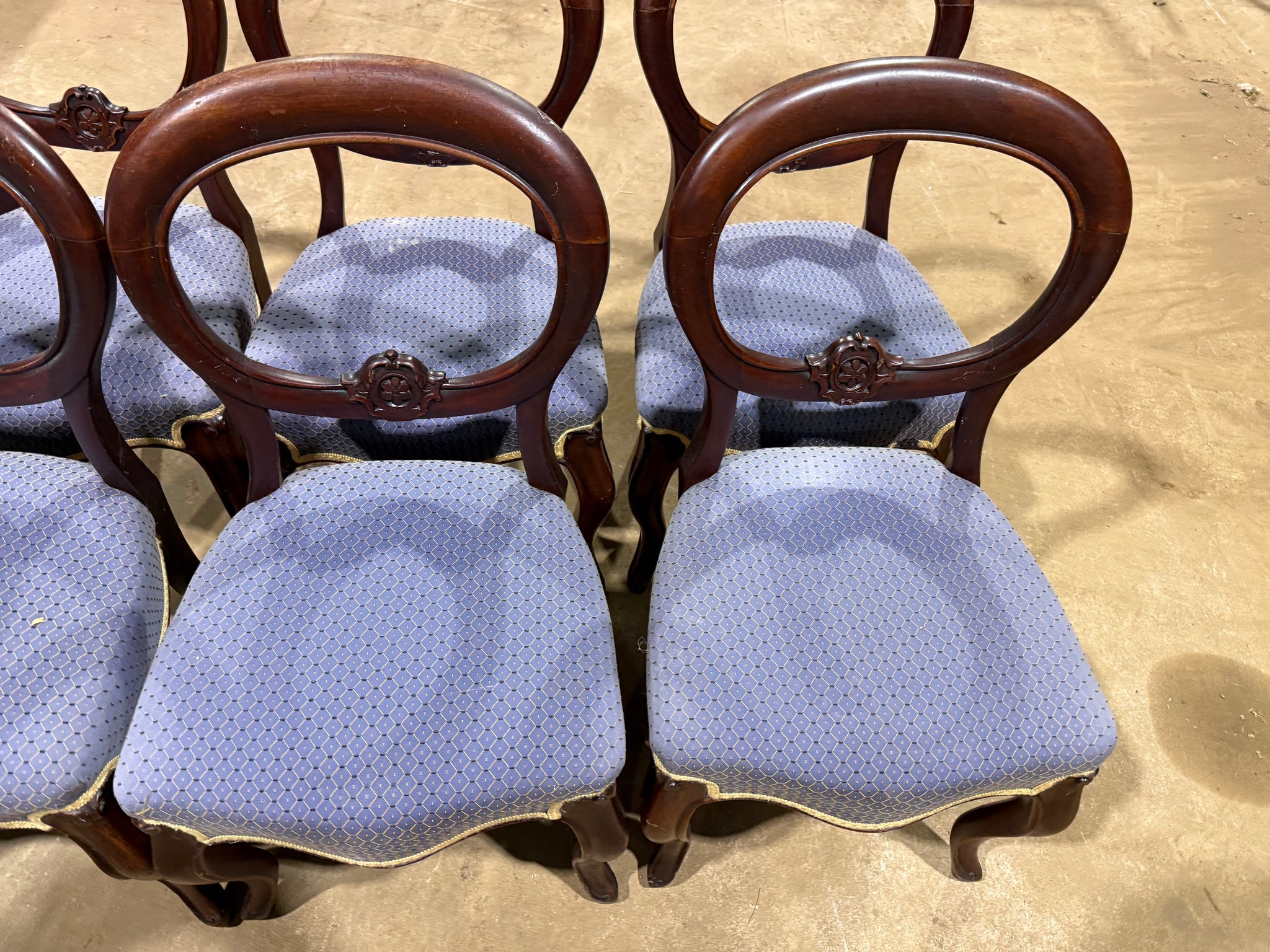 A collection of 8 mahogany balloon back chairs, each structurally reliable and ready to use. Light surface marks reflect their history, but nothing detracts from their functionality or appeal. These pieces suit anyone drawn to refined, traditional furniture with genuine vintage character.