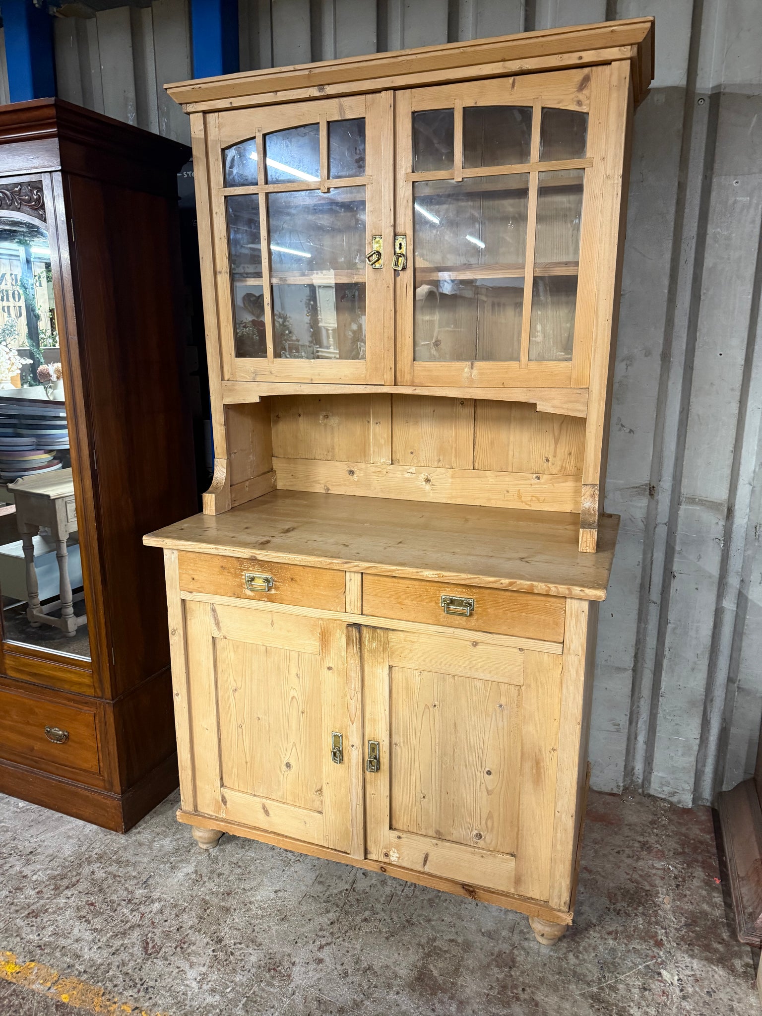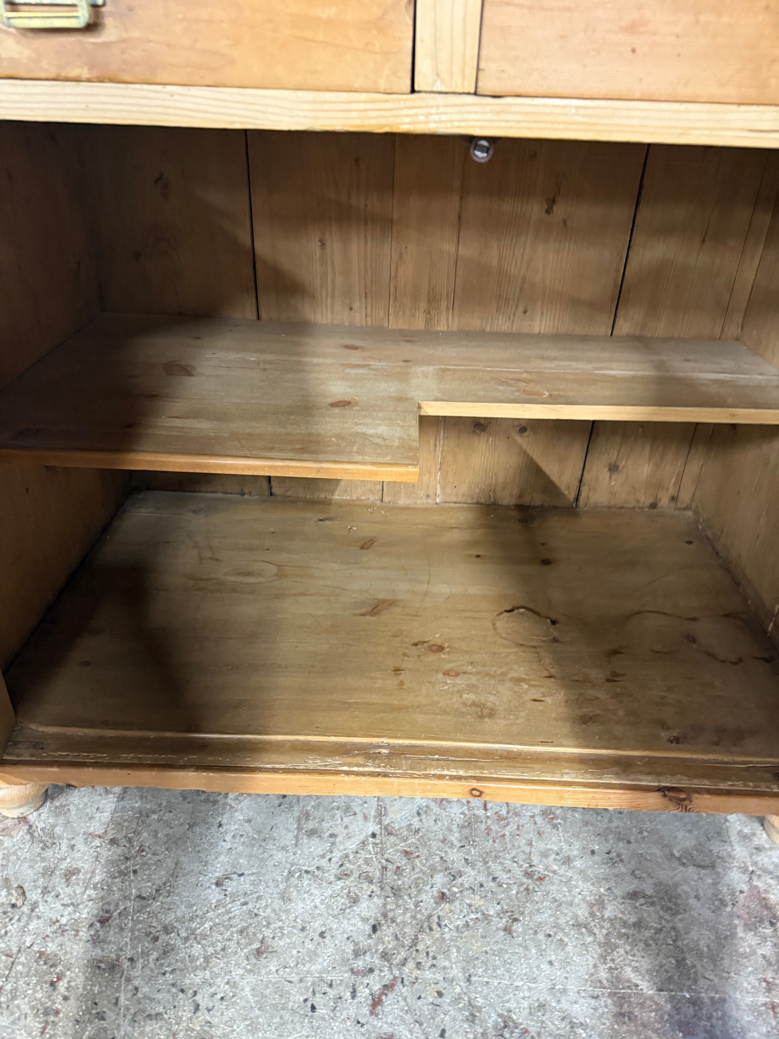 A beautiful antique pine dresser that combines practical storage with timeless charm. Featuring a spacious upper section with two shelves, two expertly crafted dovetail-jointed drawers, and a generous double cupboard below, this piece offers plenty of room for your treasures. The dresser is in solid condition and splits into two sections for convenient transport and placement. A wonderful addition to any home seeking character and functionality. There are some age related marks and the shelf has been cut but this does not affect its use.