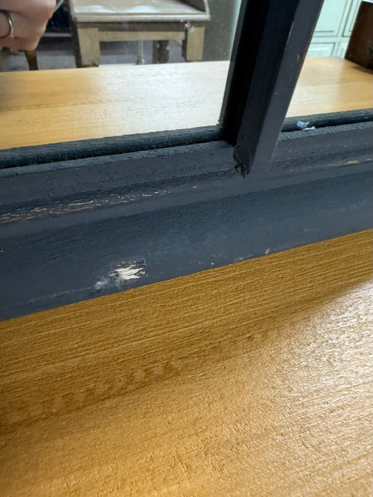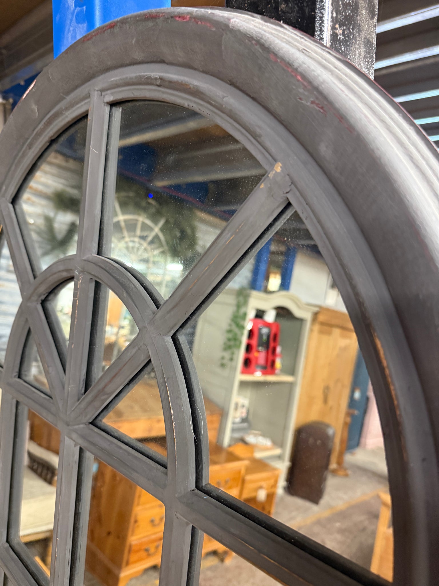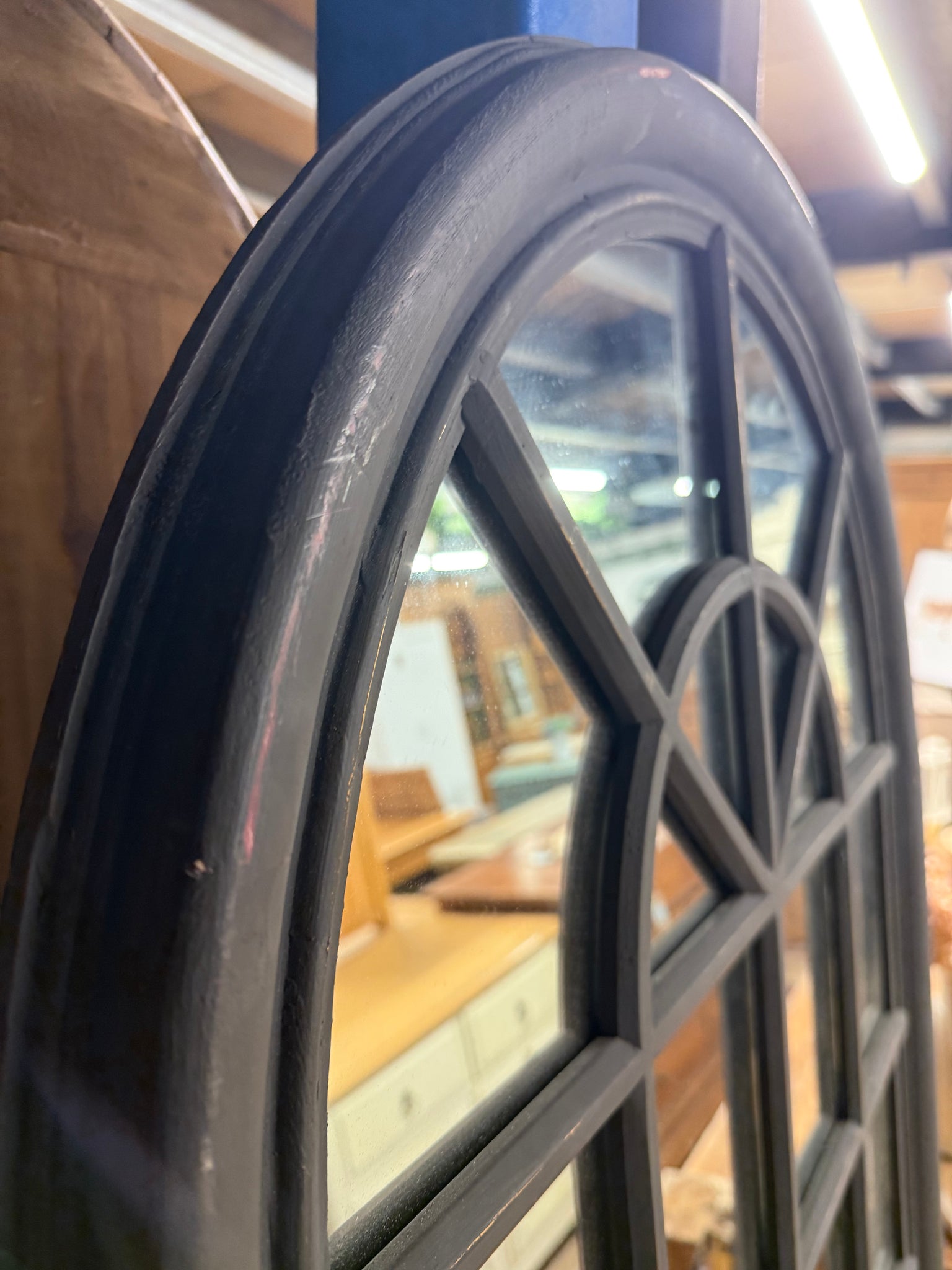 This beautiful arch mirror features a matte black finish and a charming distressed appearance with several marks. It's perfect for anyone who enjoys a vintage, worn-in style. Despite its characterful look, the mirror is fully intact with no cracks.