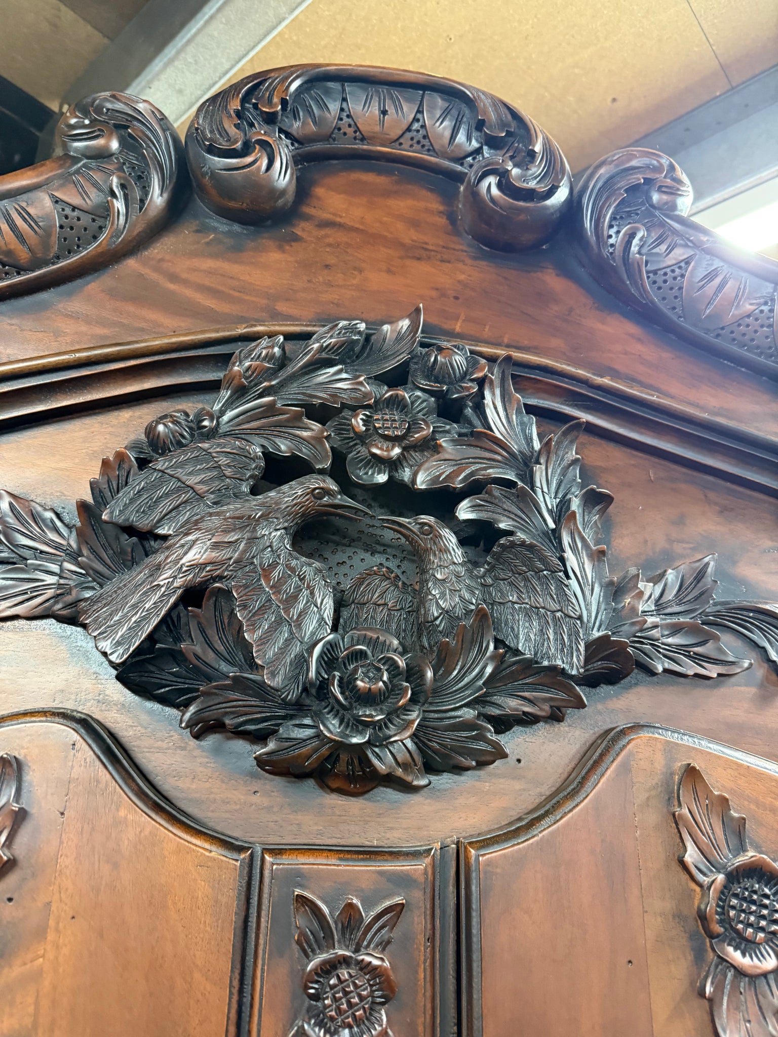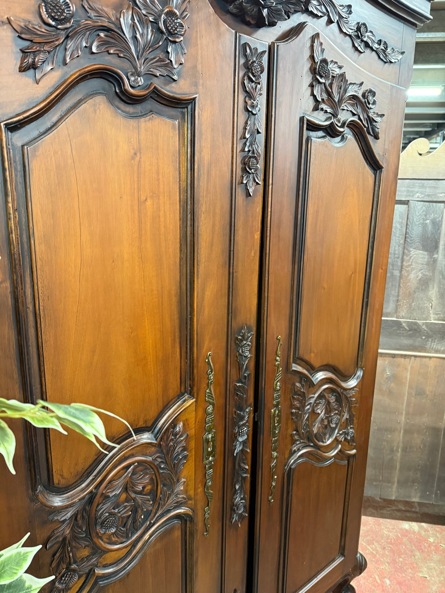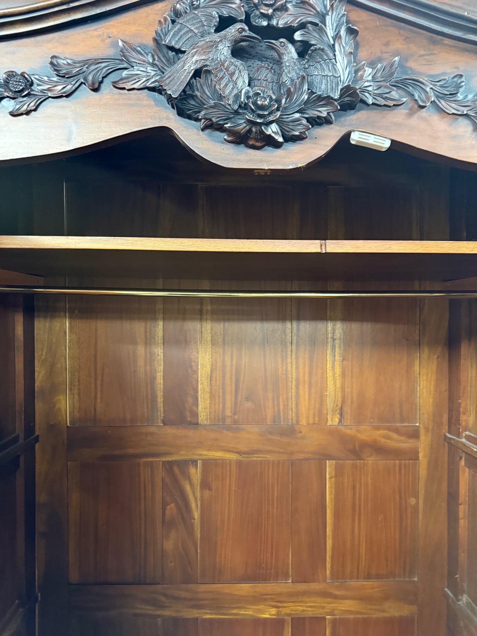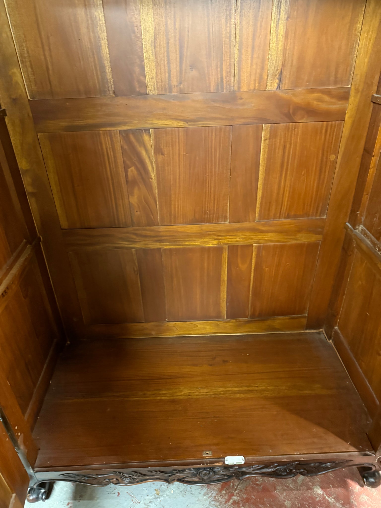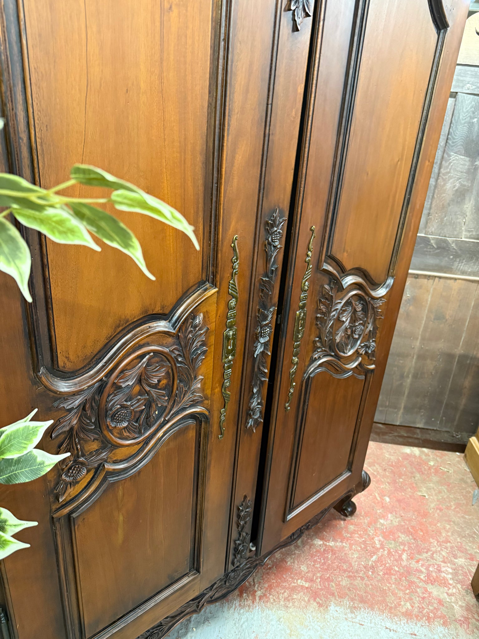 A substantial french style mahogany armoire offering practical storage solutions with one hanging rail and a shelf inside. This pre-owned piece shows its age with light surface marks, yet remains structurally solid and fully functional. The fixed construction ensures stability, whilst the generous interior space makes it ideal for organising clothing and textiles. Its rich wood finish and substantial presence create an impressive statement in any bedroom or dressing area.