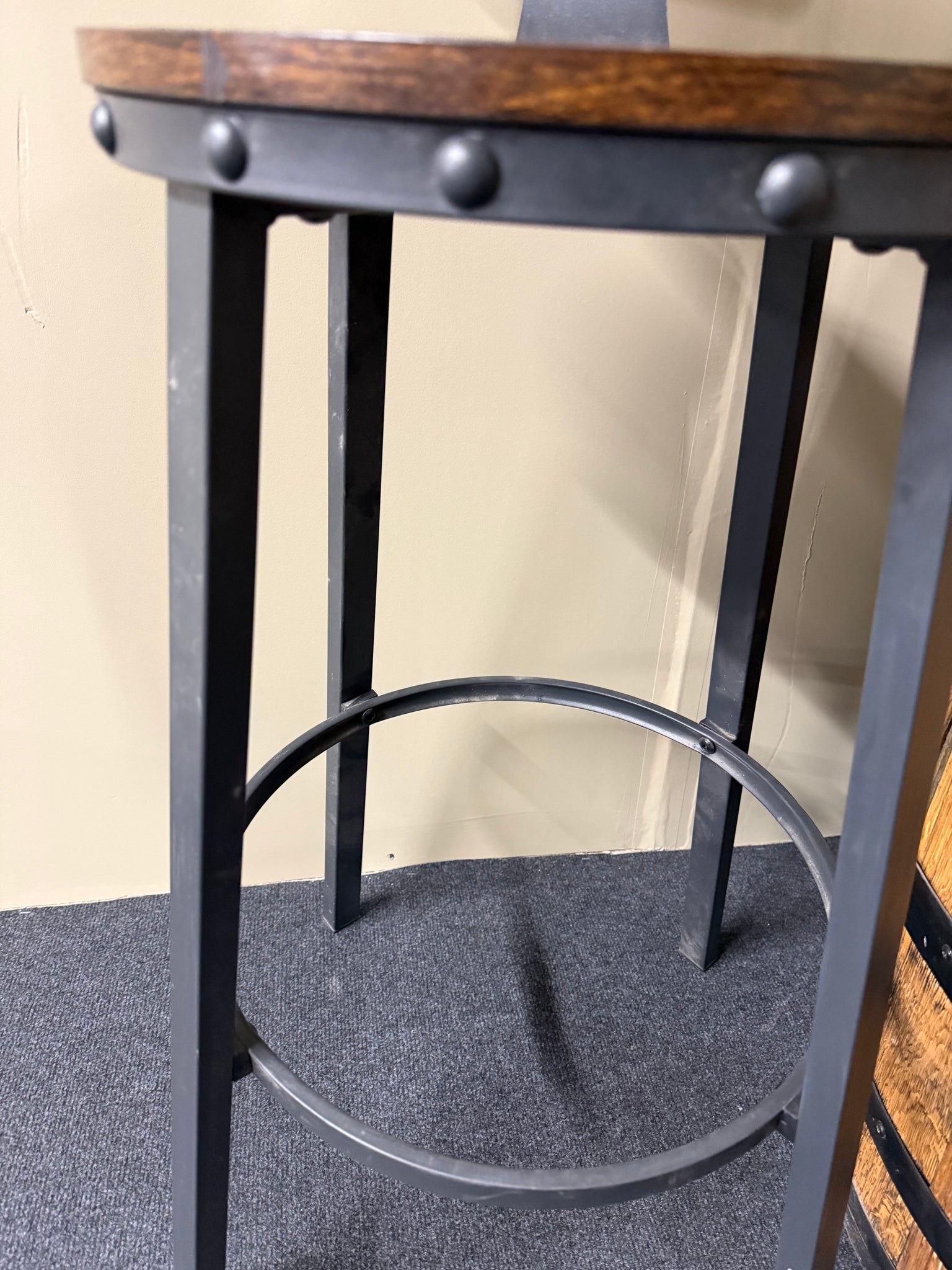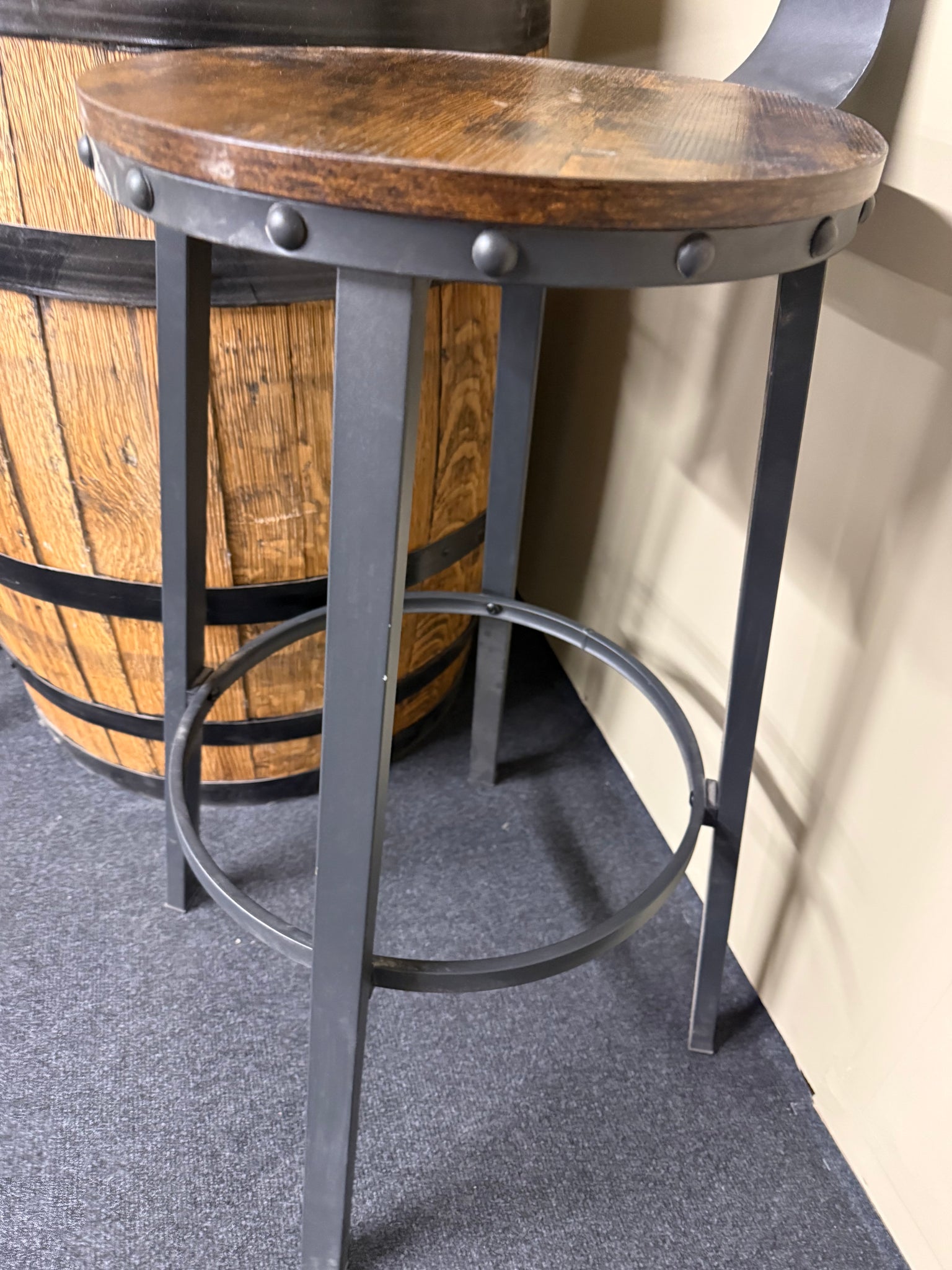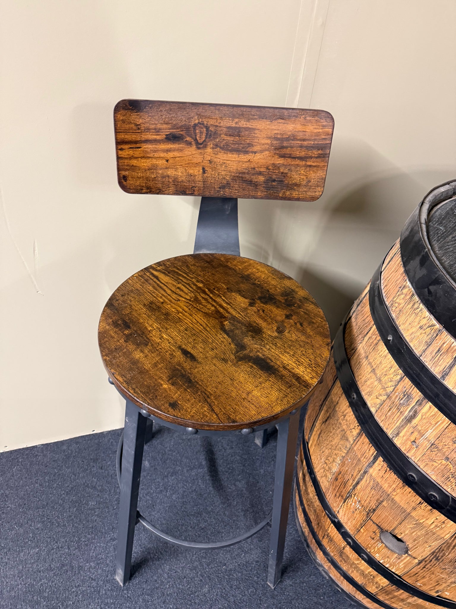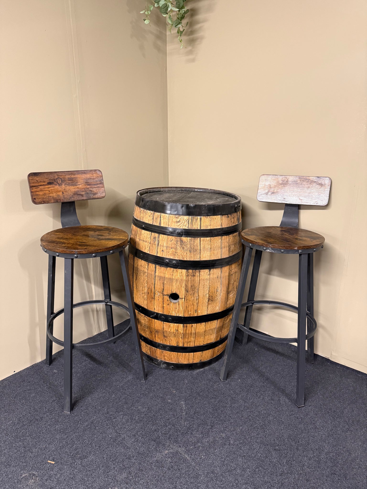Vintage barrel with matching pair of stools—an eye-catching centrepiece for any dining space, indoors or out. This pre-loved set bears the character marks of age, though nothing that detracts from its appeal or functionality. A distinctive conversation starter that brings genuine character to your home.