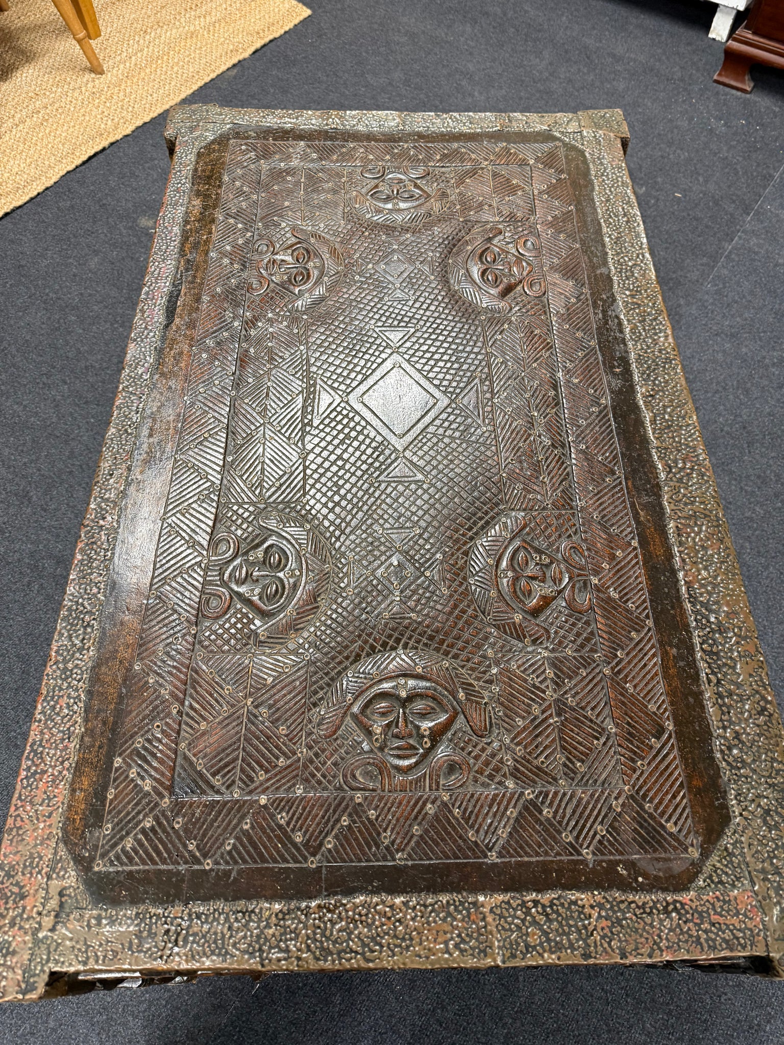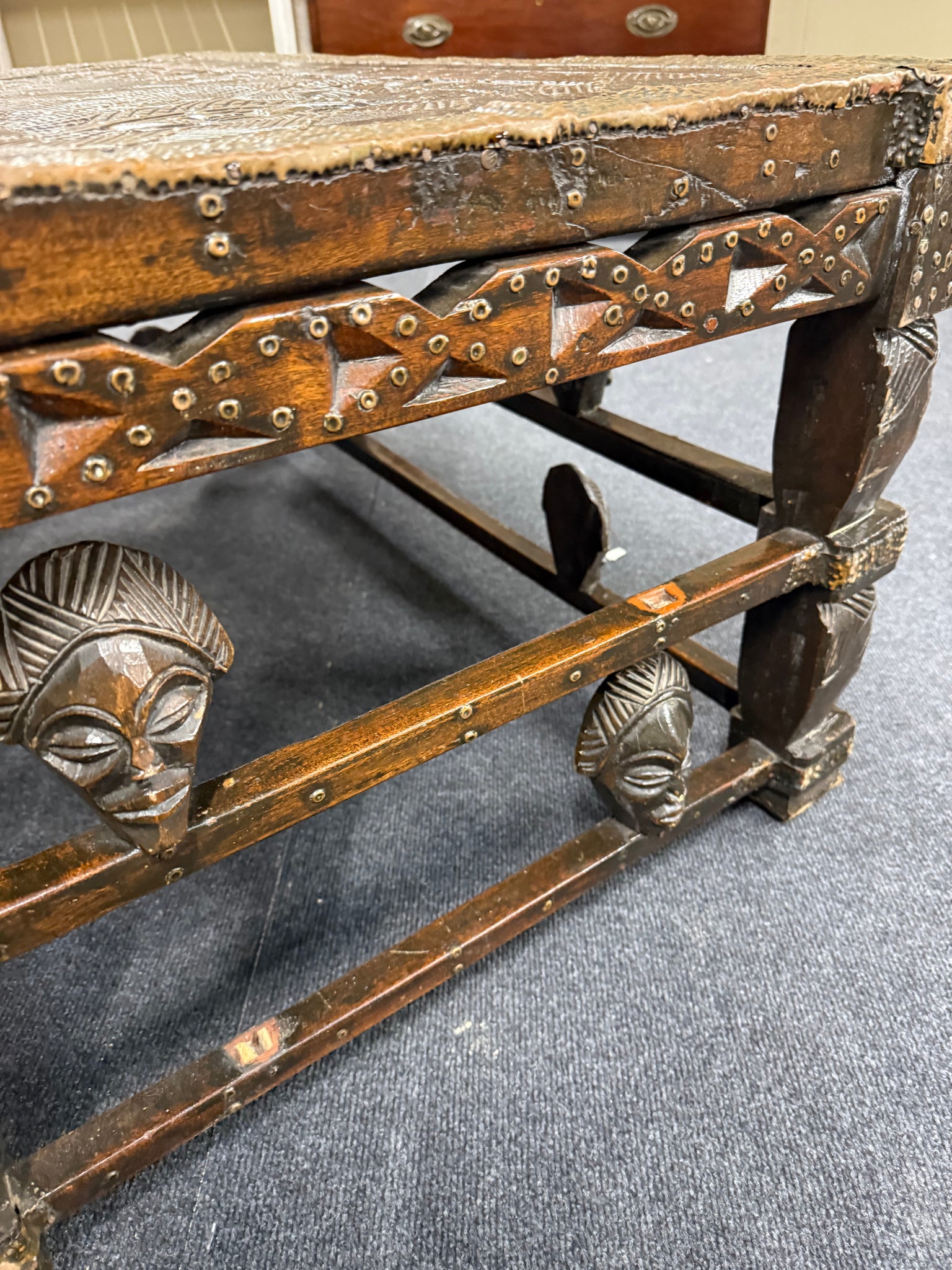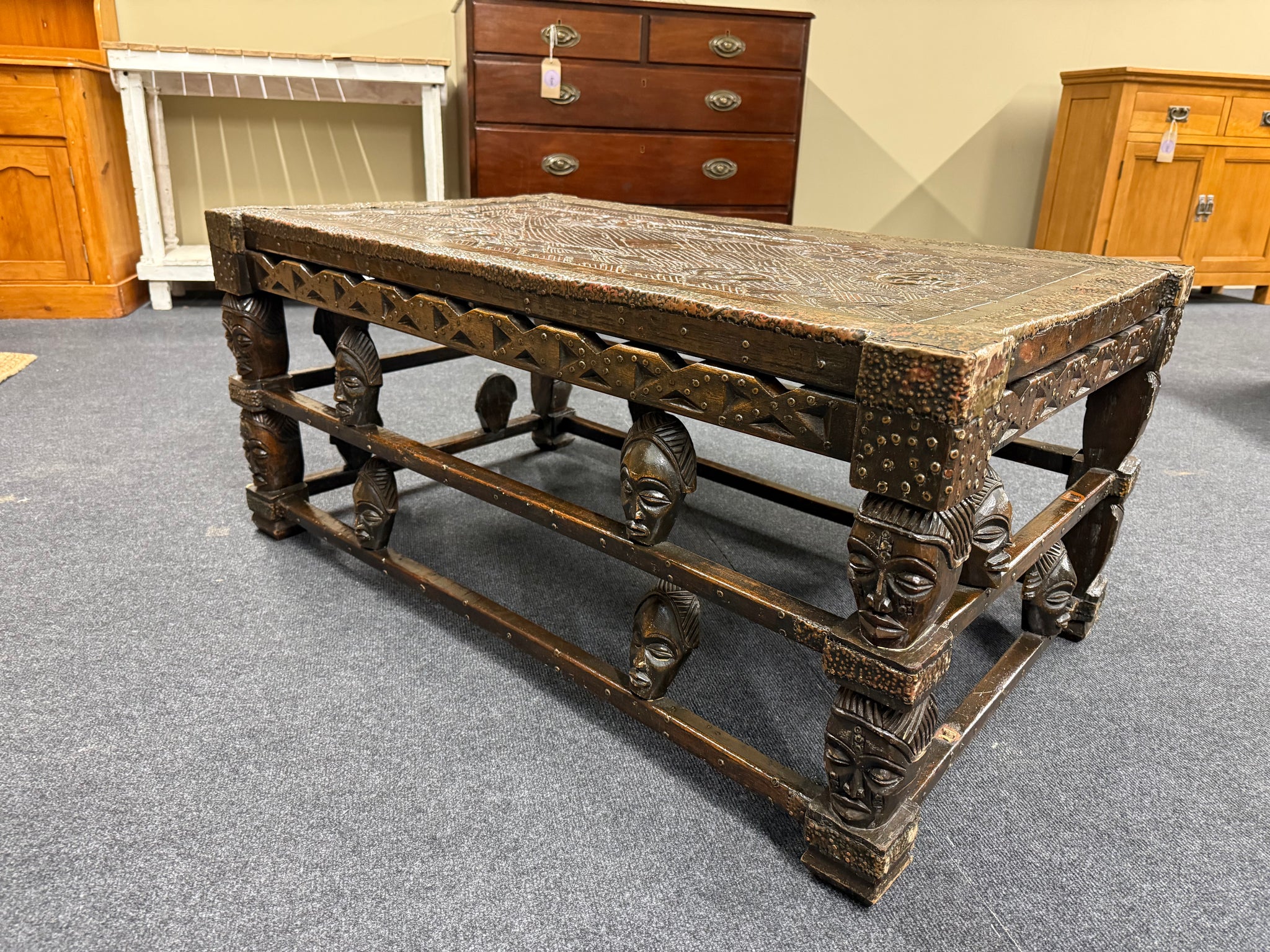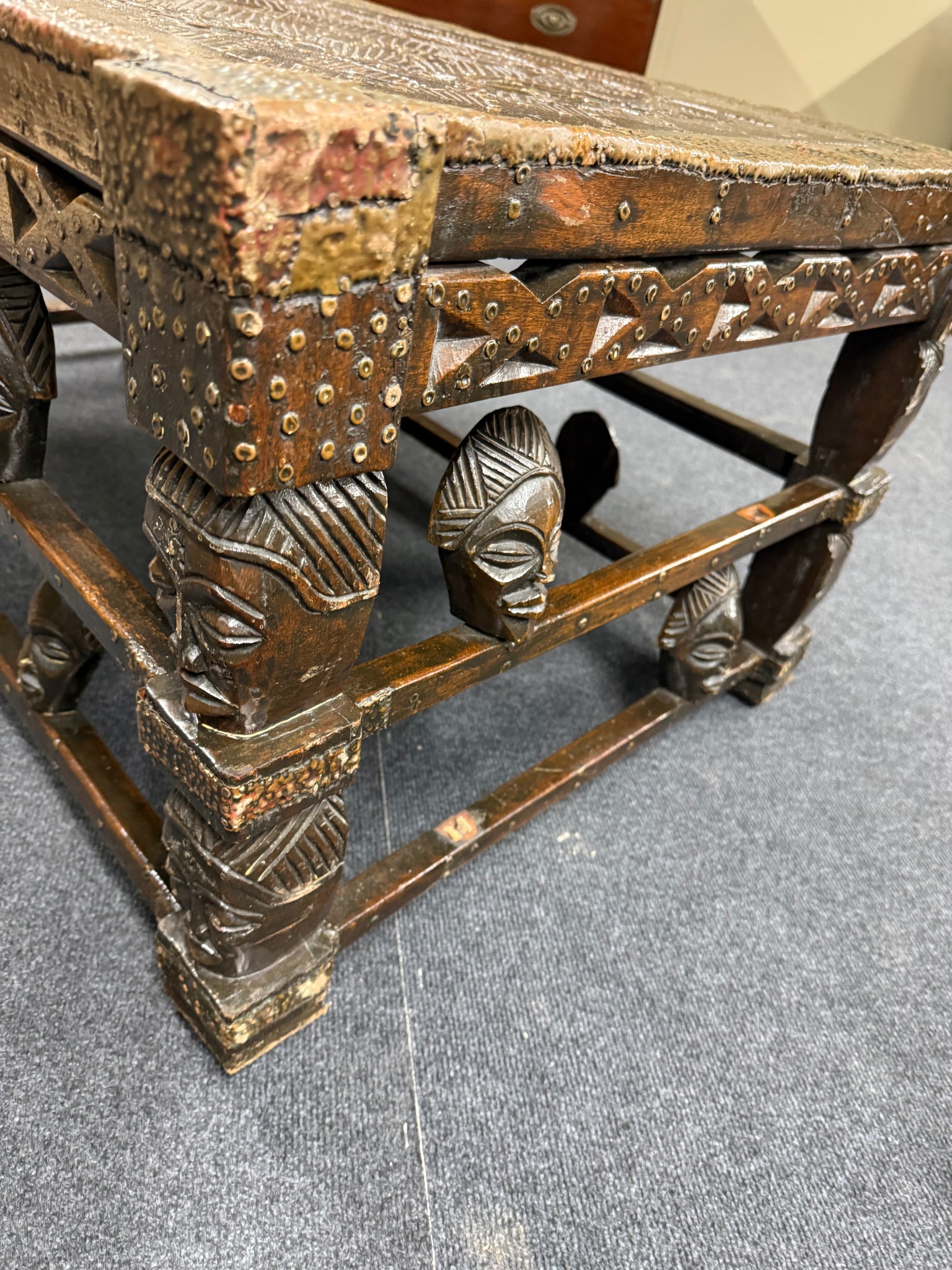 A robust solid wood table showcasing traditional African carving craftsmanship. The piece is in good working condition with minor losses—two carved heads are missing from the design, though this doesn't substantially compromise its appeal. Perfect for those seeking authentic, characterful furniture with a story, this table serves as a striking centrepiece with genuine vintage charm.