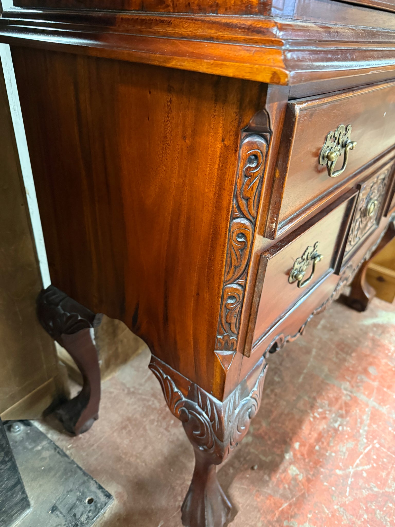 This Chippendale-style chest on chest combines practical storage with stunning design. Twelve drawers in graduated sizes—four long with dovetail joinery, two medium, and six compact—accommodate varied storage needs. The piece remains in sound condition with only minor wear marks. Designed to separate into two sections for straightforward transport and room placement, it serves as a functional bedroom statement piece.