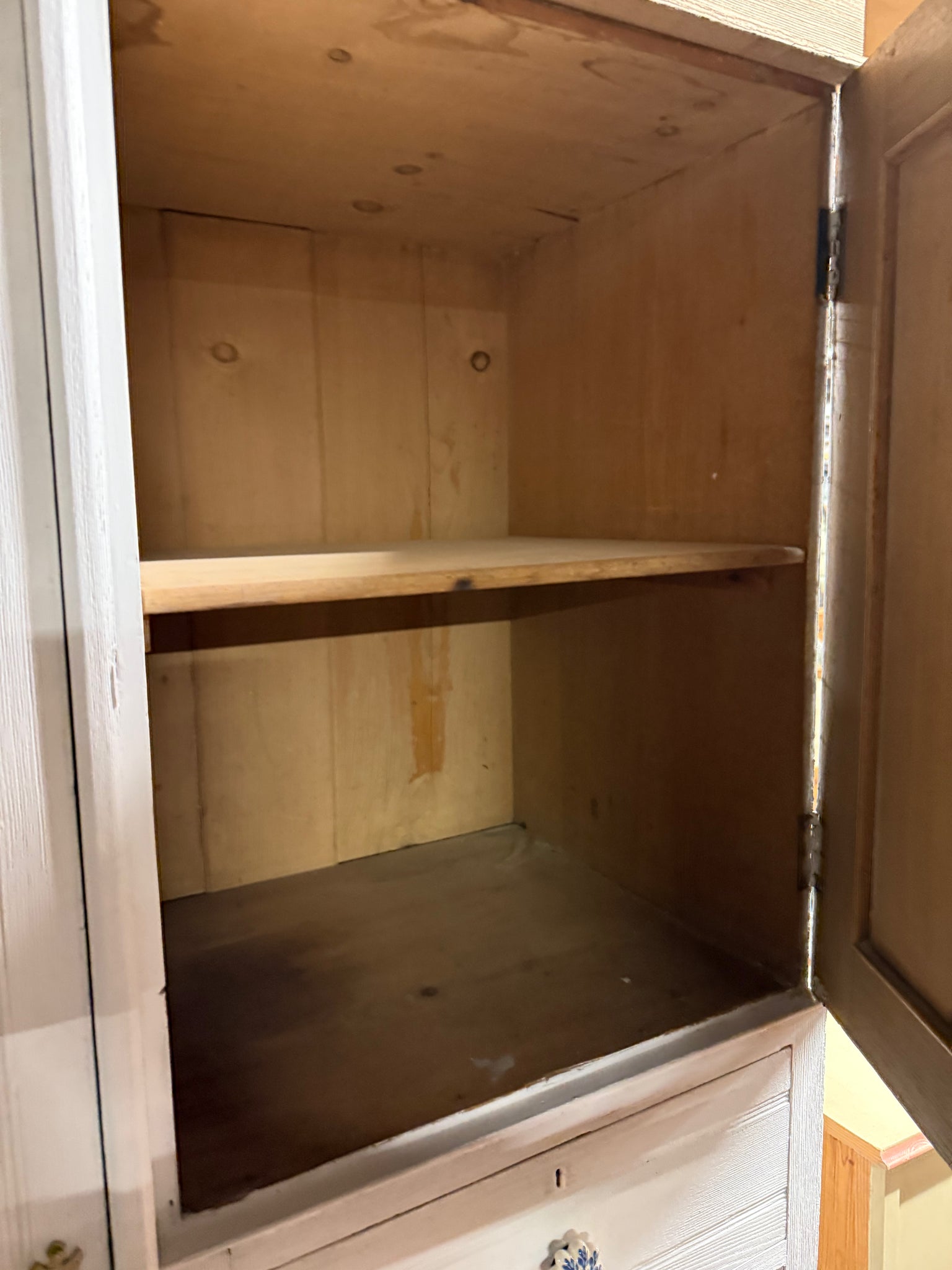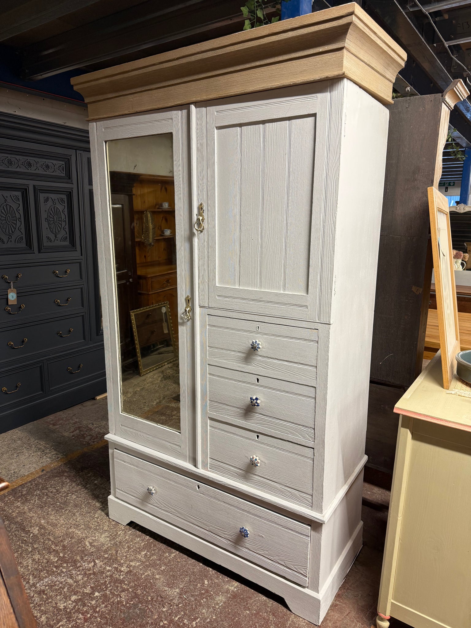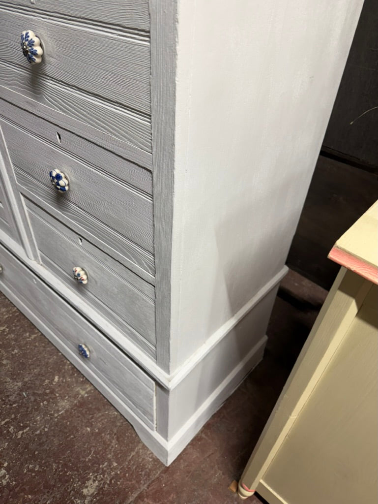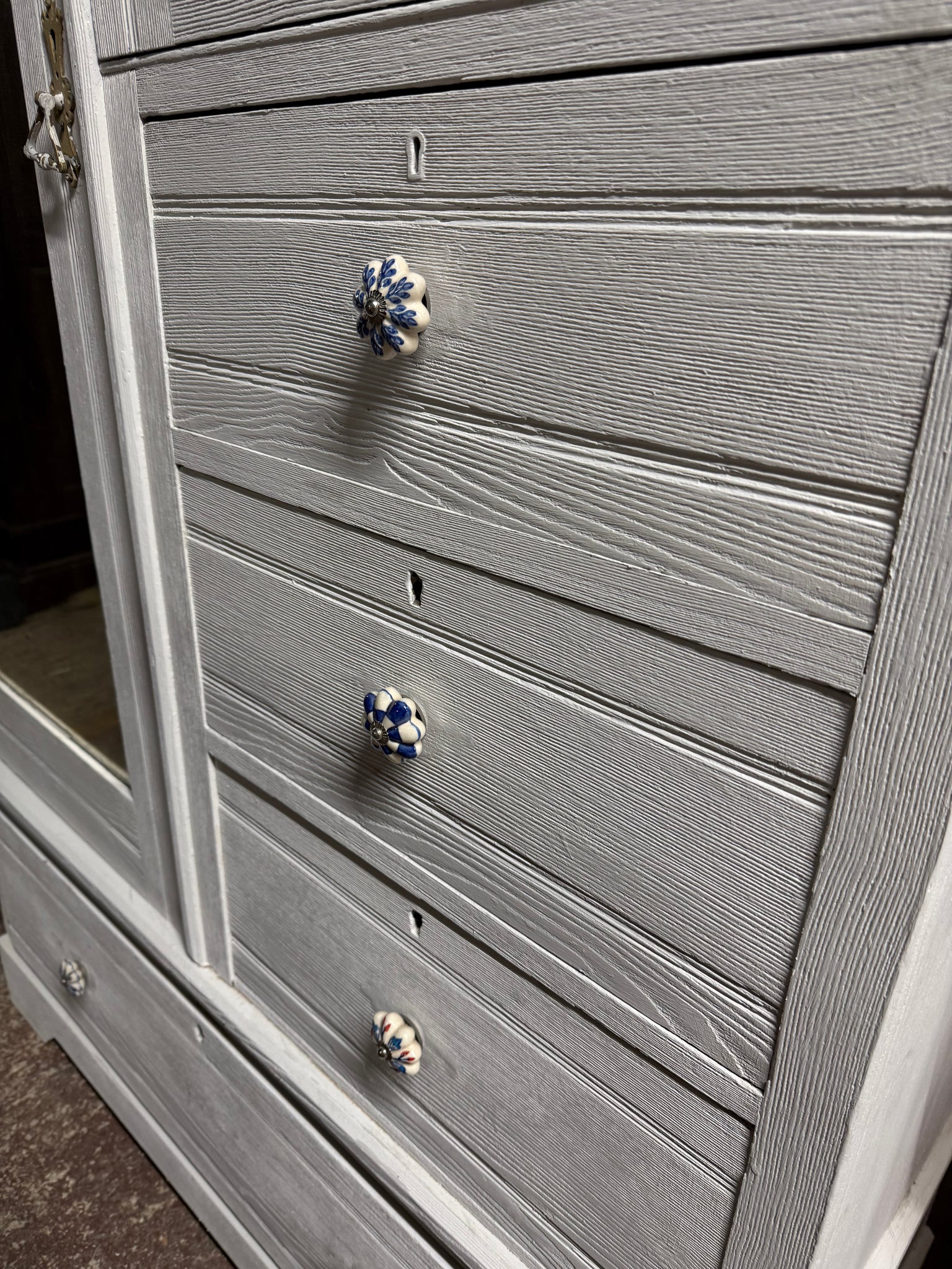 This beautiful oak wardrobe features a fresh white paint finish. While it shows some signs of previous use, a little touch-up will easily restore its charm. Offering plenty of storage space, it includes three small dovetail-jointed drawers, one large drawer, a long cupboard with several hanging hooks, and a smaller cupboard with a shelf. For convenience, it can be taken apart into three sections to make moving simpler.