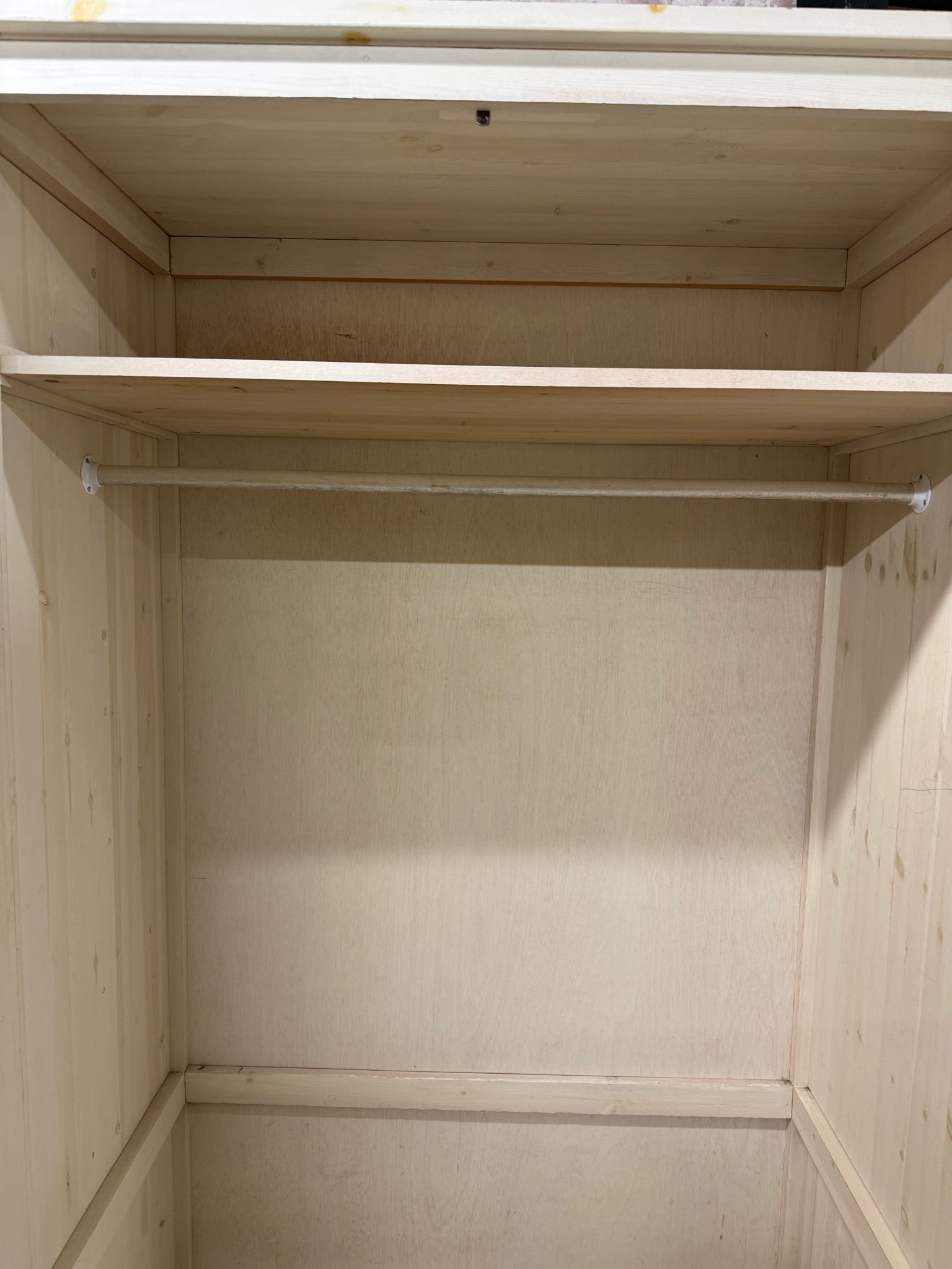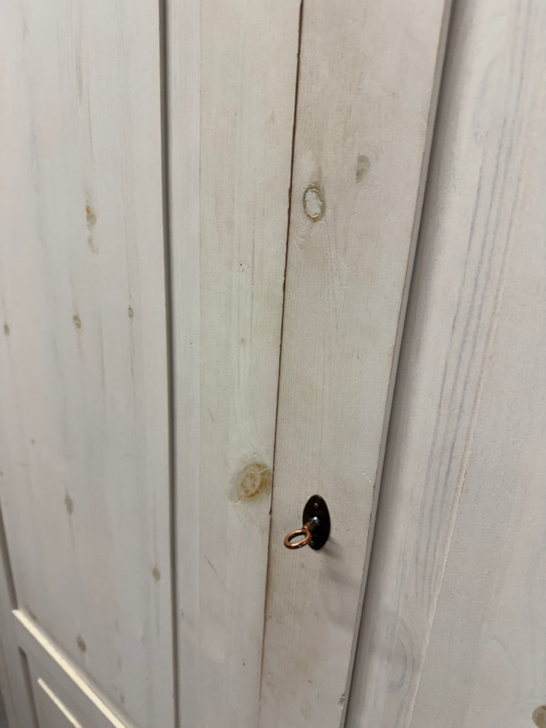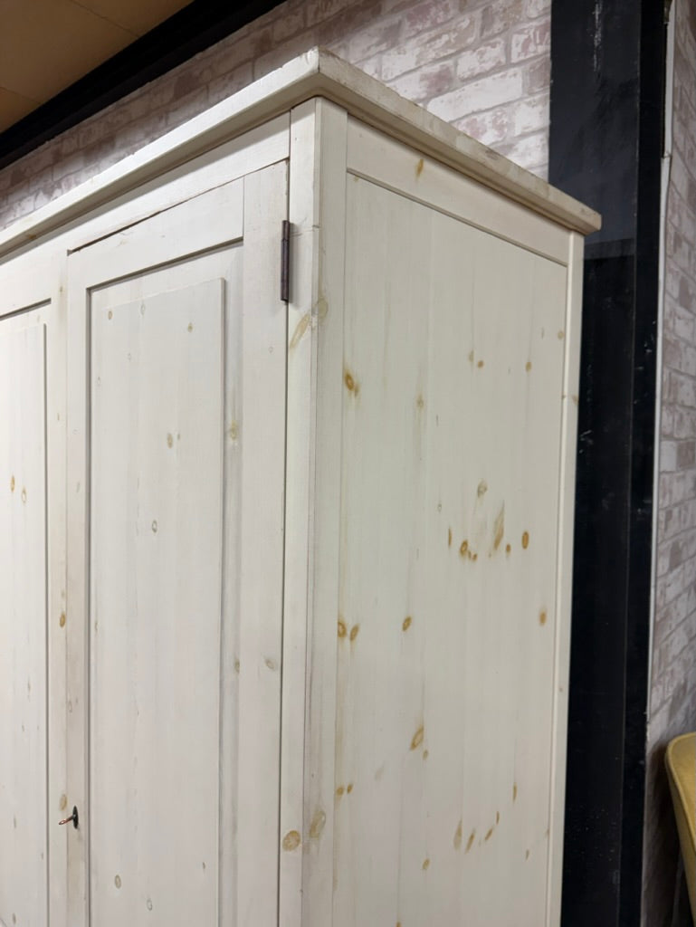 A spacious double pine wardrobe offering practical storage solutions for any bedroom. This pre-loved piece features solid construction with one hanging rail and a shelf, providing flexible organisation for clothes and accessories. While showing natural signs of use with minor surface marks, the wardrobe remains in sound working condition and ready for everyday use. Comes complete with key.