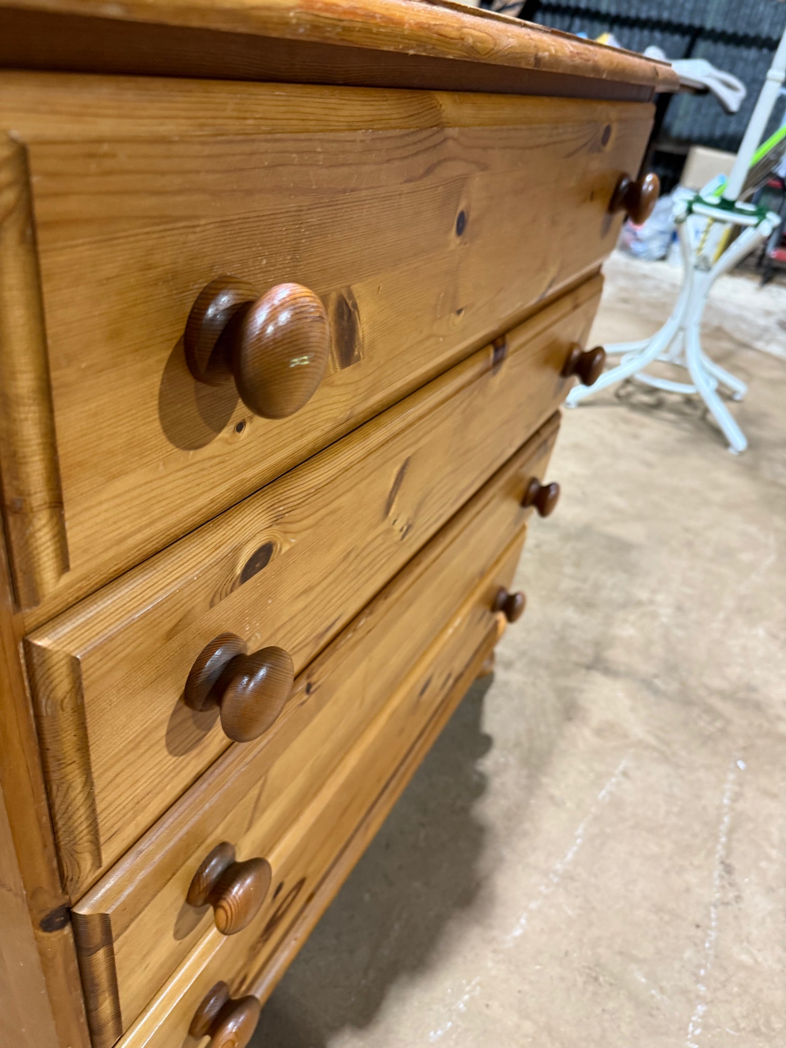 A sturdy solid pine chest of drawers featuring four spacious drawers for practical storage. This ducal pine piece is structurally solid and fully functional, though it bears some surface marks. Perfect for those seeking a candidate for refinishing—whether through a fresh coat of paint or careful sanding to restore its natural beauty.