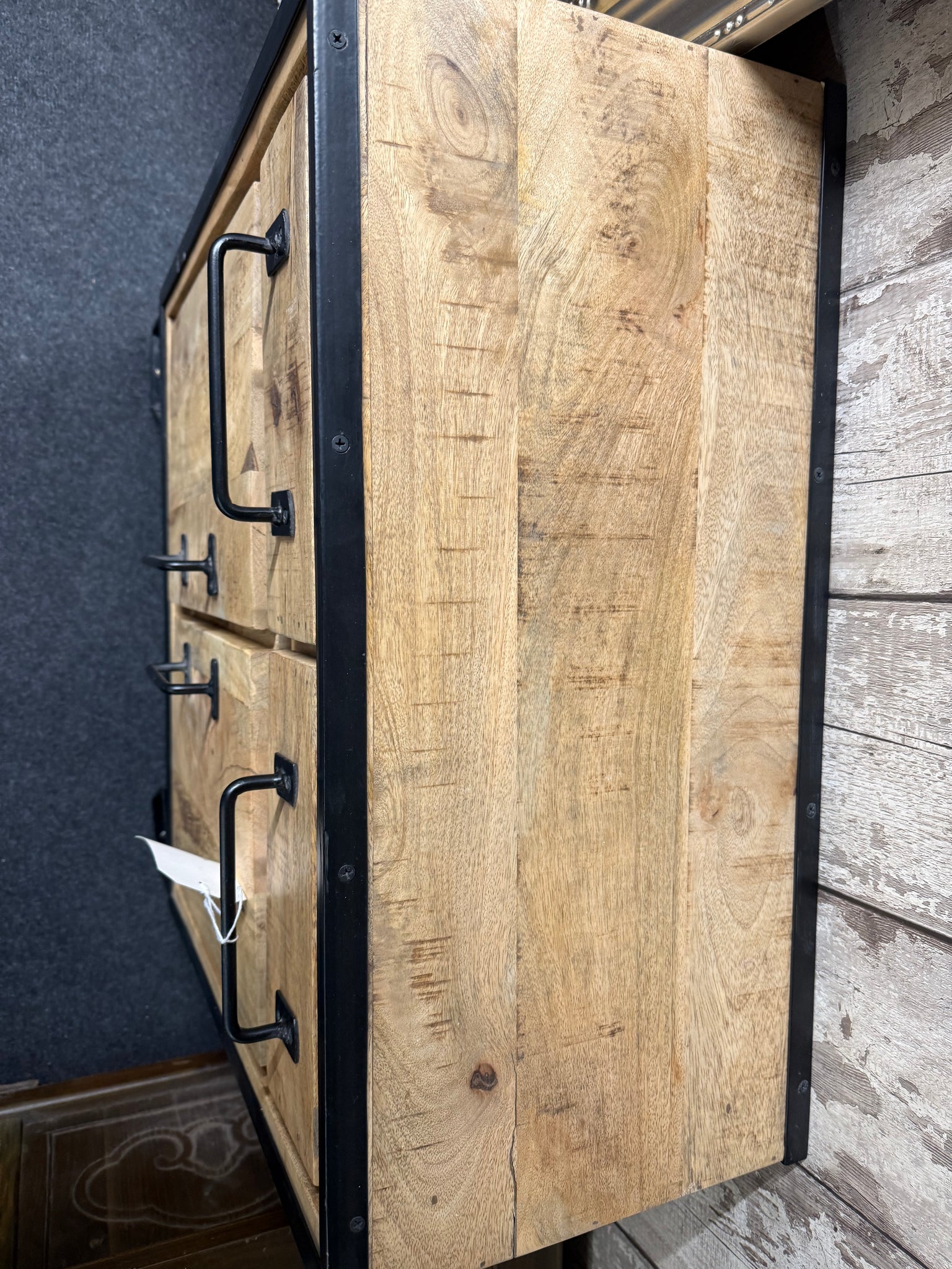 • Load image into Gallery viewer, This charming industrial cupboard, crafted from wood and metal, is solidly built and in good overall condition. While it shows some minor signs of use, there are no significant blemishes. It features two small drawers above a double-door cupboard with a spacious long shelf inside.