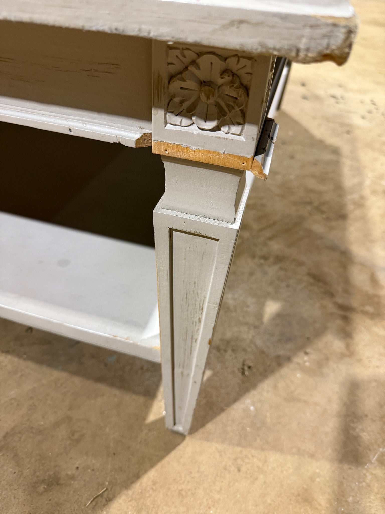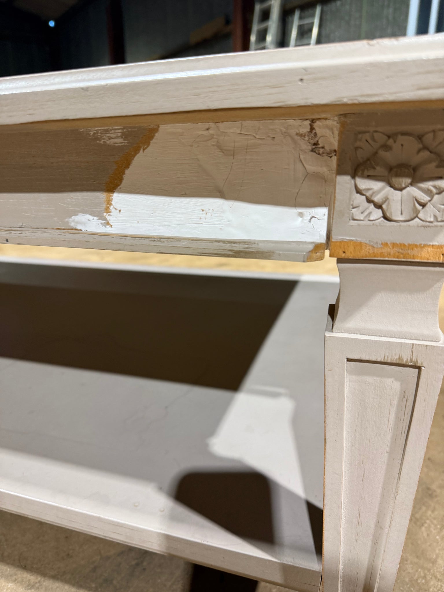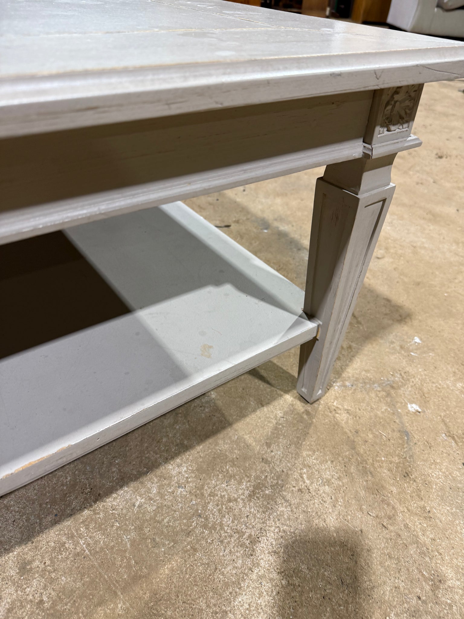 A spacious pine coffee table with vintage character, finished in soft grey tones. Features a practical lower shelf ideal for storing books, magazines, or decorative items. The piece shows signs of use with minor surface marks , along with some cosmetic wear including an edge repair and absent trim sections. Despite its well-loved appearance, the table remains fully functional and sturdy.