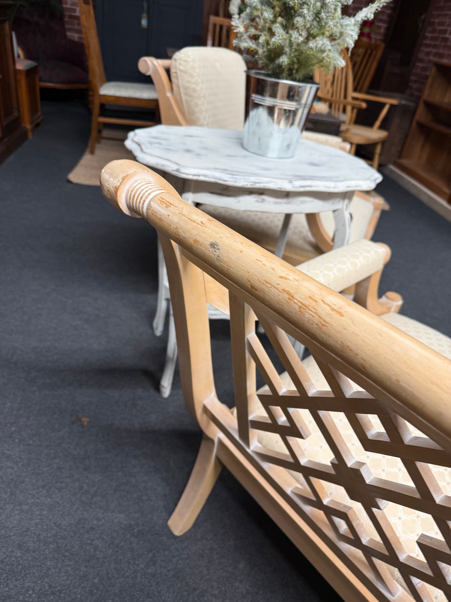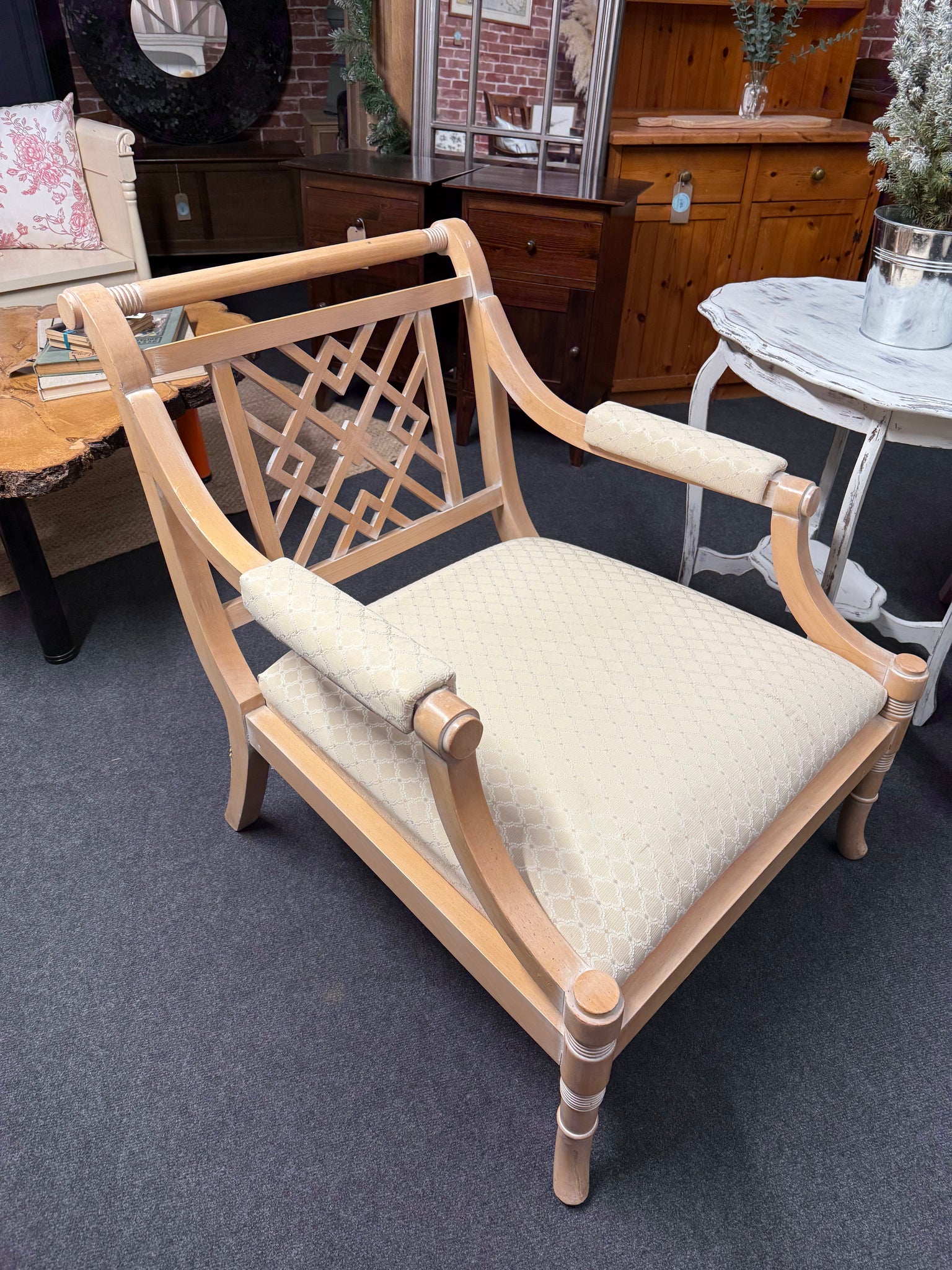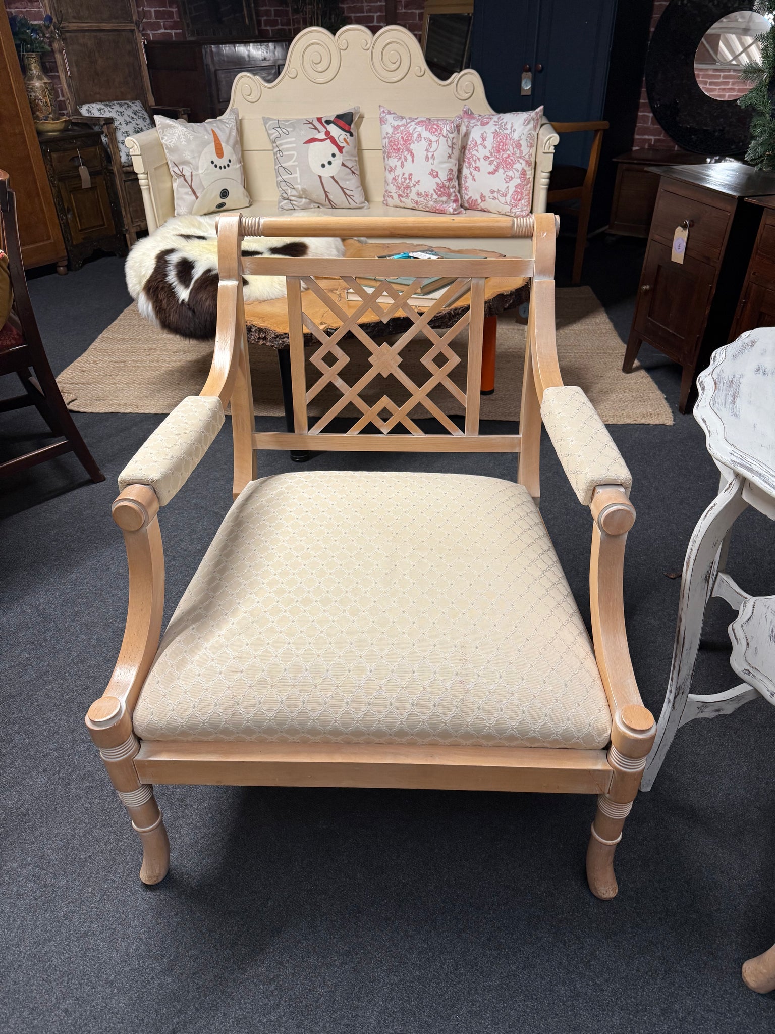A charming limed armchair with solid construction and dependable condition. While it bears the gentle patina of age with minor surface marks, these only add to its character. Ideal for creating a cosy reading corner or adding vintage appeal to any room.