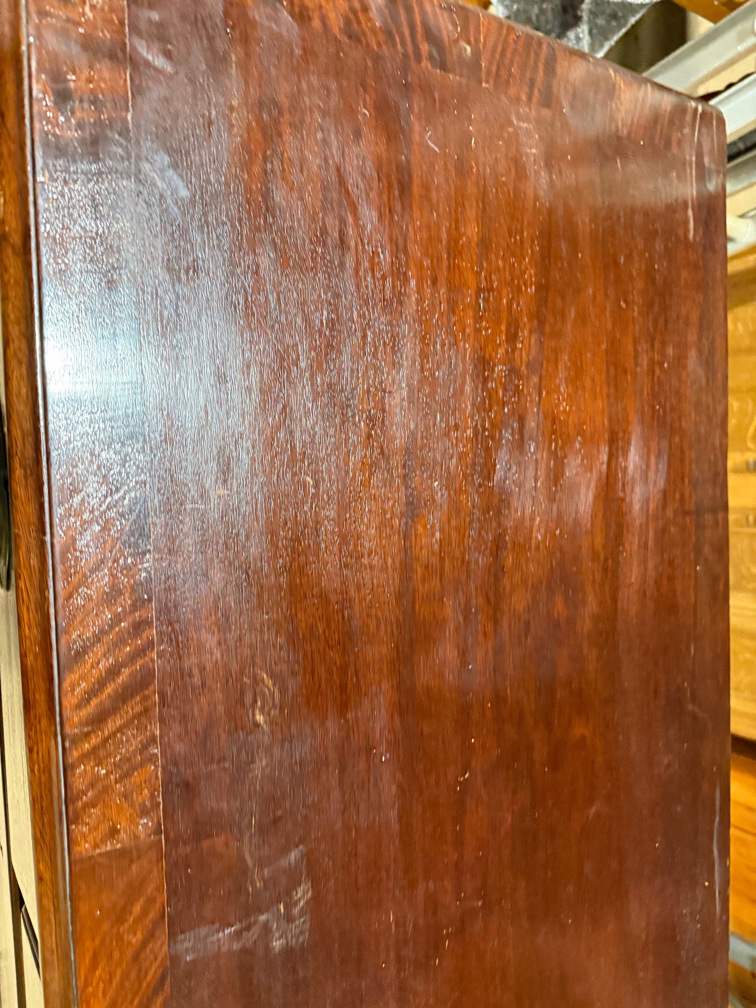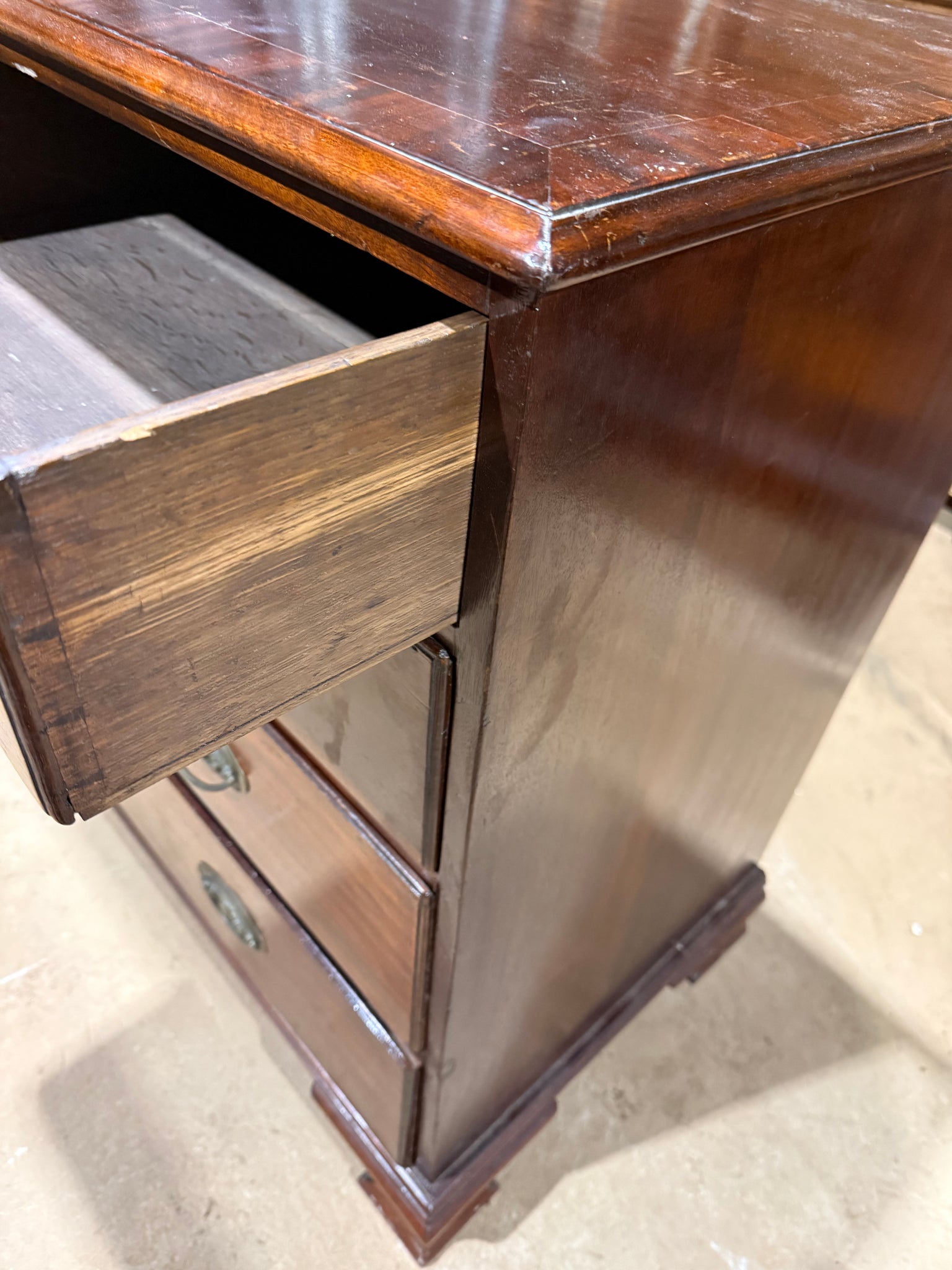 A solid mahogany chest featuring five dovetail-jointed drawers—two short and three long—offering generous storage capacity. The piece shows its age with surface marks and patina, though these can be minimised with careful polishing. Structurally sound and ready to serve as a functional addition to any room.