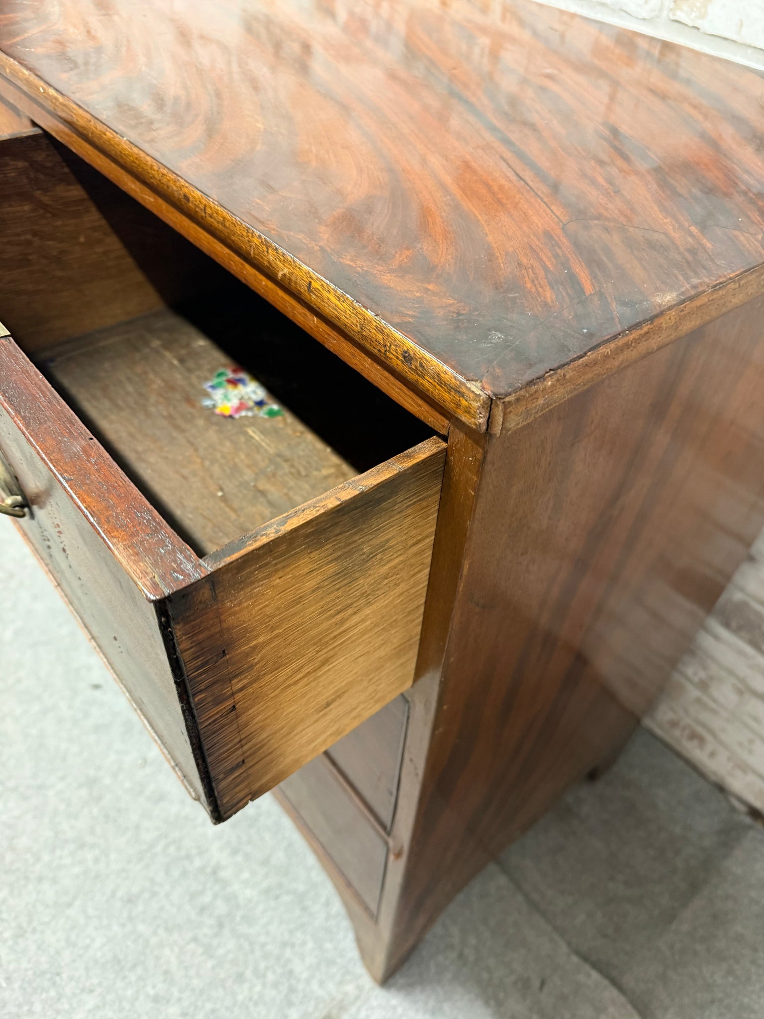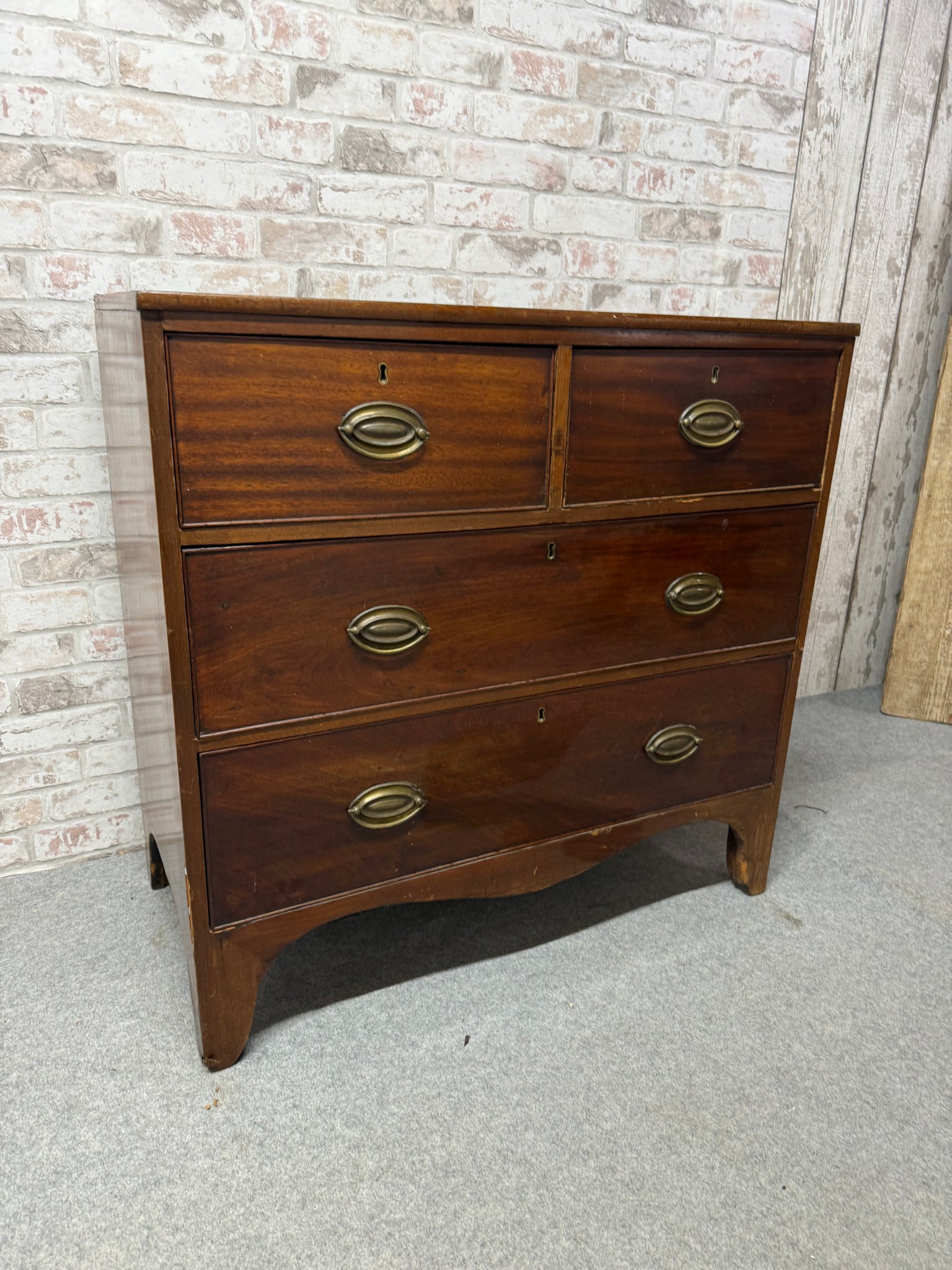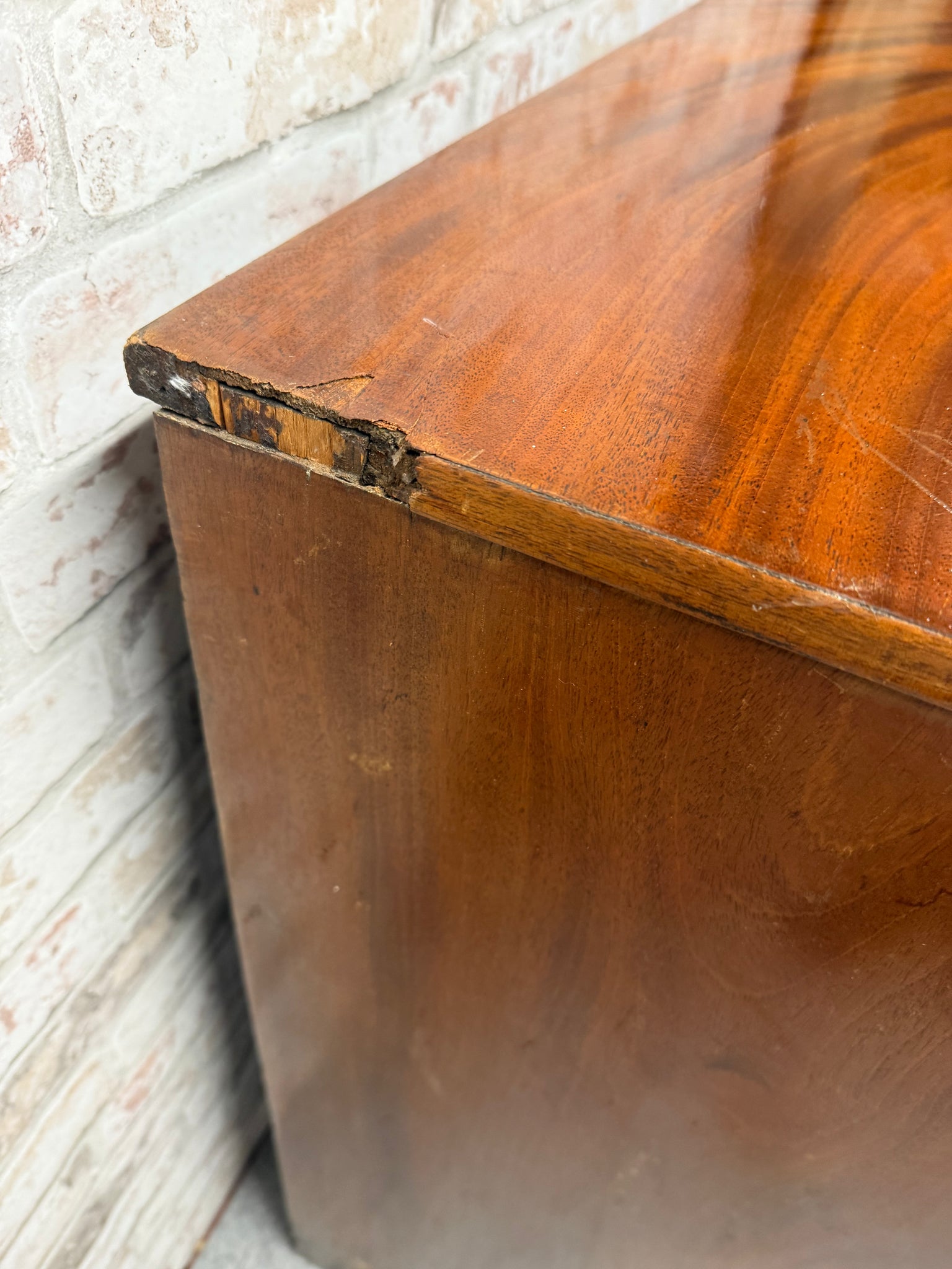 This mahogany chest combines practical storage with classic craftsmanship. Featuring two short dovetail-jointed drawers above two long drawers, it offers versatile organisation for any room. The piece is structurally solid and fully functional. As a pre-loved item, it bears the honest patina of age—including surface marks and some veneer loss. Ideal for those who appreciate authentic vintage furniture with genuine history.
