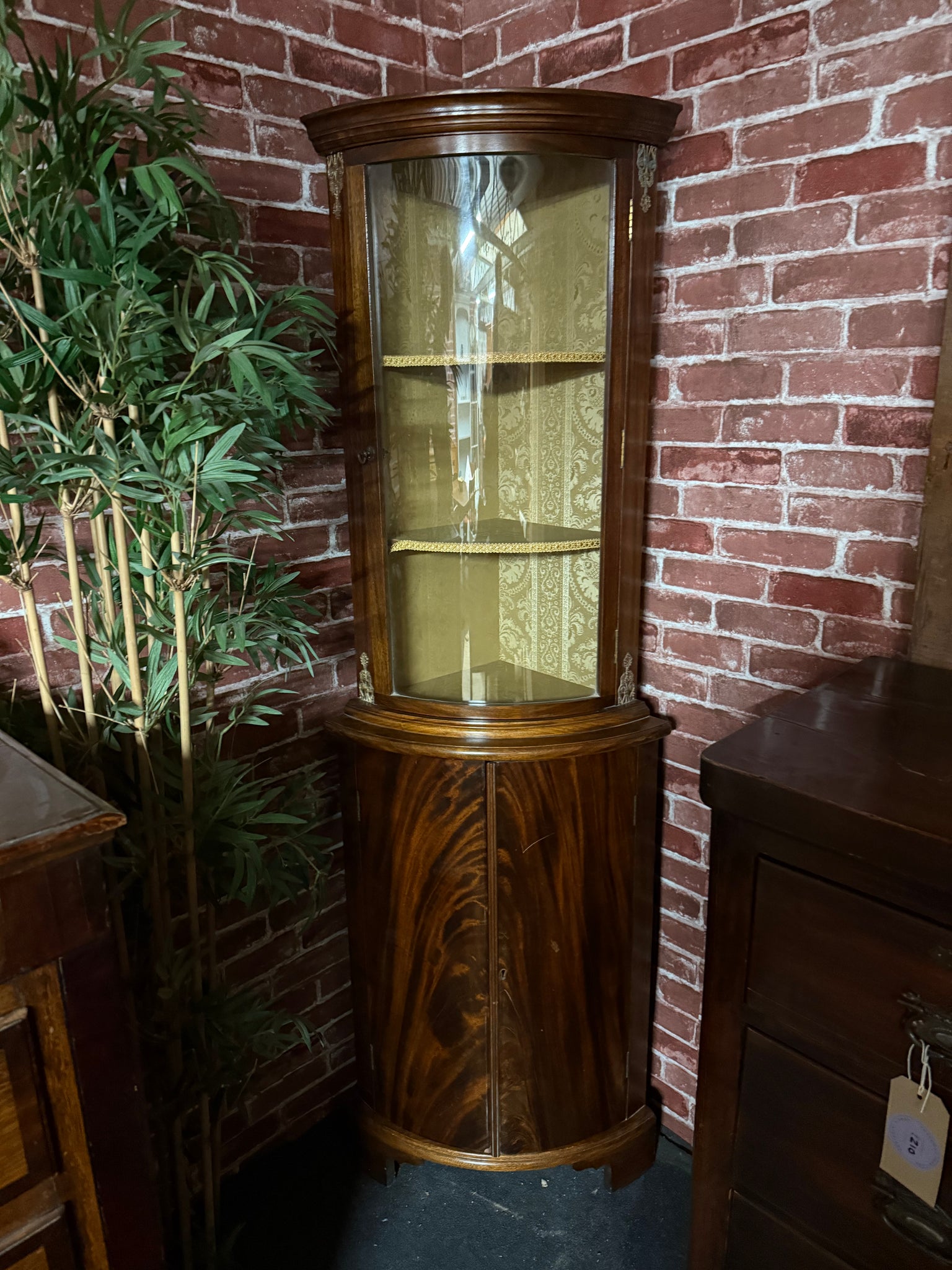 This handsome mahogany corner unit showcases classic period styling with practical storage across four shelves—two positioned in the upper section and two in the lower. The piece displays light surface marks consistent with age and use. A distinguished addition to any room seeking traditional charm and functional display space.