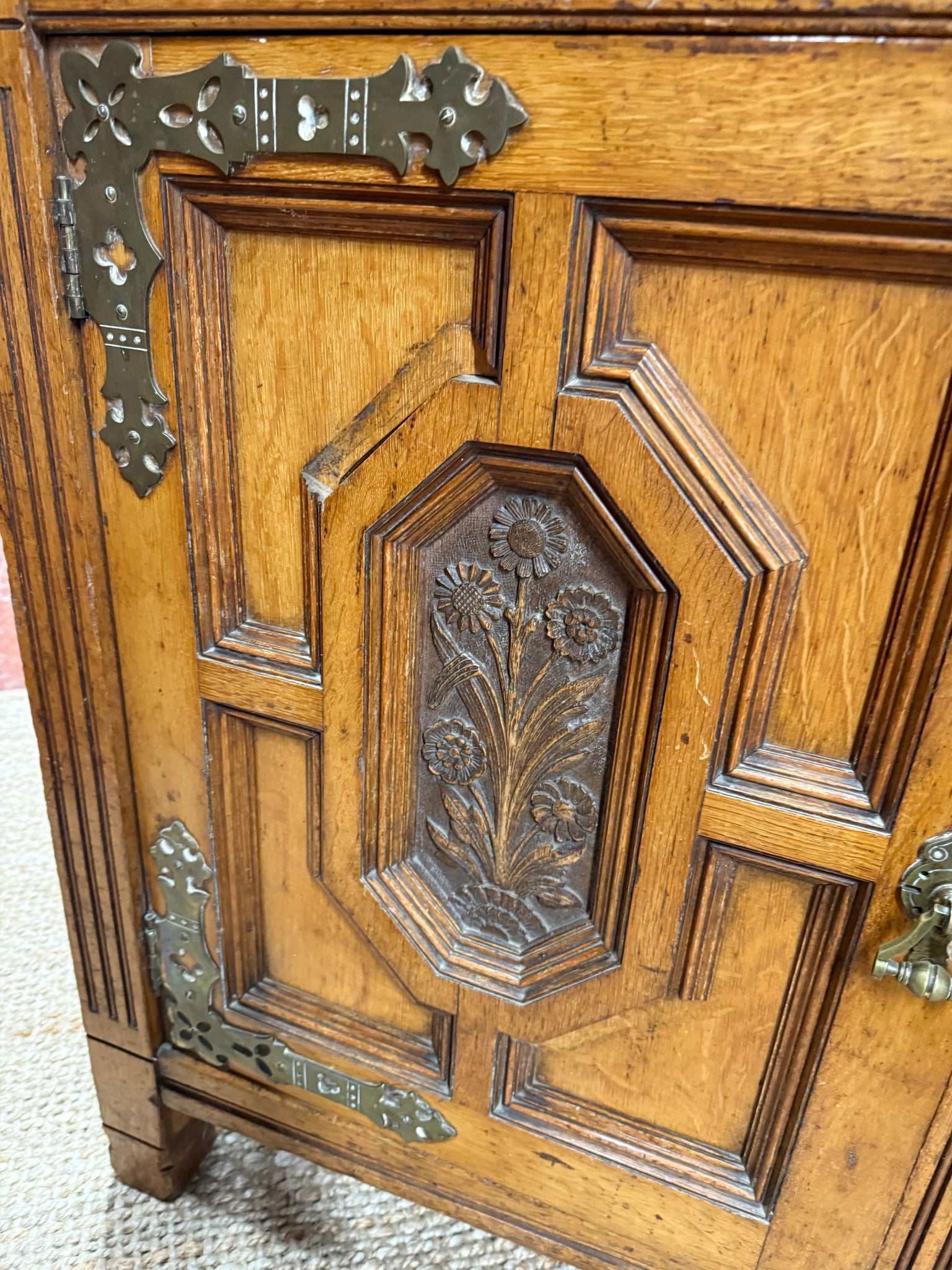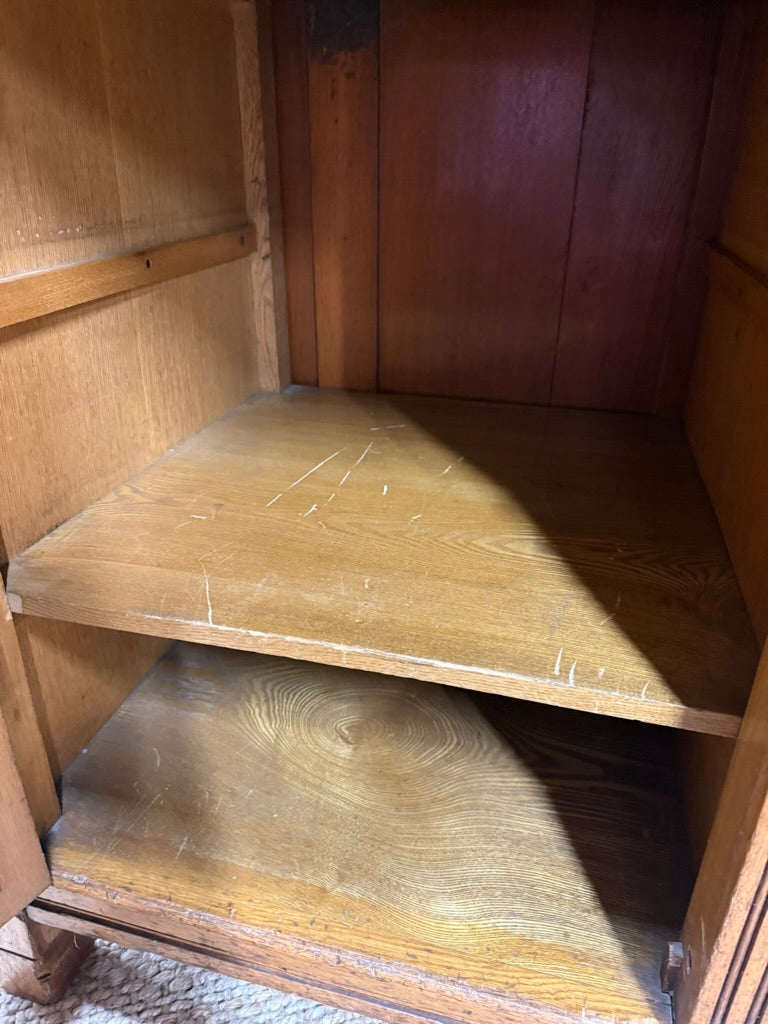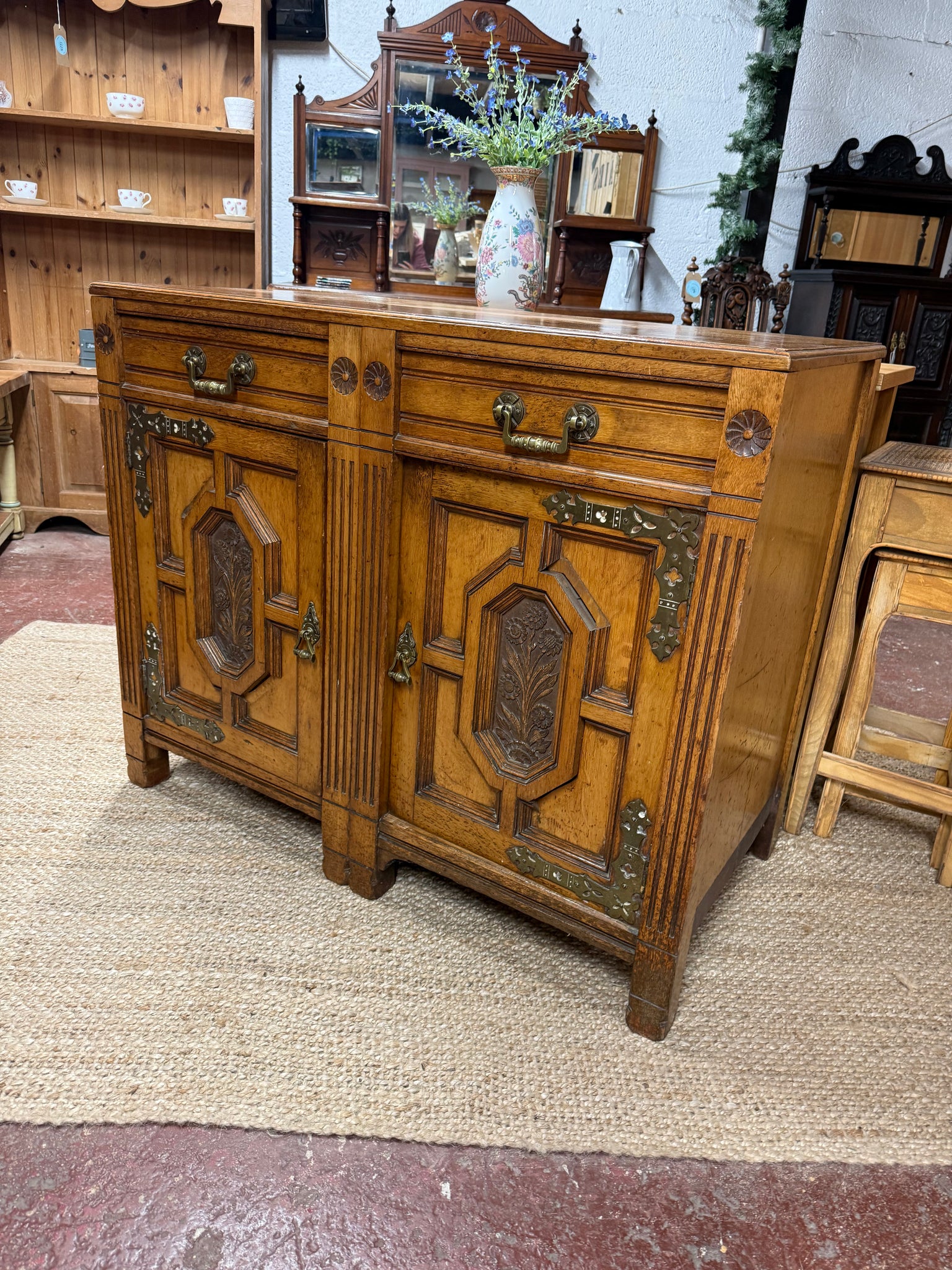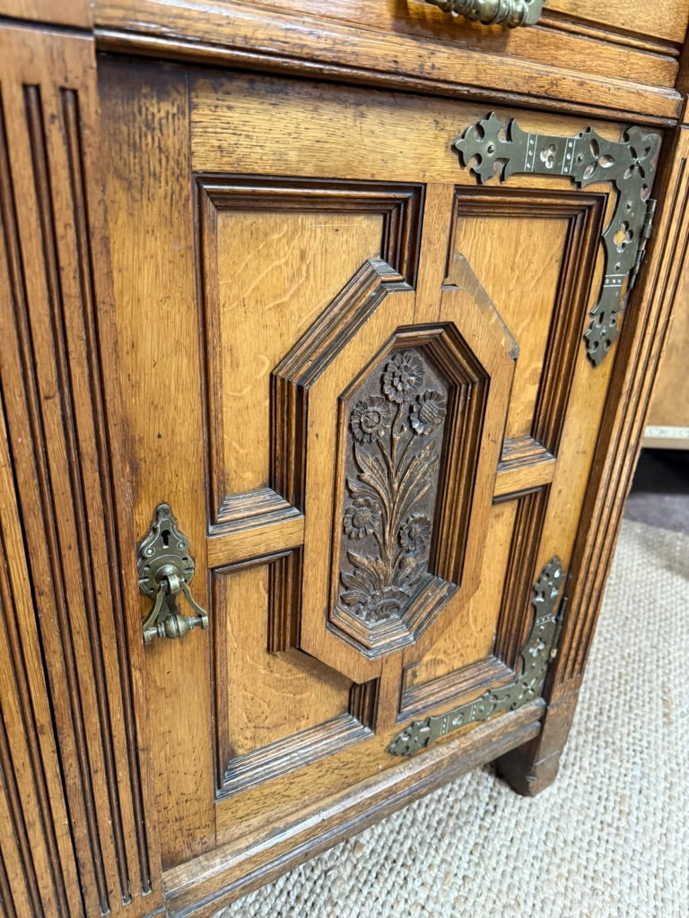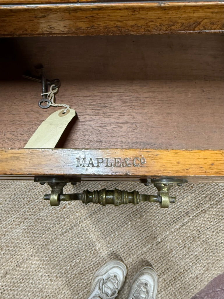 This beautiful Maple & Co sideboard is solidly built and generally in great condition. While it shows some signs of use, the marks are minor and do not detract from its charm. It offers plenty of storage space with two dovetail drawers and two cupboards—one featuring a shelf, and the other including a shelf plus a galvanised drawer designed to hold six bottles. It also comes with its two original keys for added convenience.