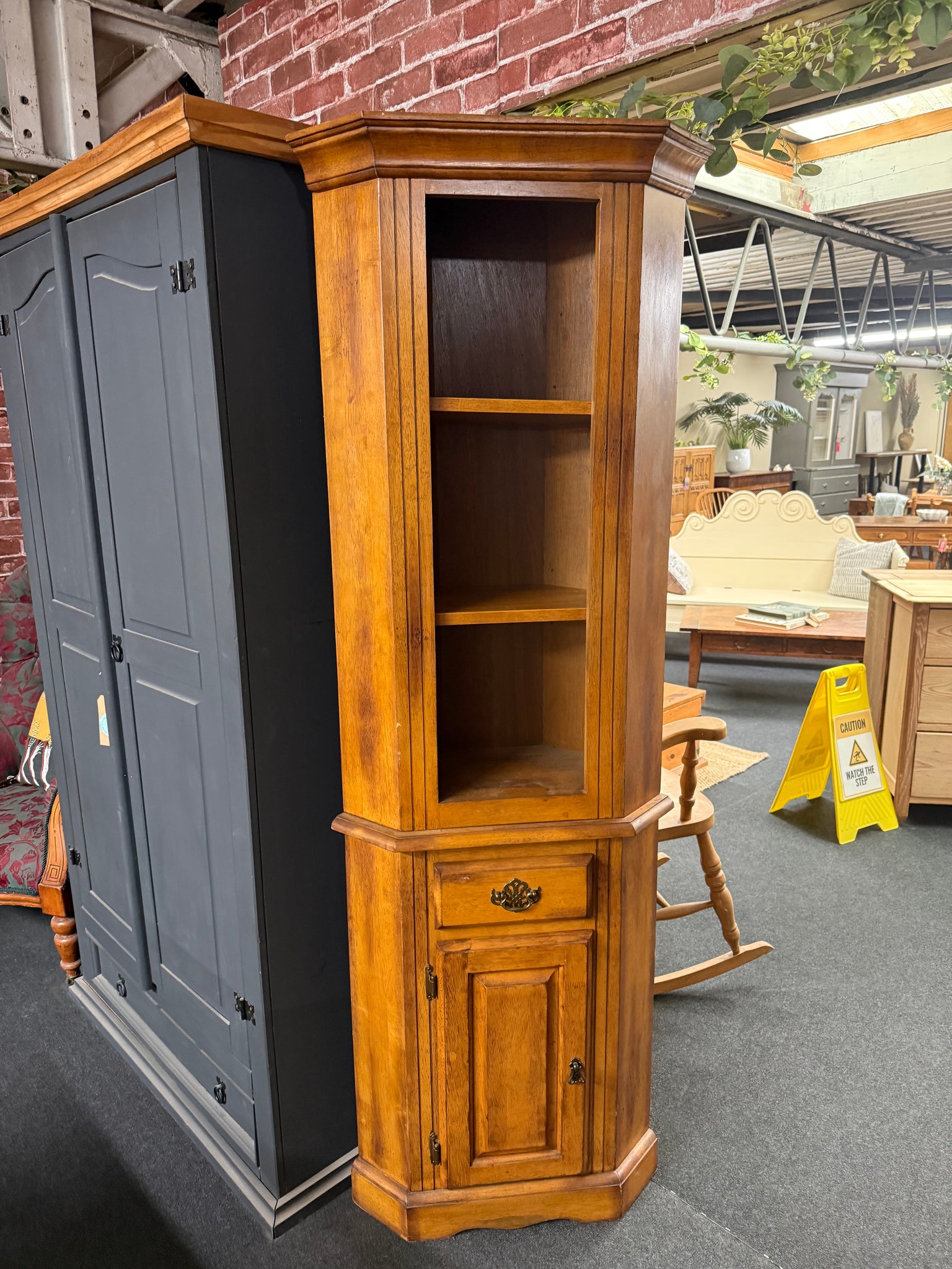 A characterful heavy oak corner unit with solid construction and practical storage. Features two shelves in the upper section - small drawer, and a cupboard at the base—ideal for maximising corner space. Shows honest signs of use with minor marks consistent with age, adding to its authentic vintage appeal. Structurally sound and ready for a new home.