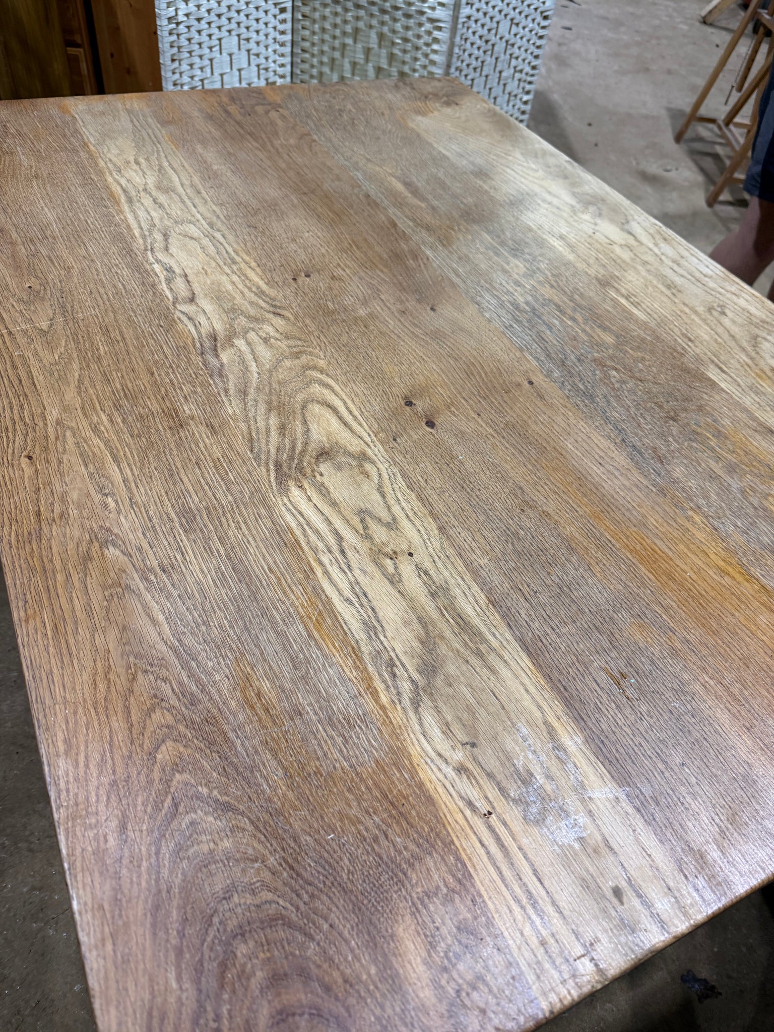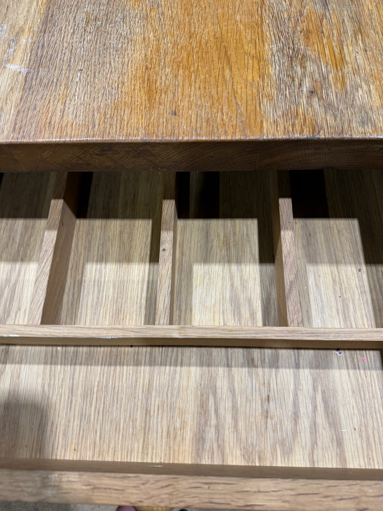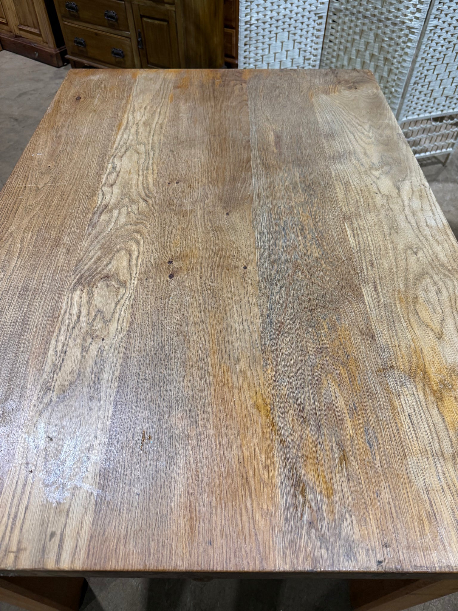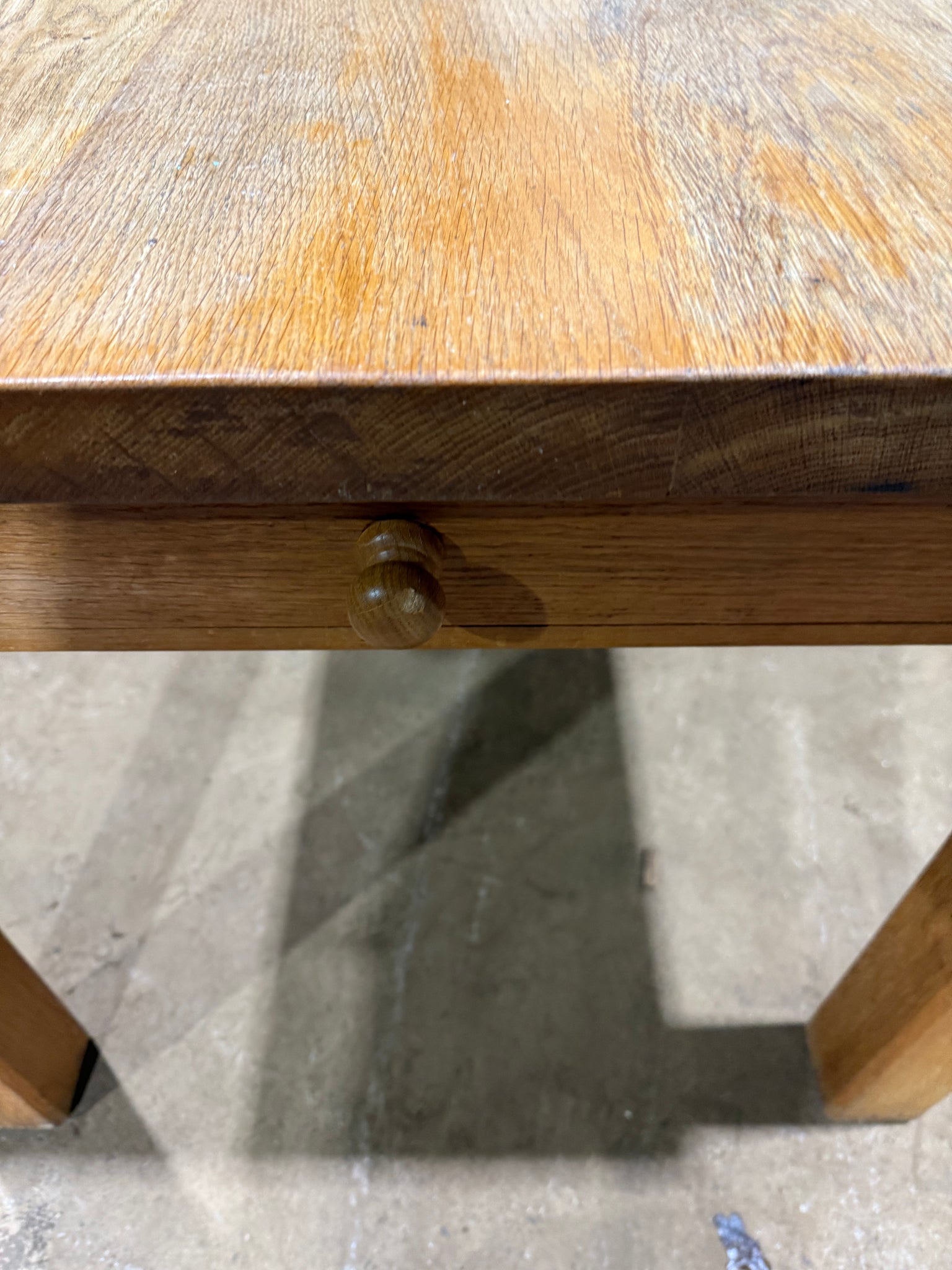 A sturdy oak dining table with authentic character, showing gentle signs of age and use. Features a single dovetail-jointed drawer ideal for storing cutlery. Comfortably accommodates four to six diners, making it perfect for family meals and entertaining. The solid construction ensures reliable everyday use, whilst the natural patina adds warmth to any dining space.