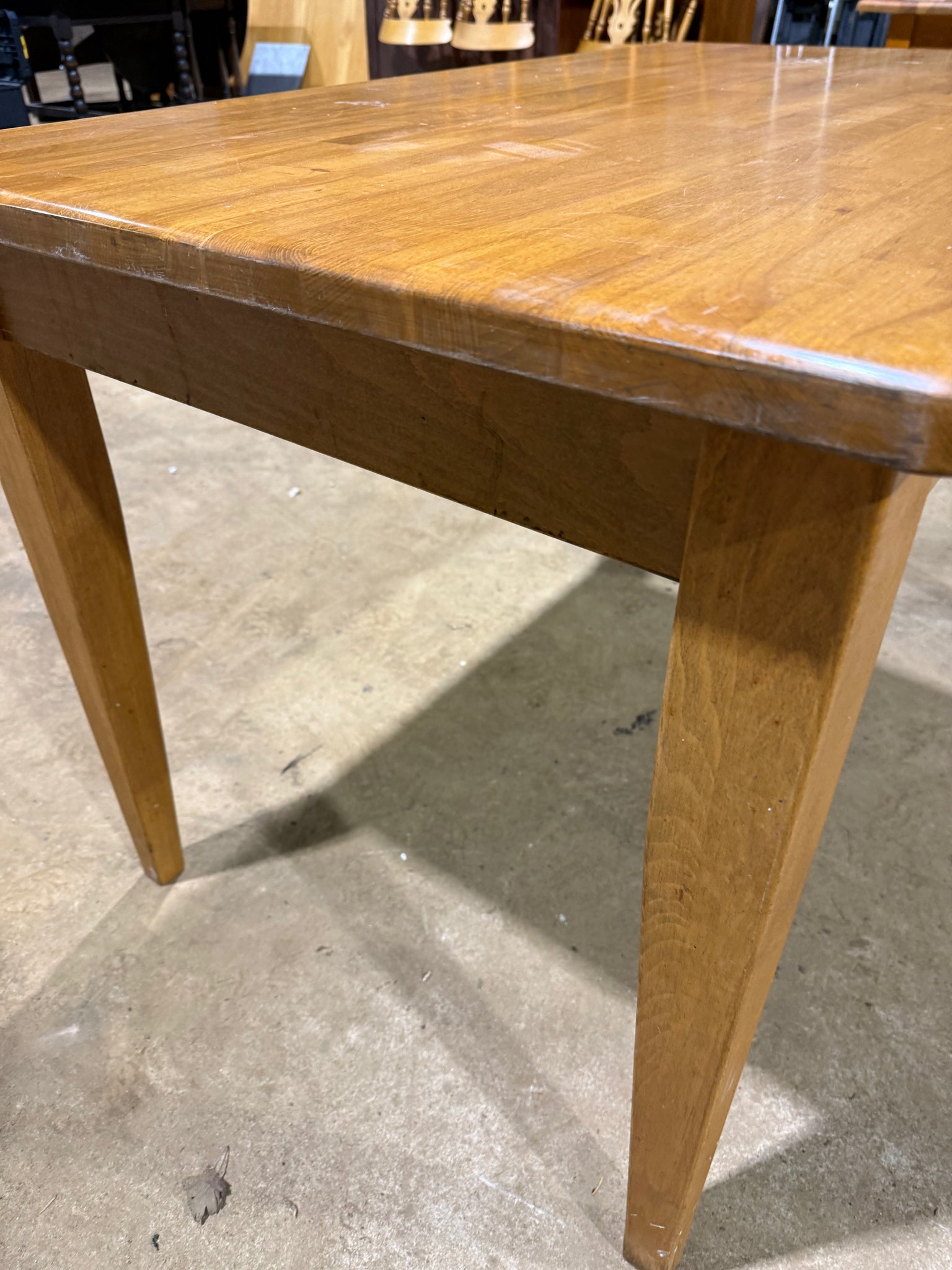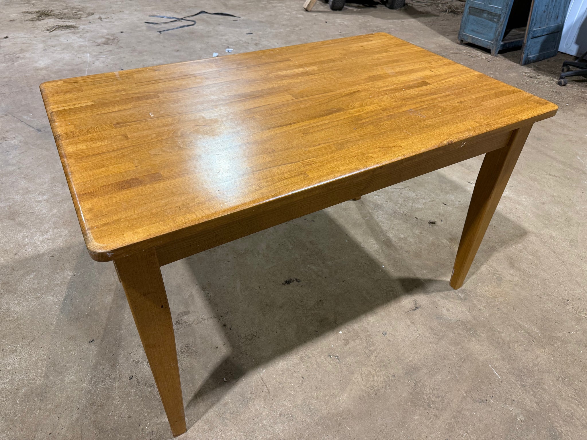 A sturdy oak dining table built to withstand daily use and entertaining. This solid wood piece seats 4-6 guests comfortably and maintains its structural integrity despite showing the natural wear of a well-loved home. Surface marks are minimal and consistent with its pre-owned status. A dependable choice for families seeking authentic furniture with genuine character and lasting value.