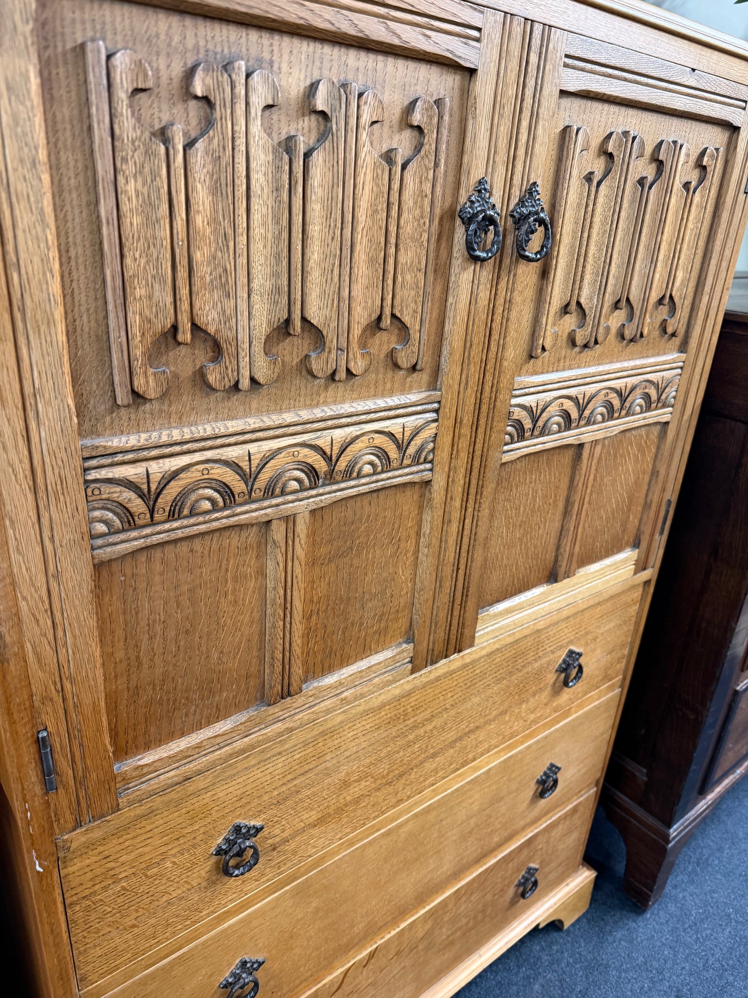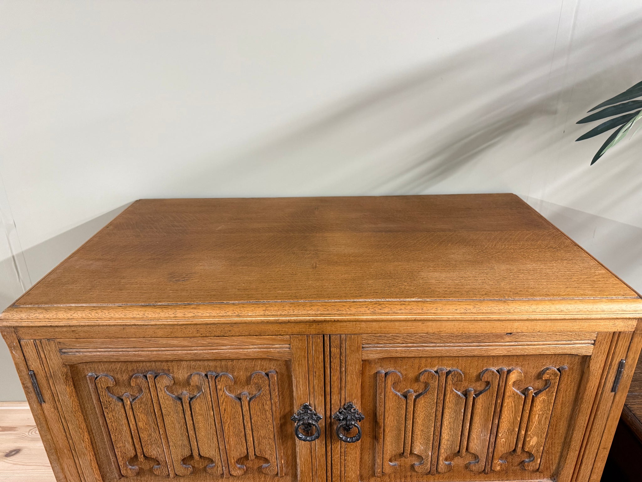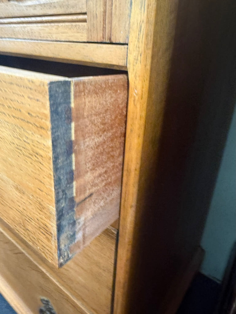 Crafted from oak, this elegant drinks cabinet combines timeless style with practical storage. The piece features a spacious double cupboard with internal shelf, complemented by three dovetail-jointed drawers offering generous room for glassware, bottles, and entertaining essentials. With its sturdy construction and characterful patina, it's a sophisticated addition to any dining room or living space.
