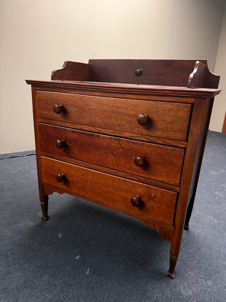 A sturdy oak and mahogany chest of drawers in solid working condition. Features three spacious long drawers ideal for storage. The piece shows minor surface marks consistent with age and use, but remains structurally sound. Its classic design and robust construction make it equally suited to traditional interiors or creative projects, such as conversion into a vanity unit or wash basin.