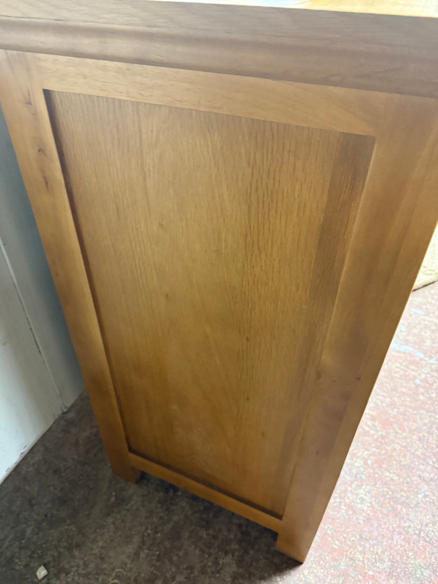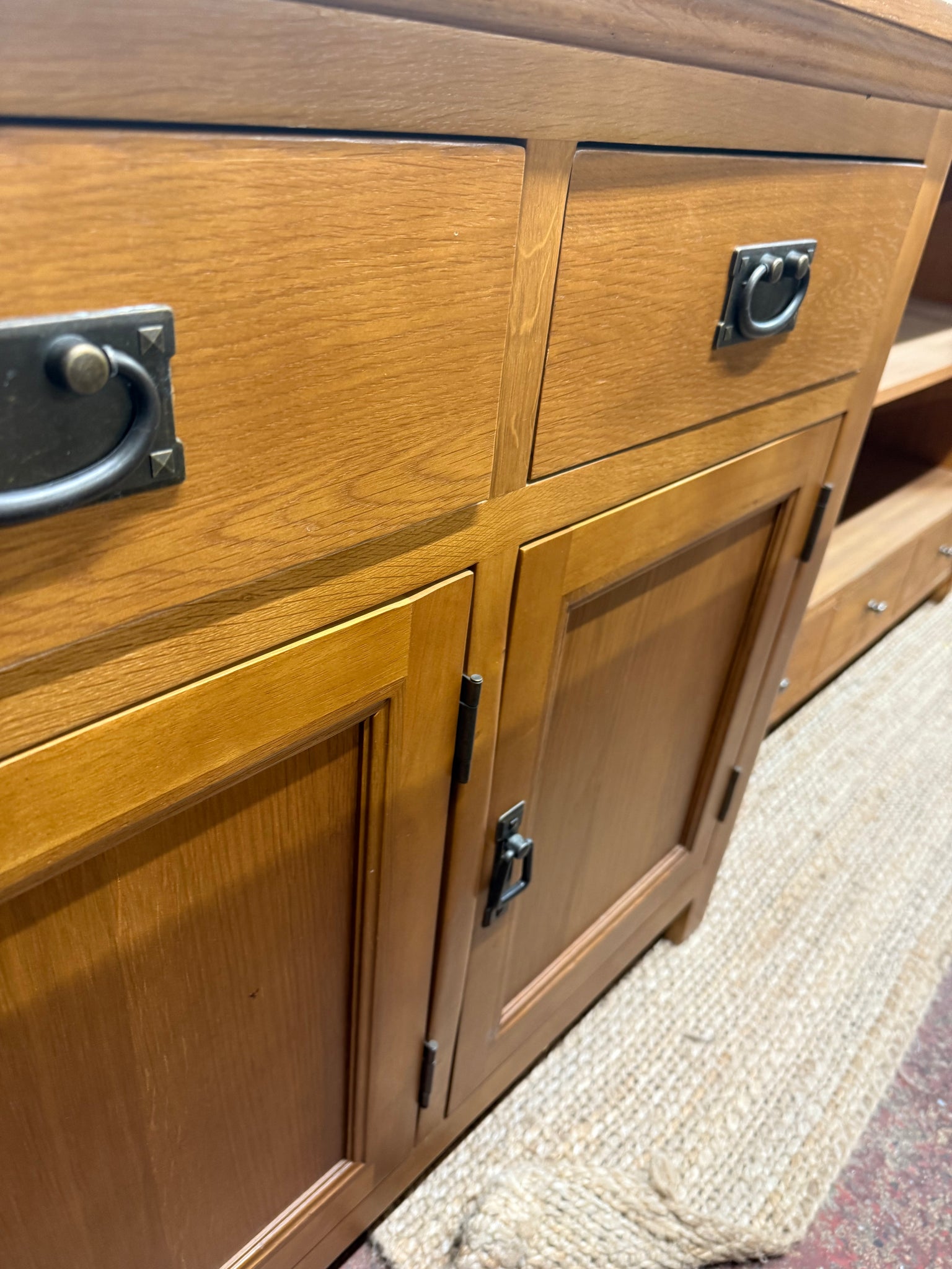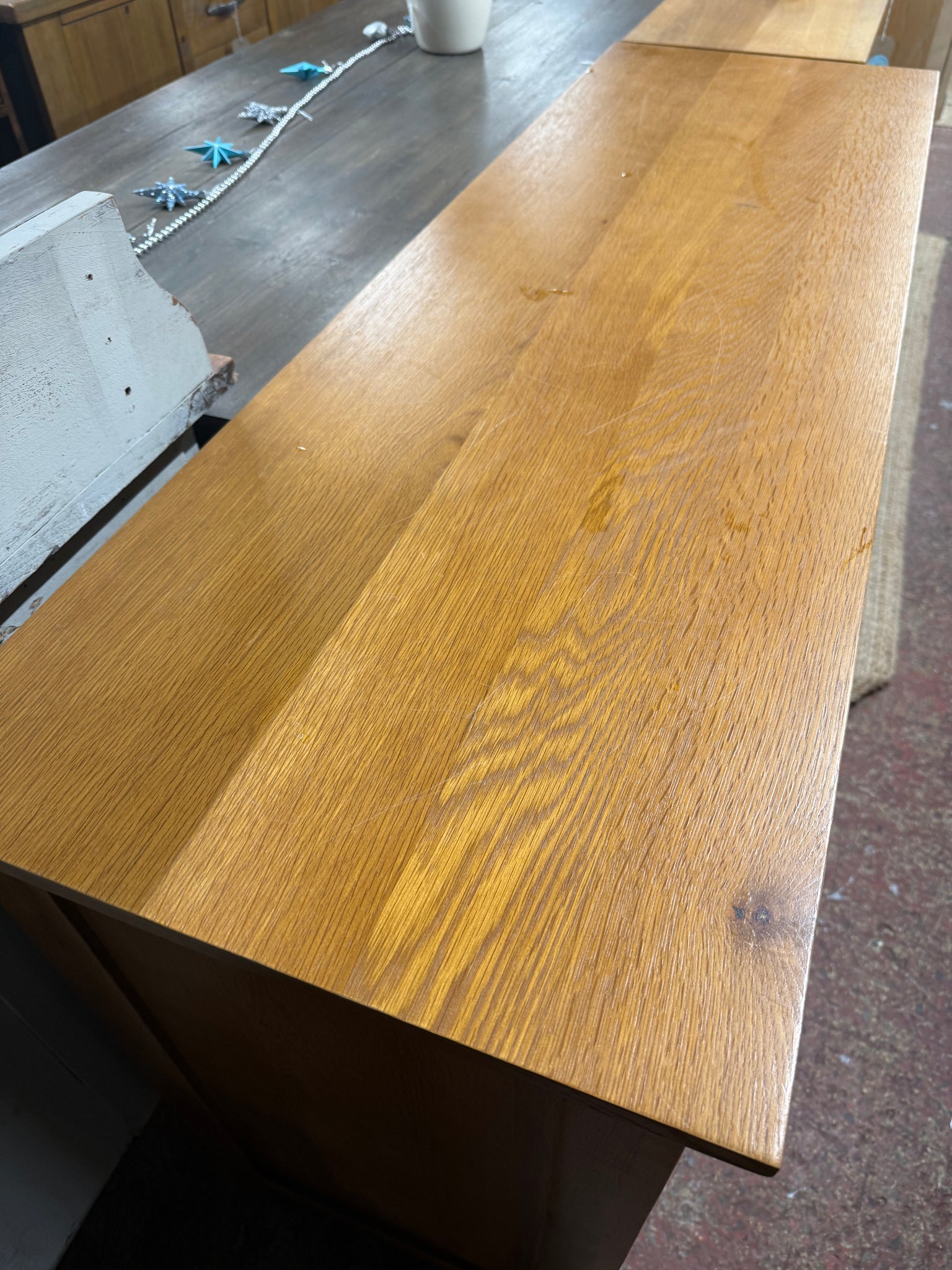 This oak sideboard combines practical storage with understated modern design. Featuring three dovetail-jointed drawers and dual cupboard compartments—one double and one single—it offers versatile space for dining essentials or living room display. The piece shows minor surface marks , yet remains structurally robust and ready for everyday use. A dependable addition to contemporary interiors.
