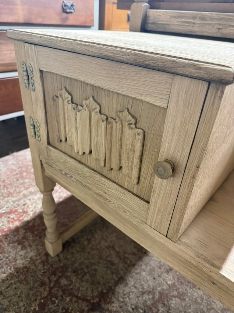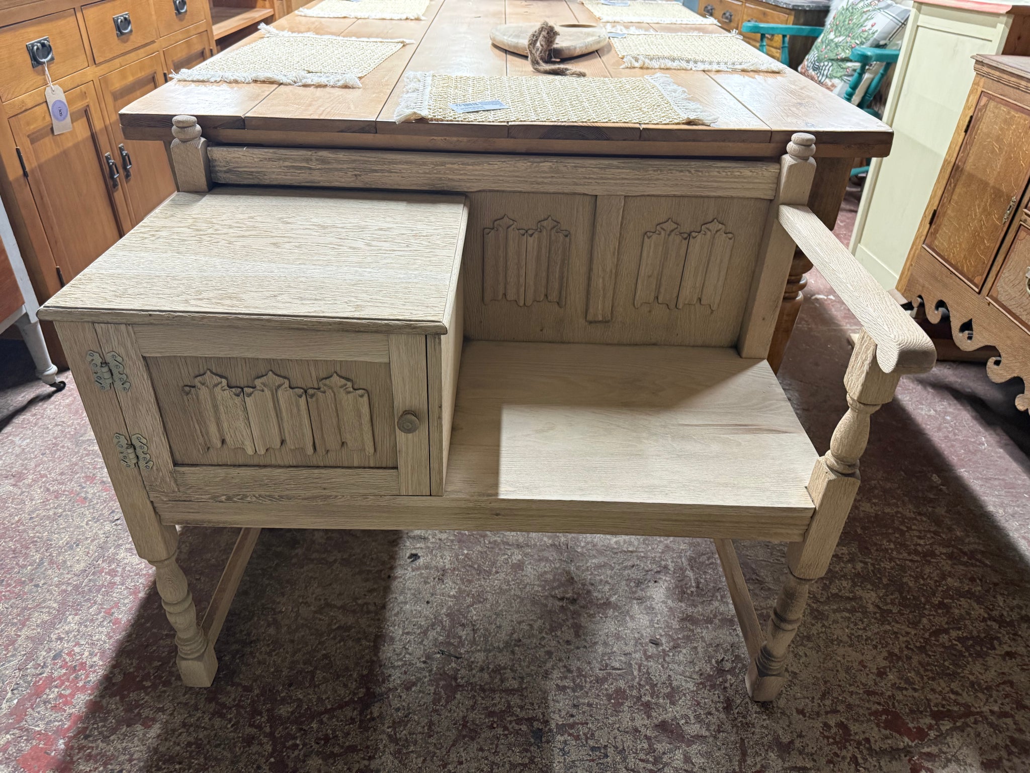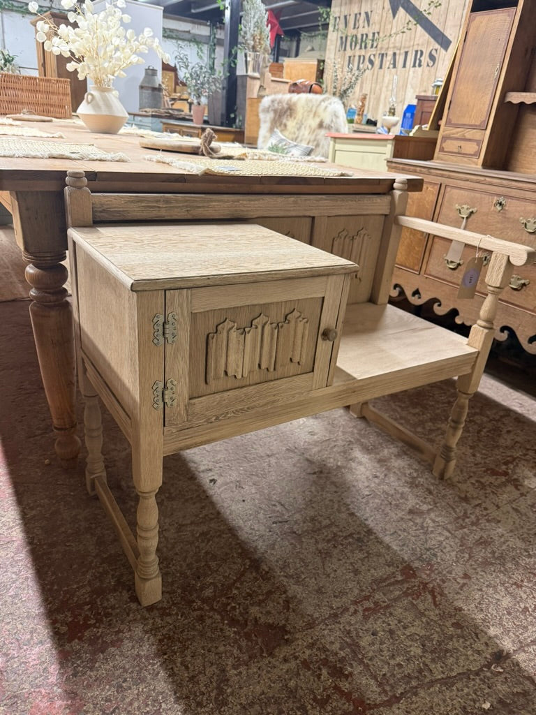 This charming oak telephone seat showcases natural wood grain in its stripped finish, ready for your personal touch with wax if desired. Ideal for entryways and porches, it combines practical seating with concealed storage via its integrated cupboard—perfect for keeping hallway essentials neatly tucked away.