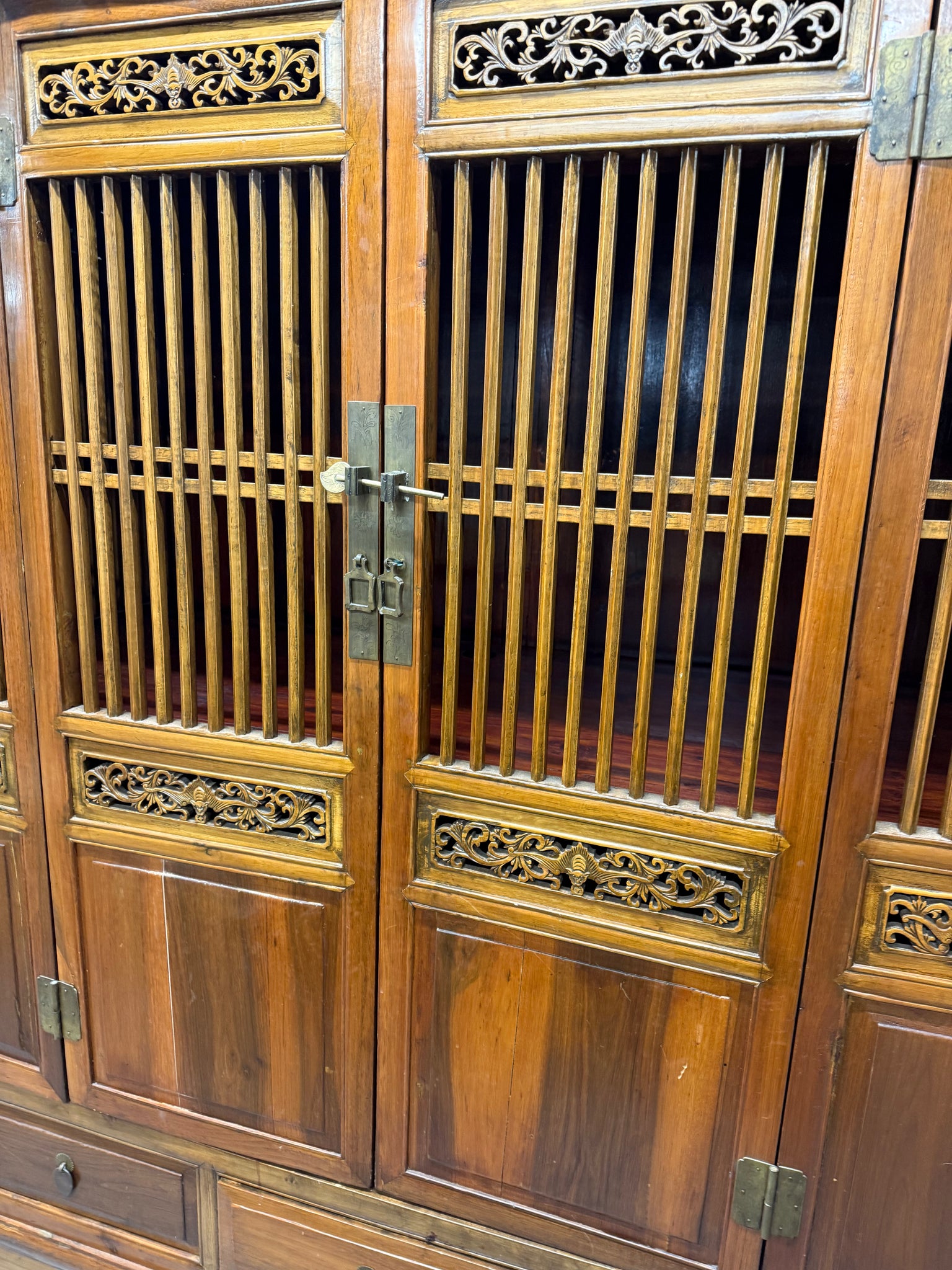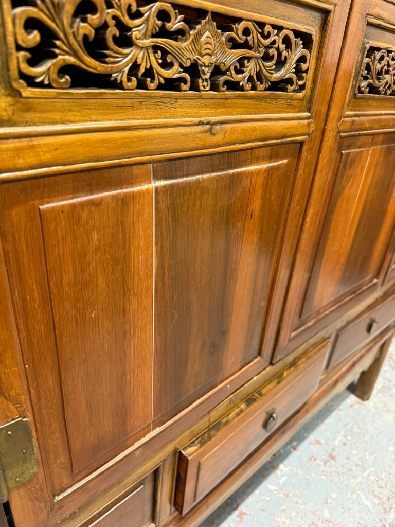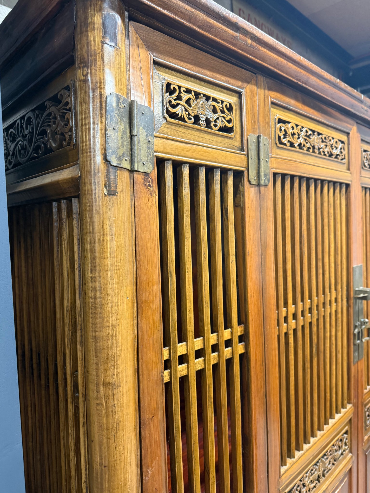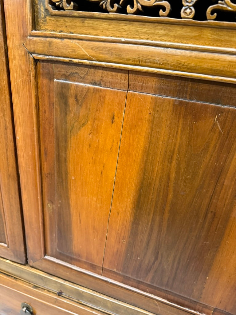 This Oriental Hardwood Cupboard combines practical storage with distinctive character. Built to last, it features a spacious interior with one shelf and two drawers, plus three dovetail-jointed drawers at the base for extra organisation. The piece shows honest signs of use with minor surface marks that add to its authentic appeal. A hanging rail can be installed if required, making it adaptable to your needs. A striking focal point for any room seeking vintage charm and functionality.