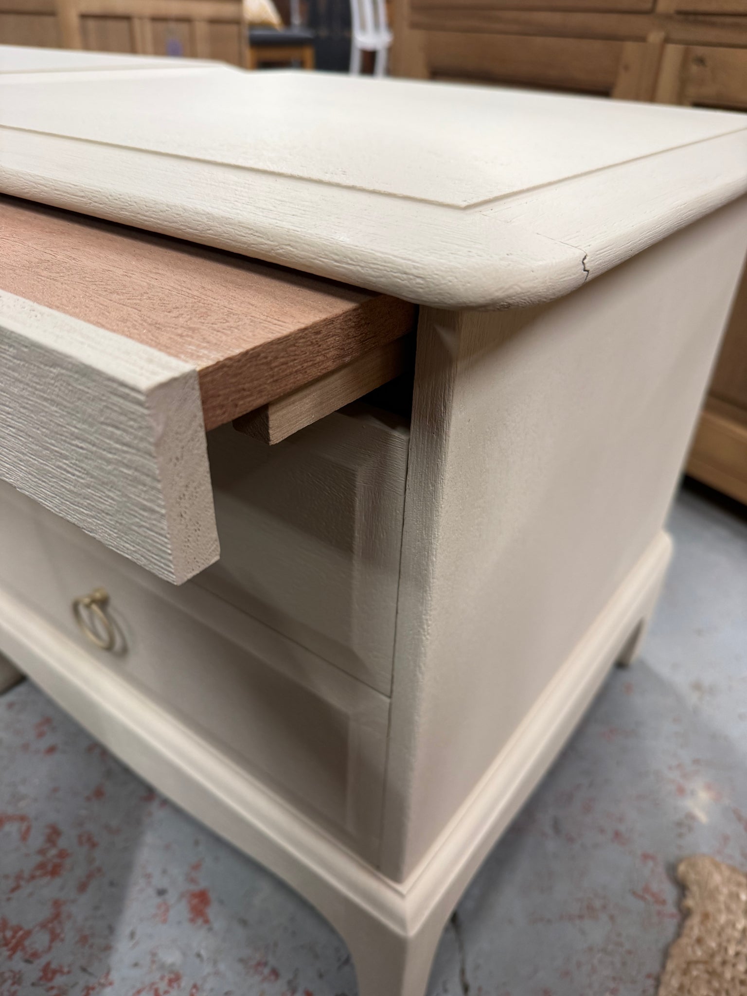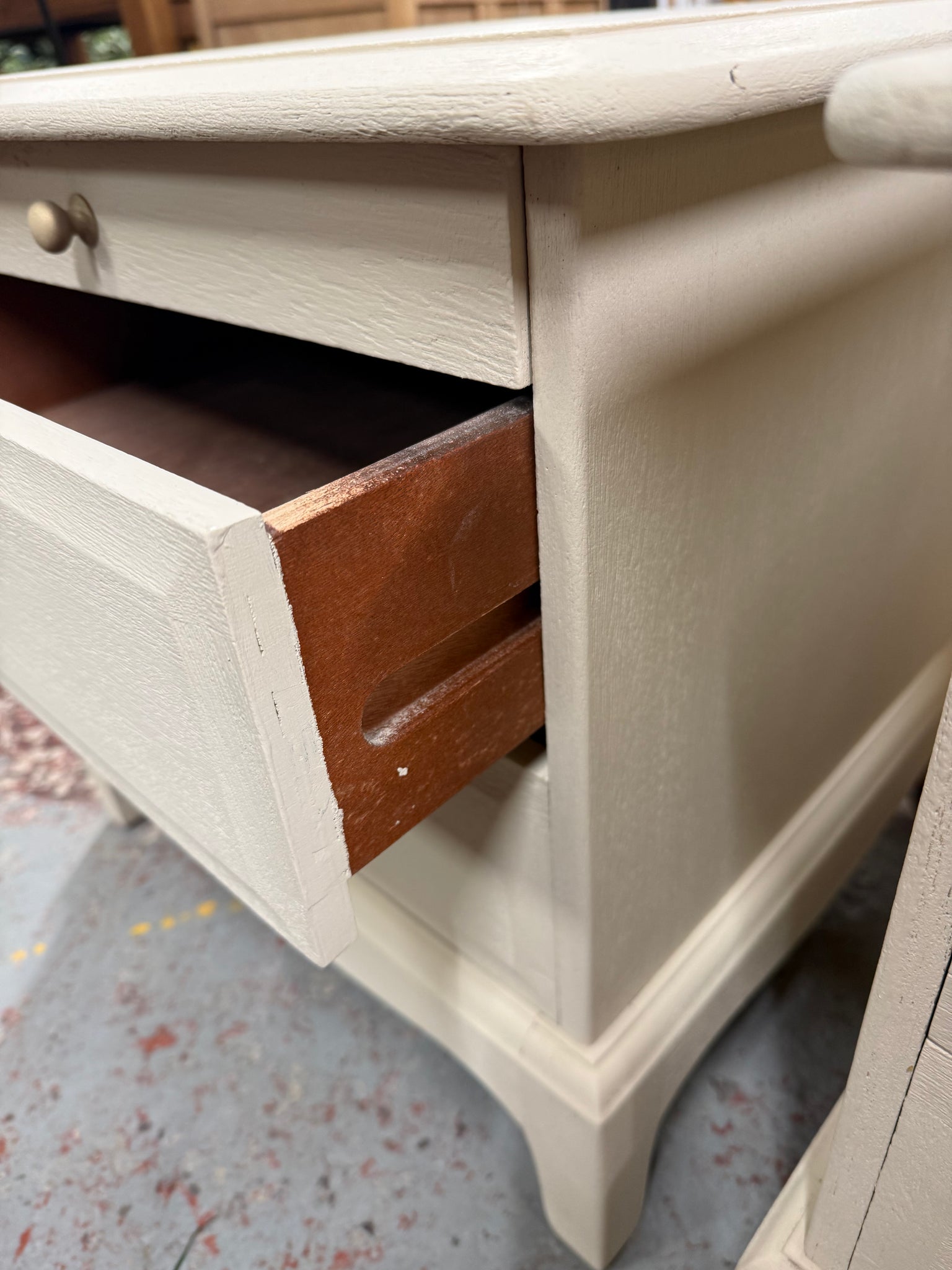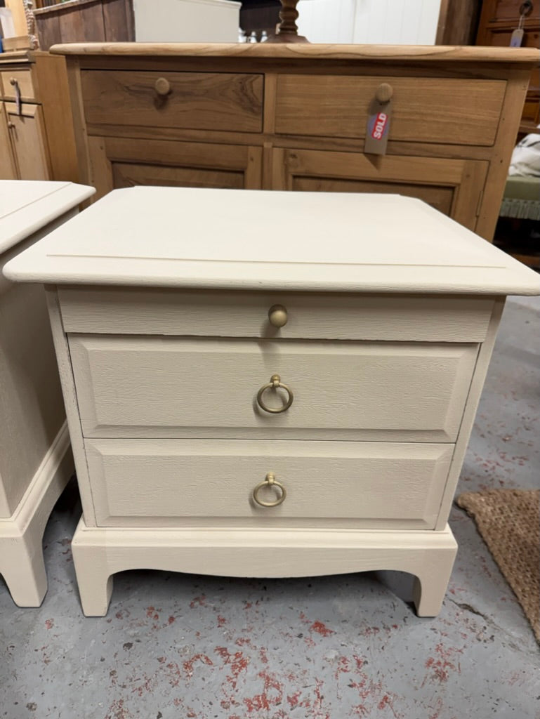 These elegant bedside tables feature Farrow and Ball's Oxford Stone finish, delivering a sophisticated neutral aesthetic to any bedroom. Each unit is equipped with a convenient pull-out tray and two dovetail-jointed drawers for practical storage. Well-maintained and structurally robust, these Stag pieces offer timeless style with reliable functionality.