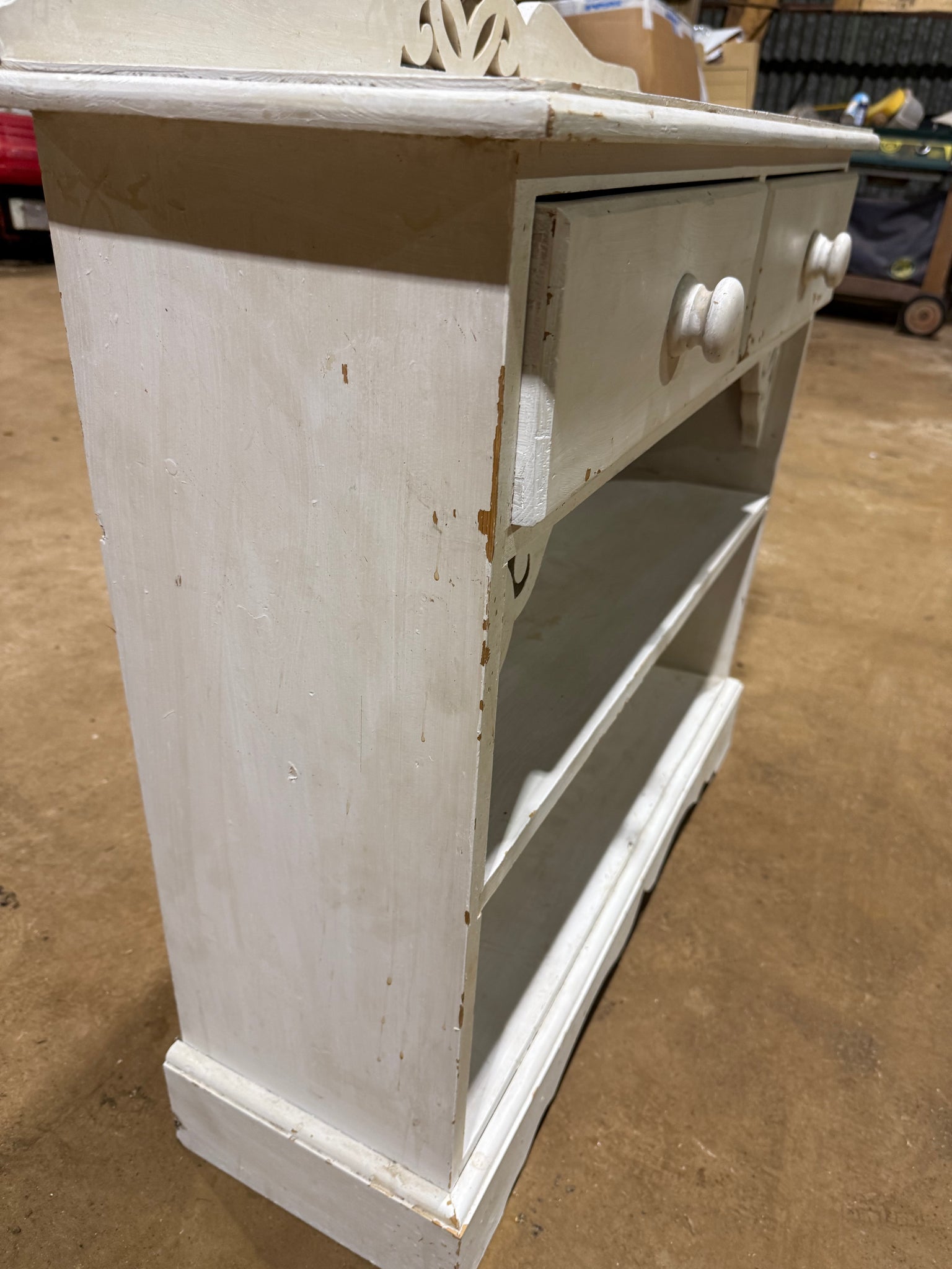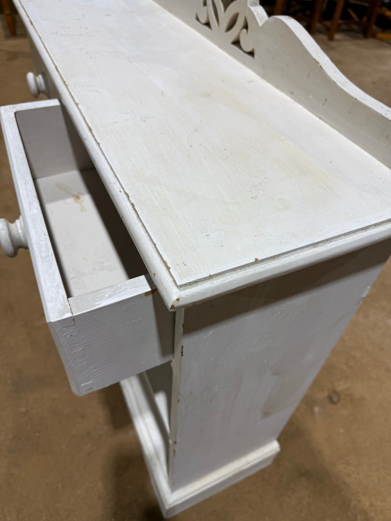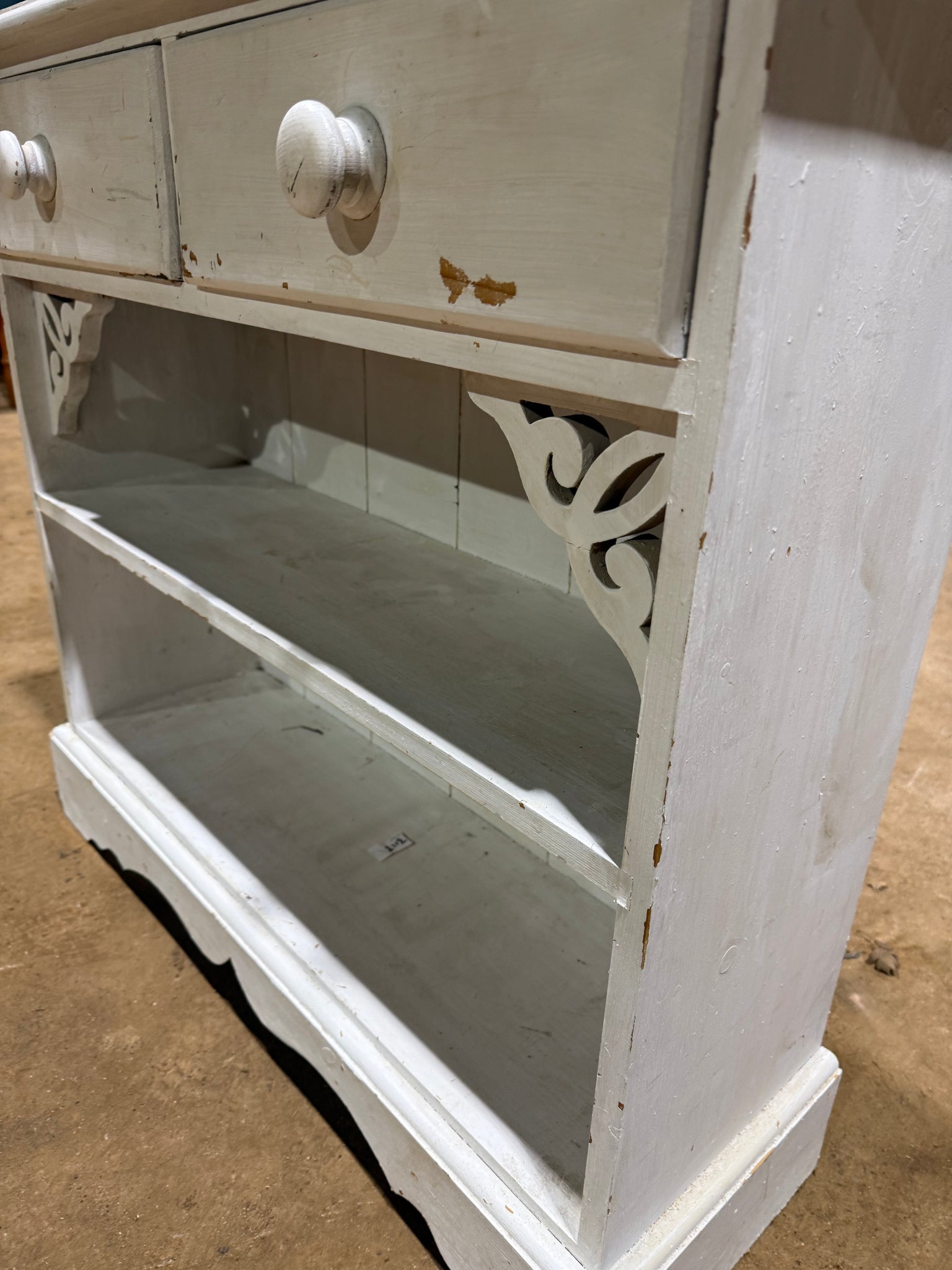 A charming solid pine bookcase with character and potential. Currently finished in white paint that shows its age, this piece features practical storage with two dovetail-jointed drawers and a single shelf. Perfect for those looking to restore a vintage find or refresh with a new colour scheme of their choice.