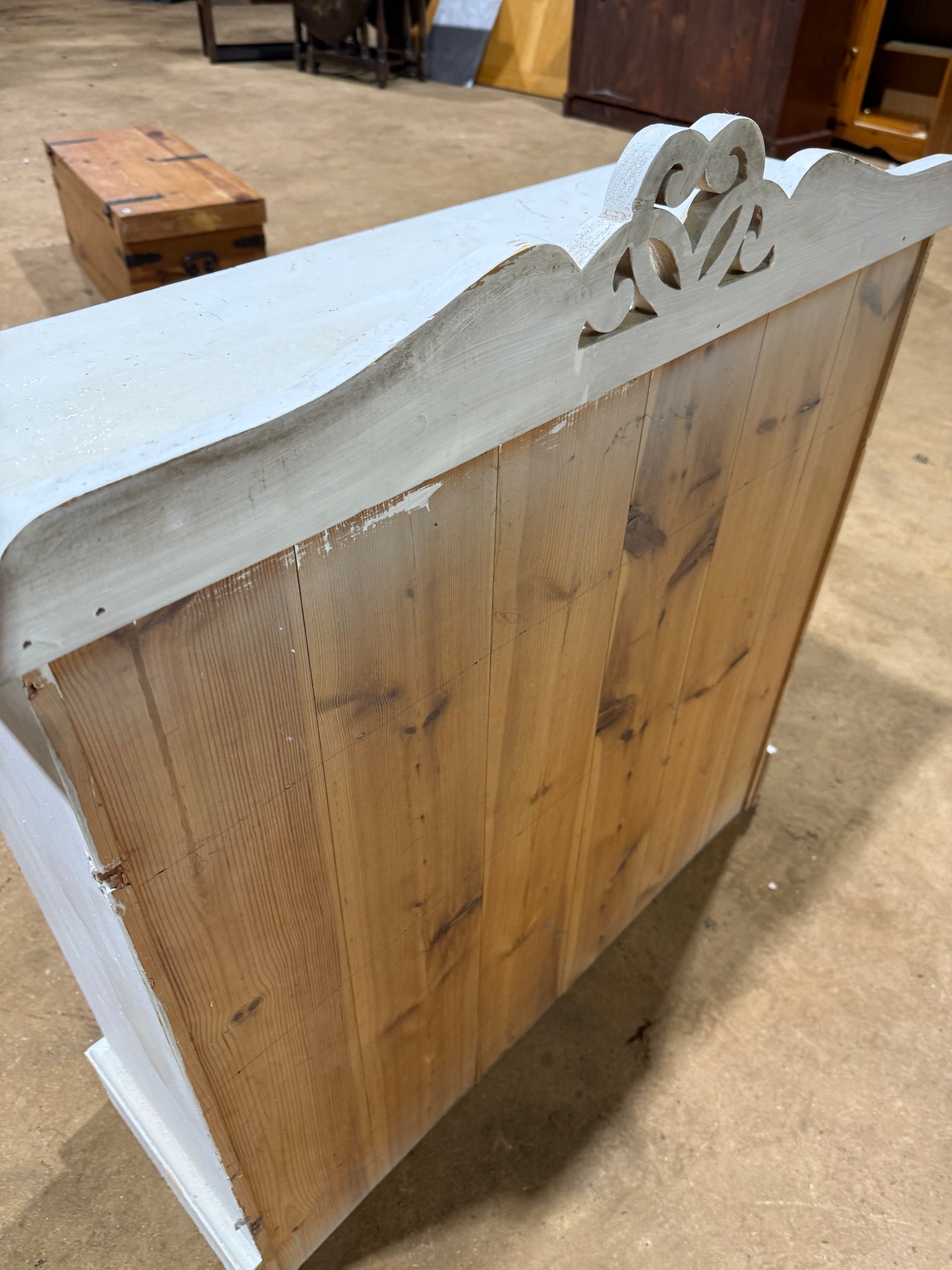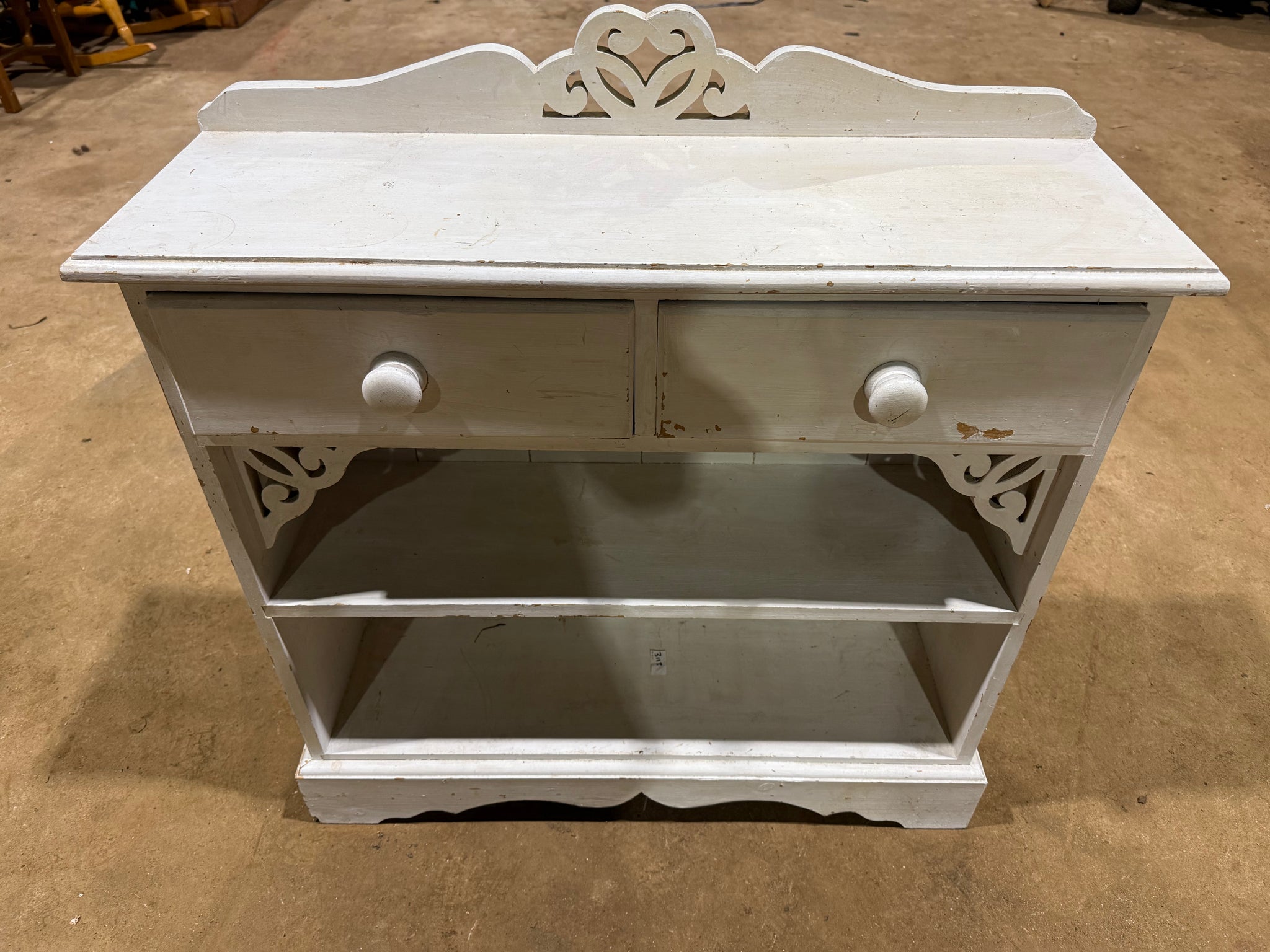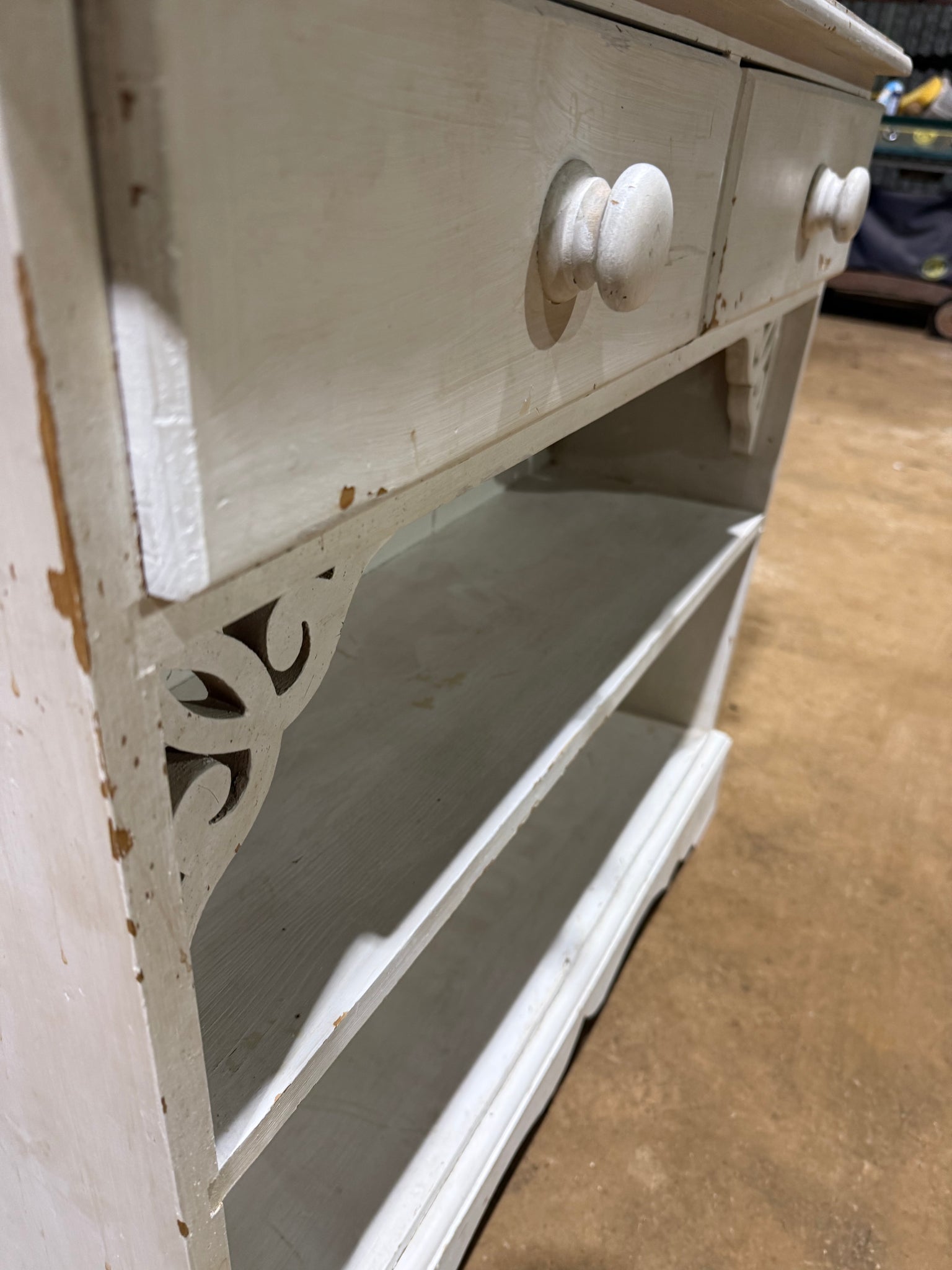 A charming solid pine bookcase with character and potential. Currently finished in white paint that shows its age, this piece features practical storage with two dovetail-jointed drawers and a single shelf. Perfect for those looking to restore a vintage find or refresh with a new colour scheme of their choice.