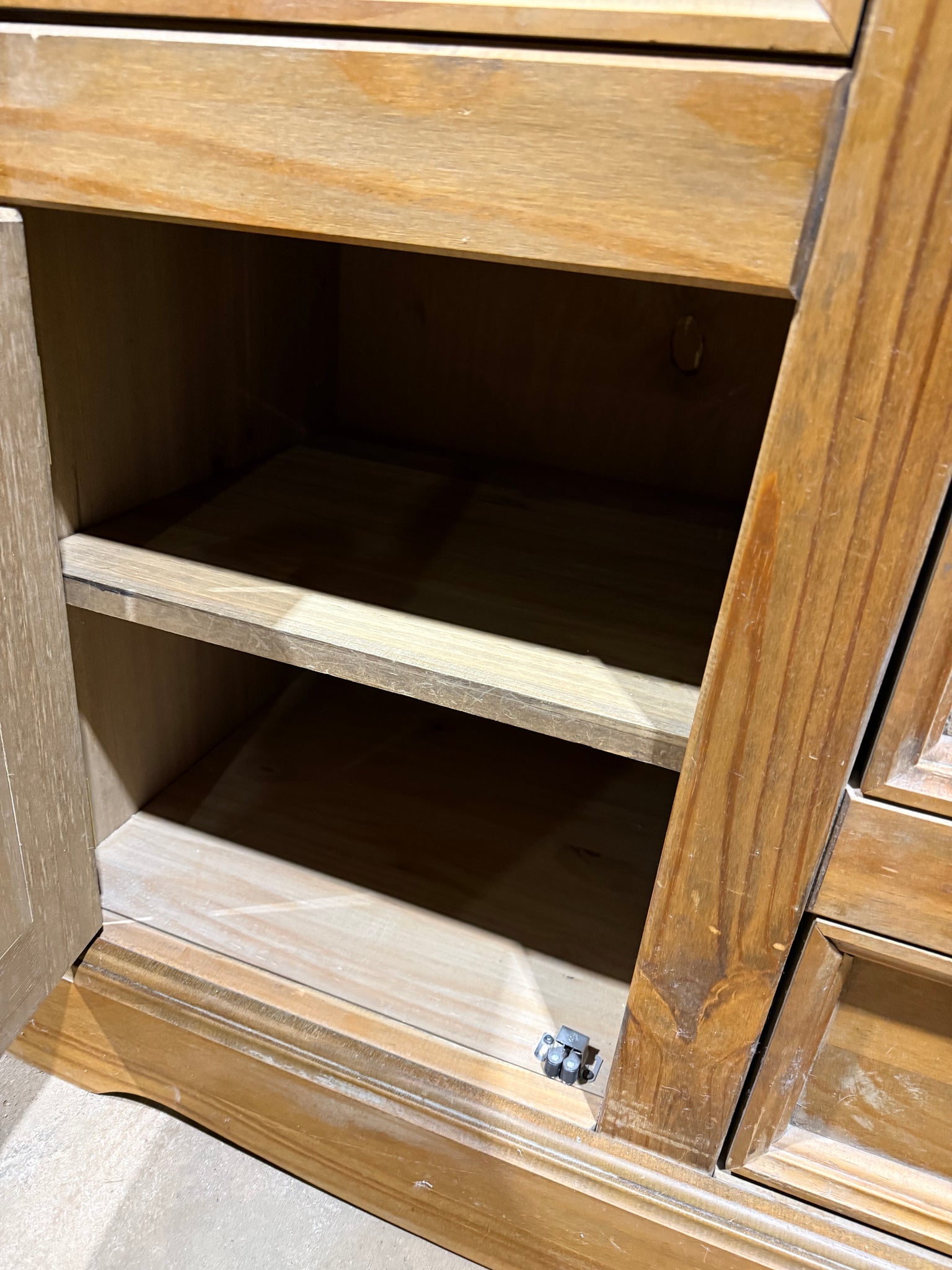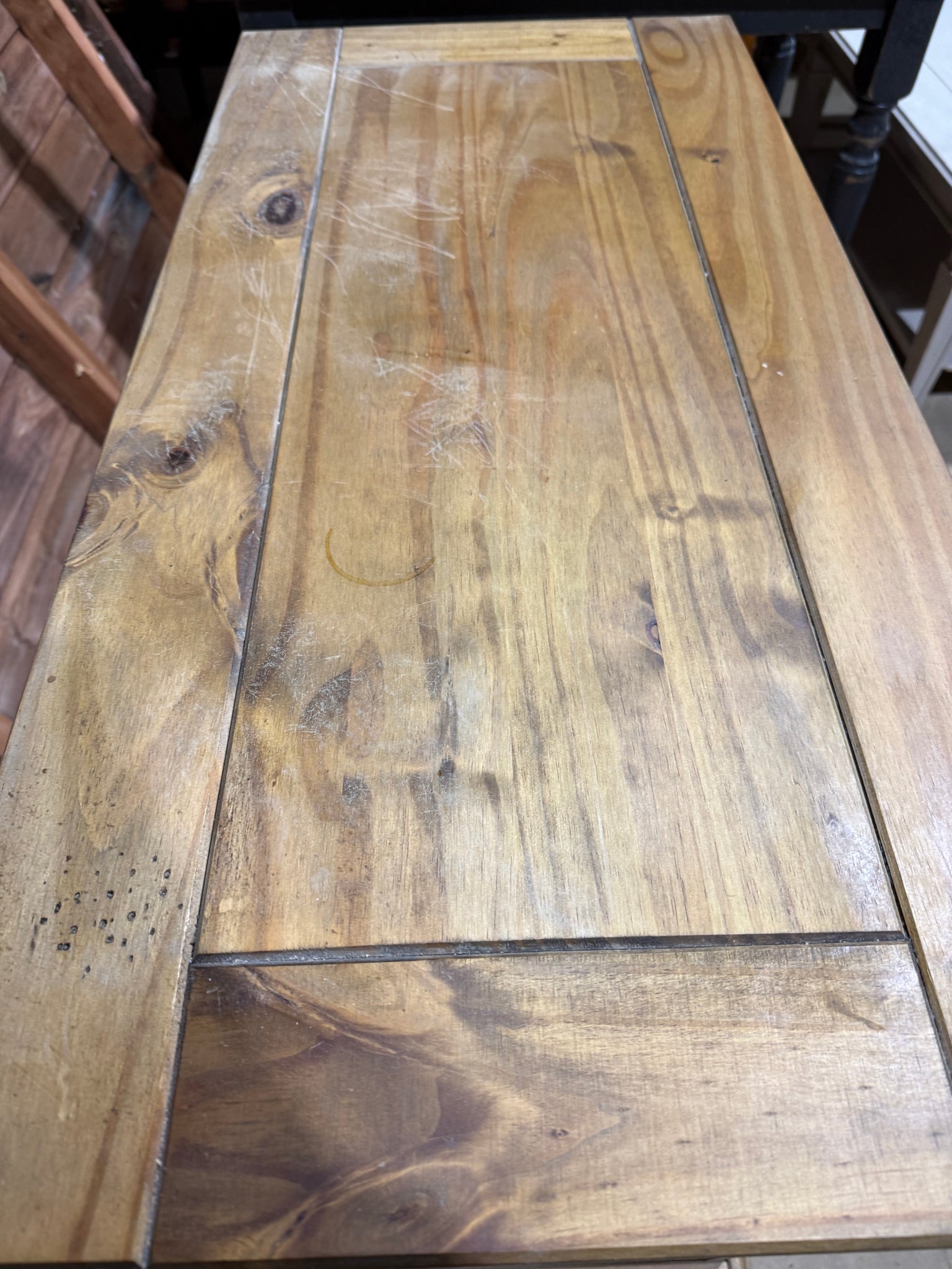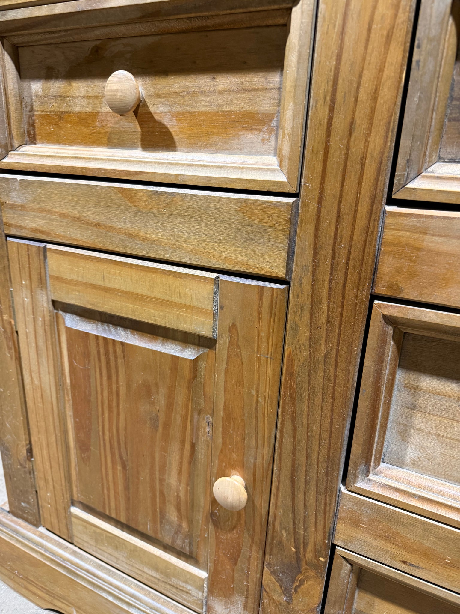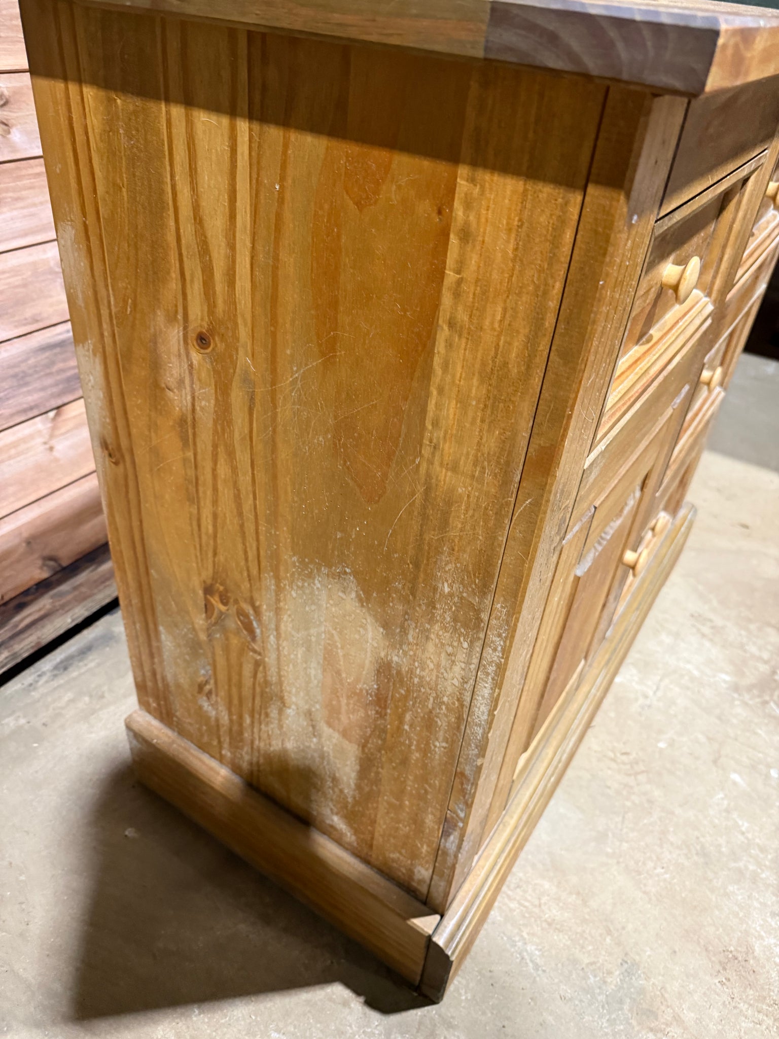 A sturdy pine sideboard offering practical storage with four short drawers and one enclosed cupboard. While the piece shows signs of use with surface marks, these can be easily refreshed with wax or polish. Solidly constructed and ready for everyday use.