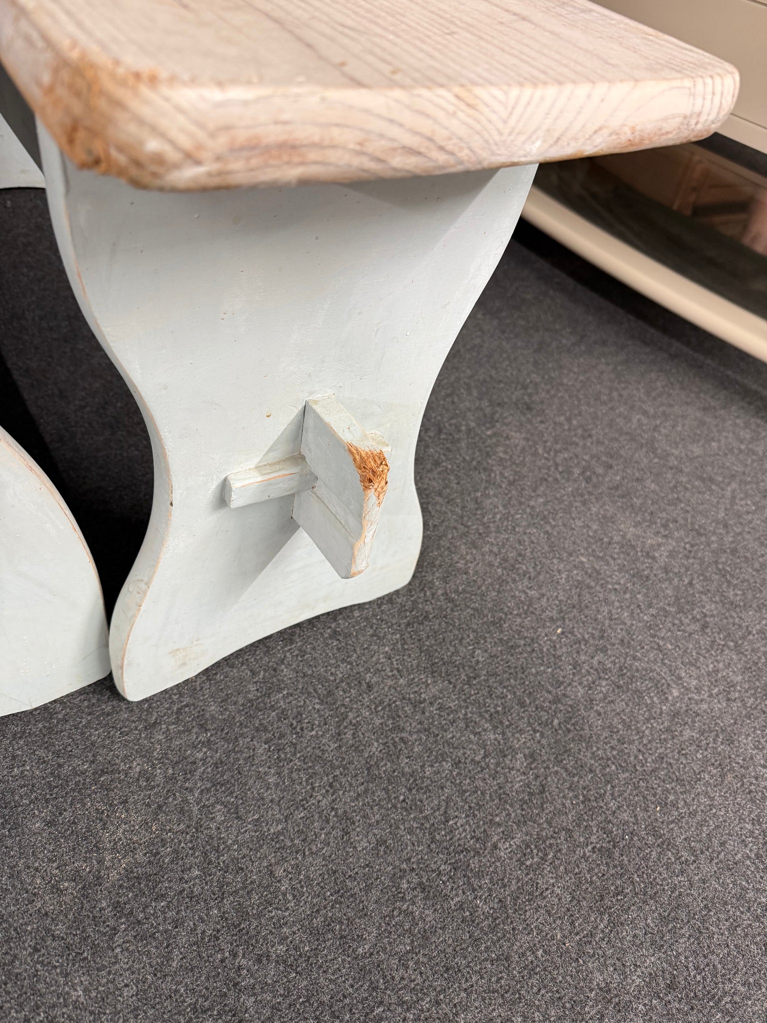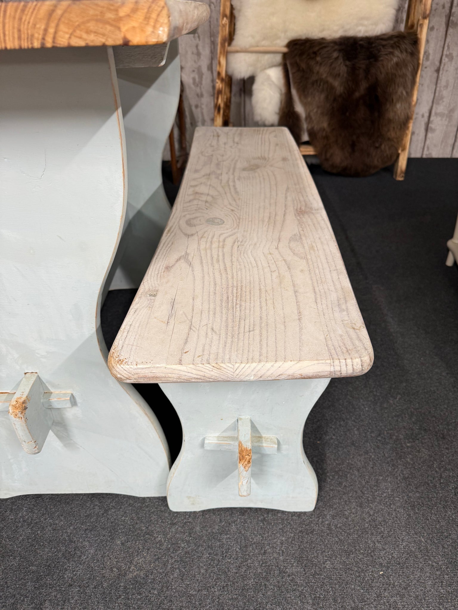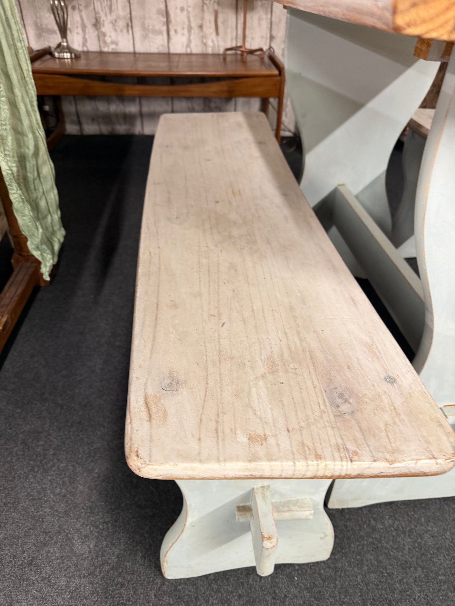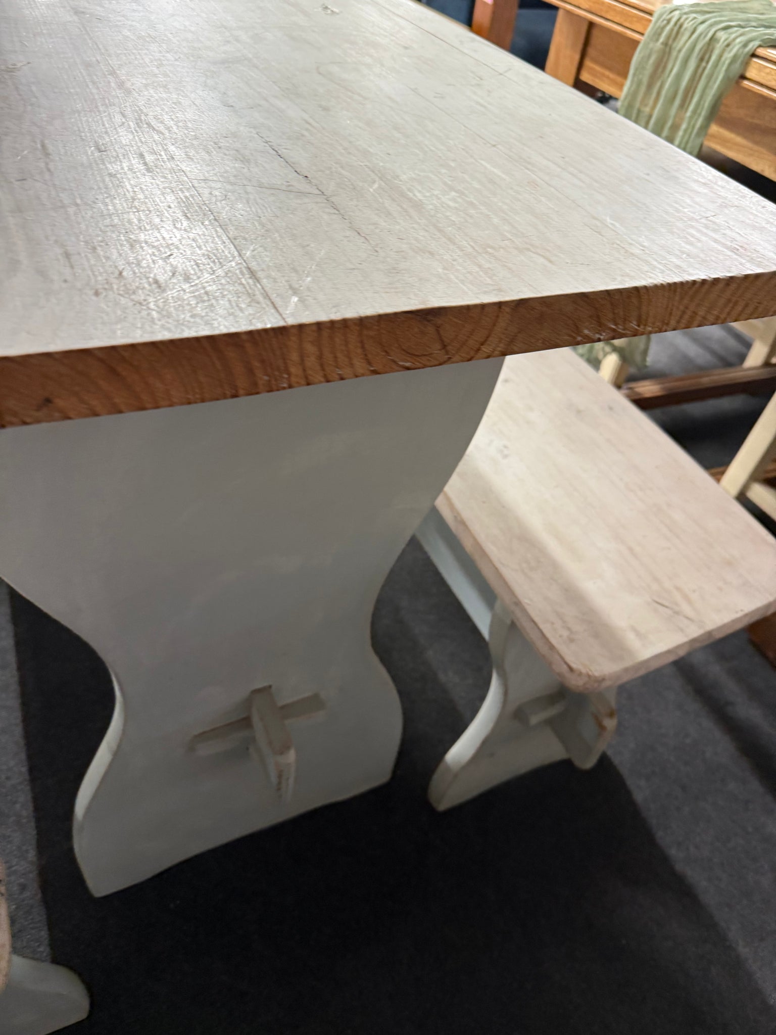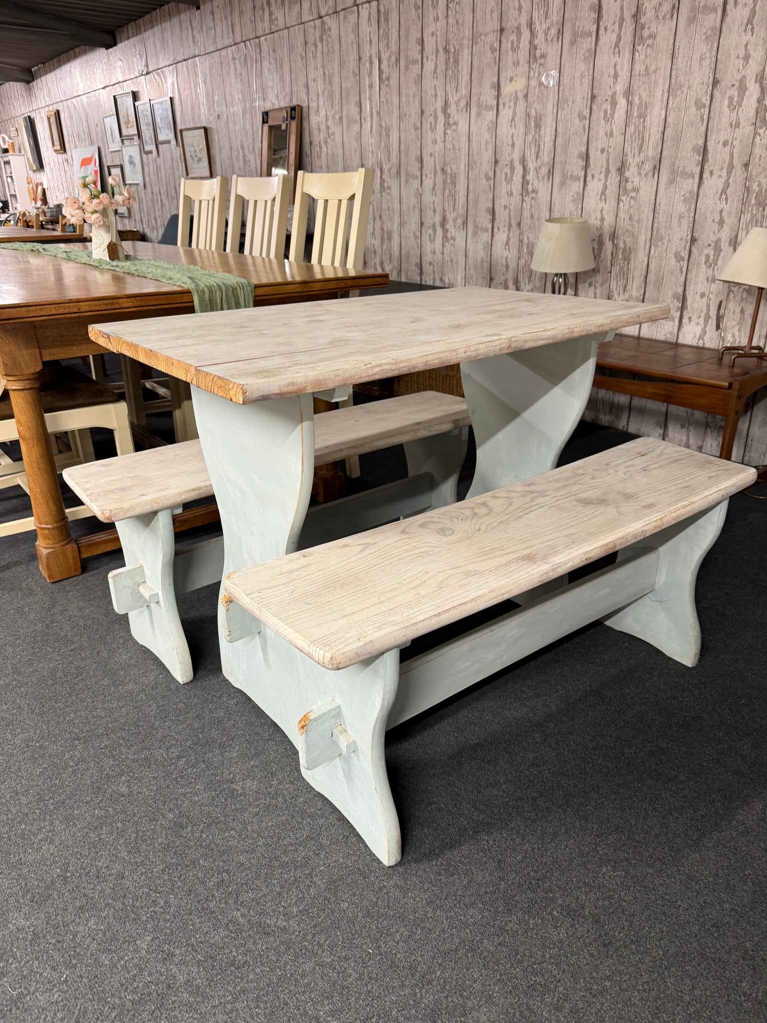 Charming pine dining set featuring a sturdy table and matching benches, perfect for seating four. This piece has some minor surface marks such as slight chewing marks and a panel that needs slight attention to the table top but nothing major. The construction remains fully functional, making it an excellent choice for those seeking rustic appeal with practical everyday use. Ideal for families or smaller dining spaces seeking warmth and durability.