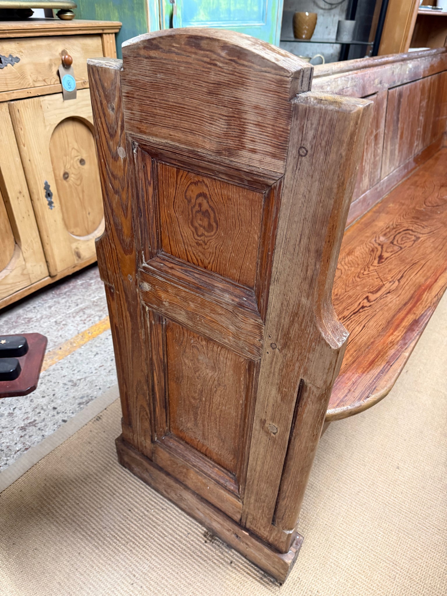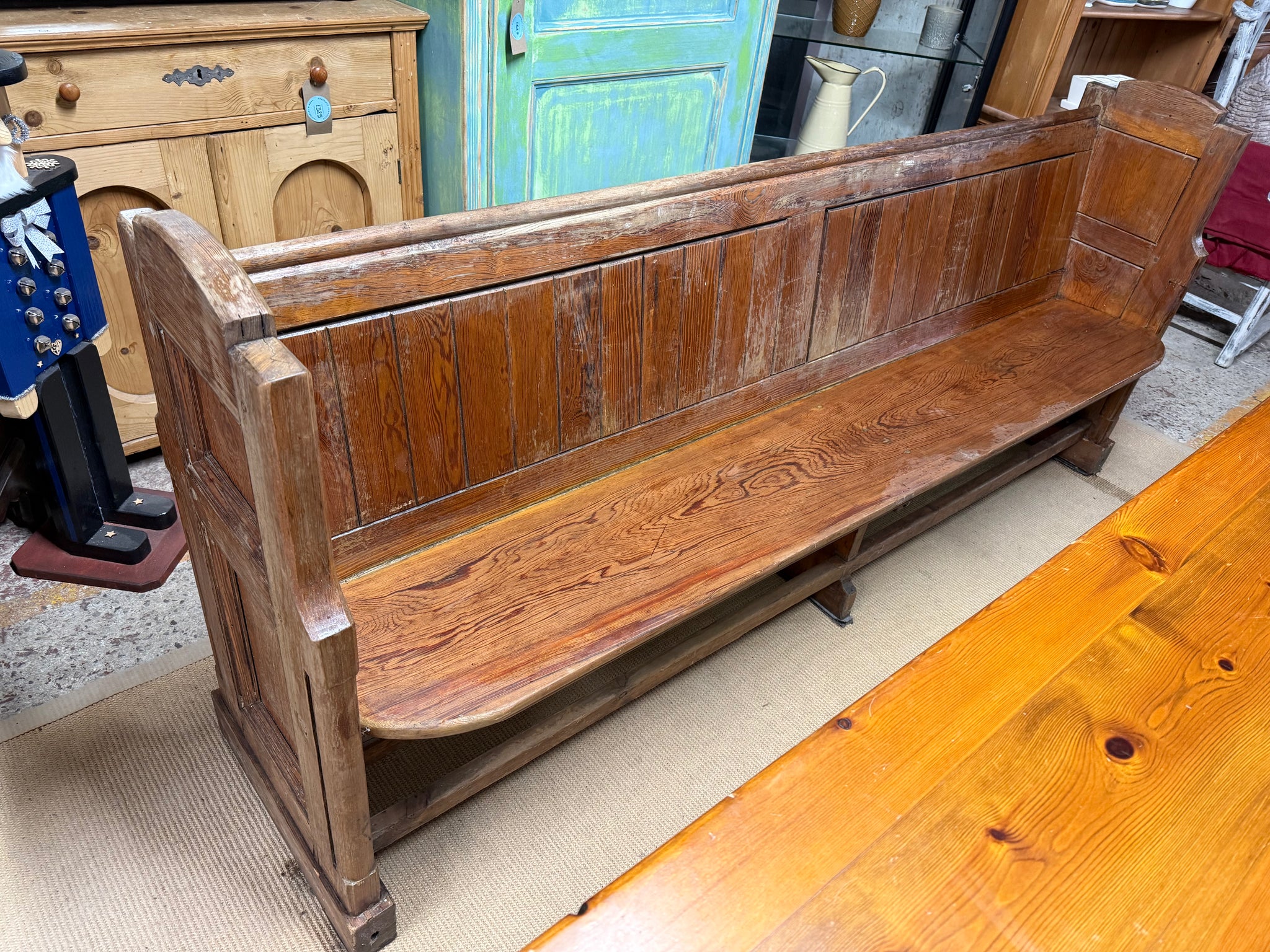 A characterful Pitch Pine Pew with solid construction and reliable condition. Showing its age with surface marks and patina, this piece retains genuine charm and simply needs some care to restore its lustre. Comfortably accommodates four to five people, making it an excellent choice for dining spaces, hallways, or period interiors seeking authentic vintage appeal.