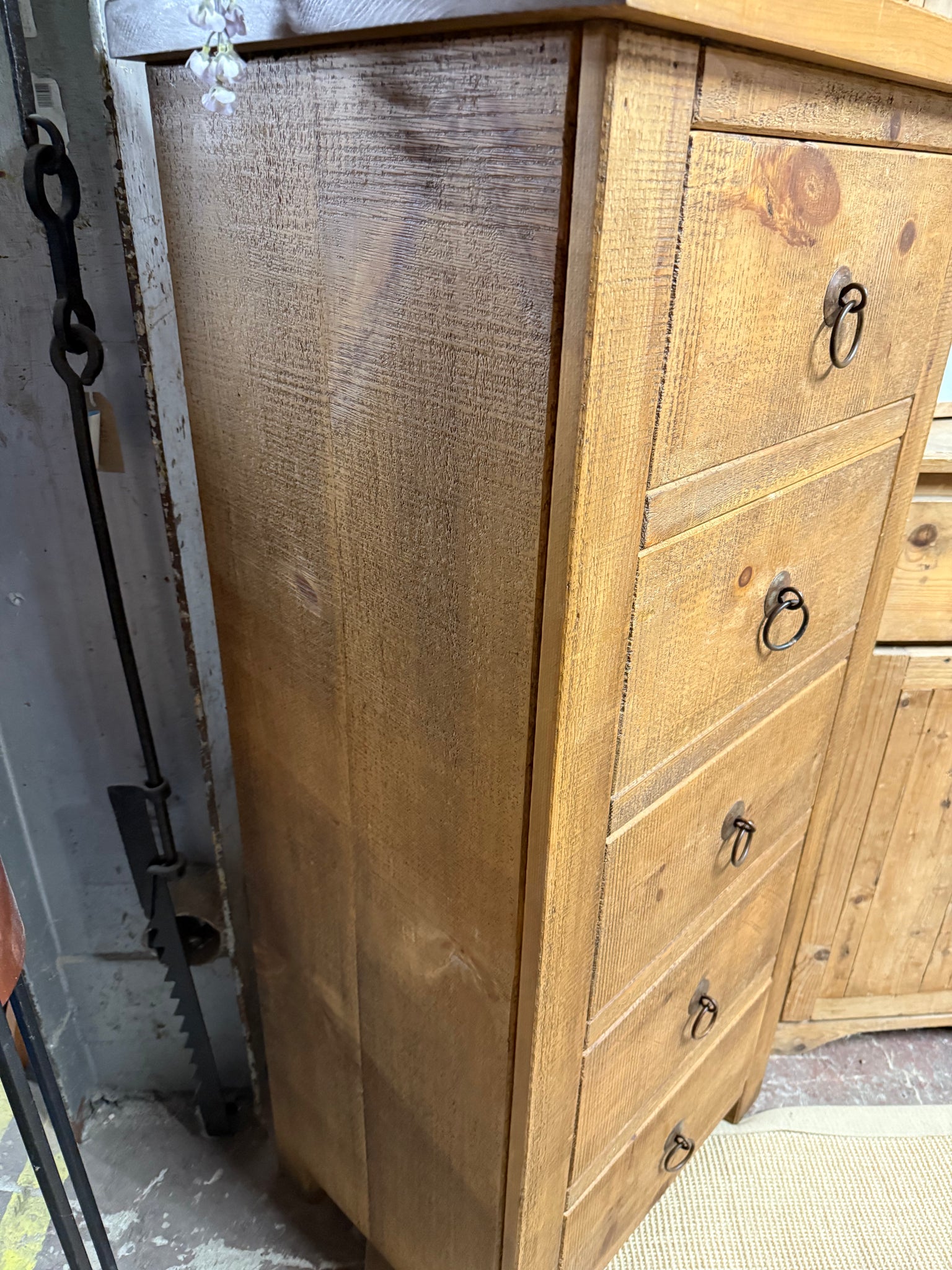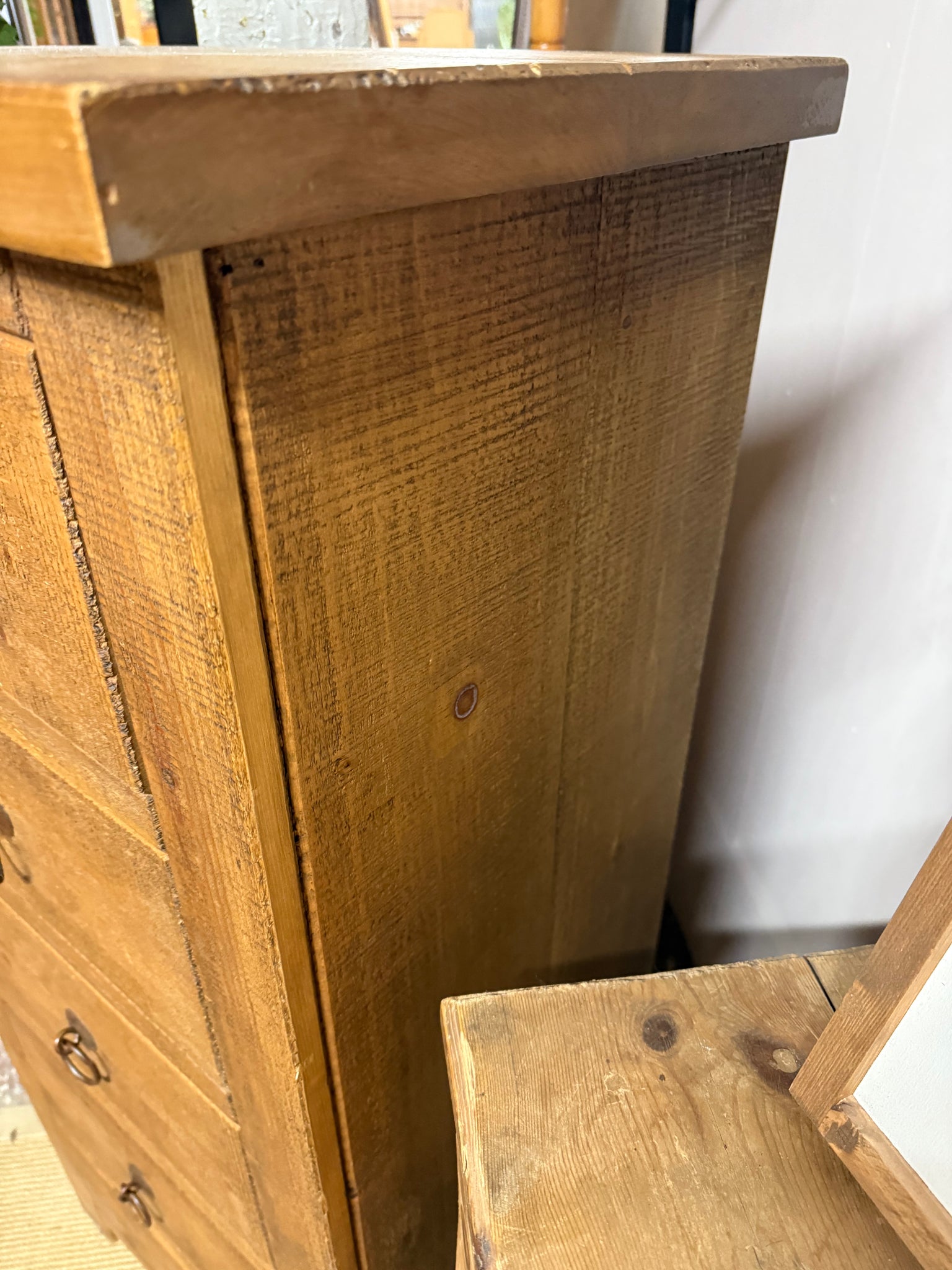 Discover the timeless appeal of this solid wooden tallboy with beautiful rustic planking that adds authentic charm to your space. Crafted with quality dovetail joinery, its five spacious drawers provide excellent storage solutions for any room. This sturdy piece is in wonderful condition with only minor cosmetic wear, making it a delightful find for those who appreciate character and craftsmanship.