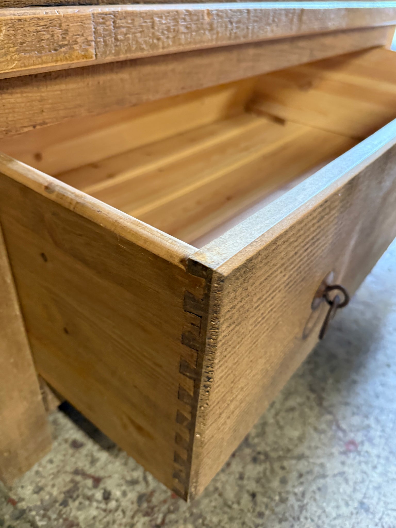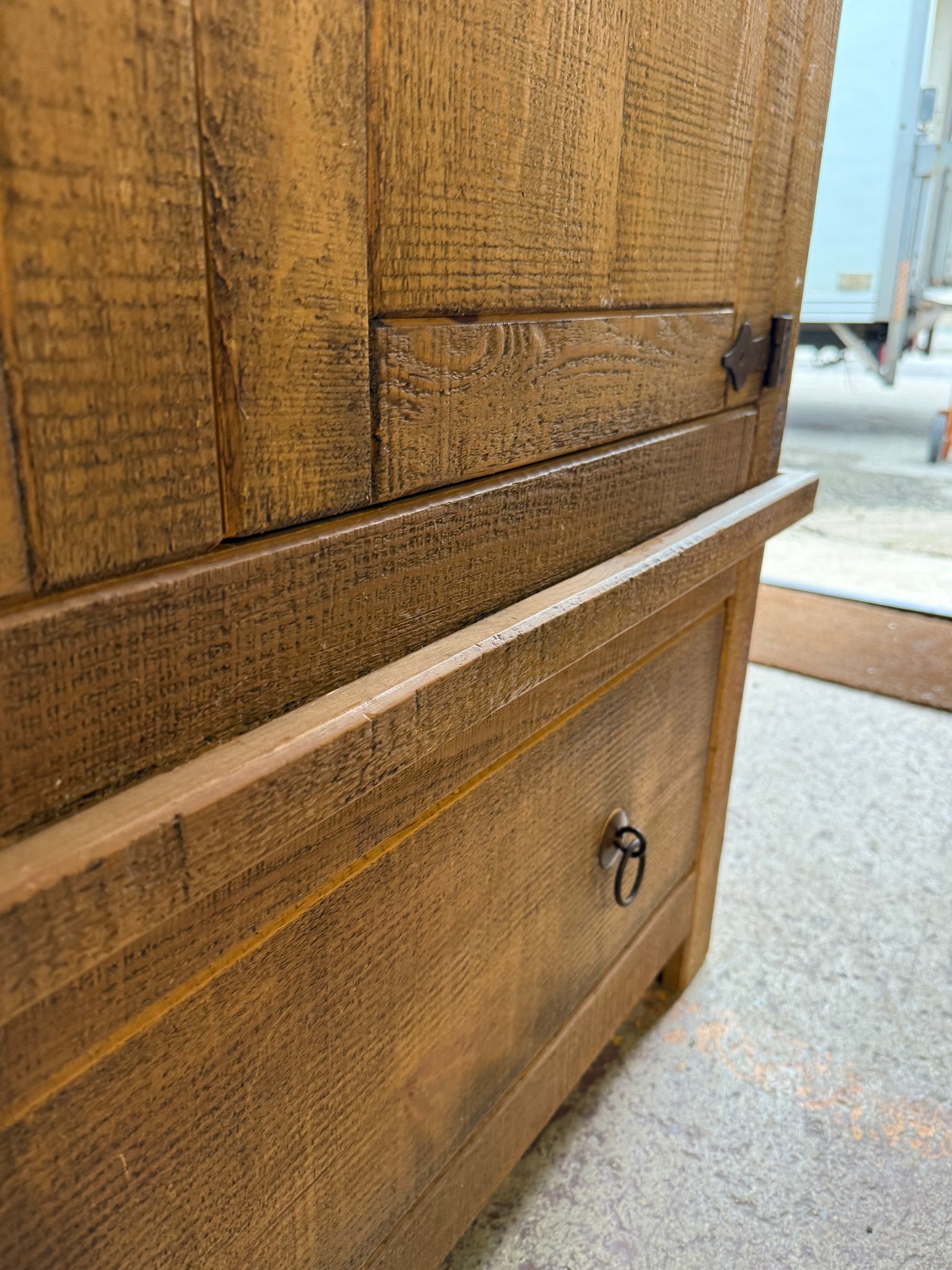 A charming solid wood wardrobe with authentic rustic character, featuring a spacious hanging rail and a beautifully crafted dovetail-jointed drawer for convenient storage. Well-loved and gently worn, this piece carries the natural patina of age with only minor marks that add to its vintage appeal. Designed for practicality, it separates into two sections for hassle-free transport and placement. Perfect for adding warmth and functionality to any bedroom.
