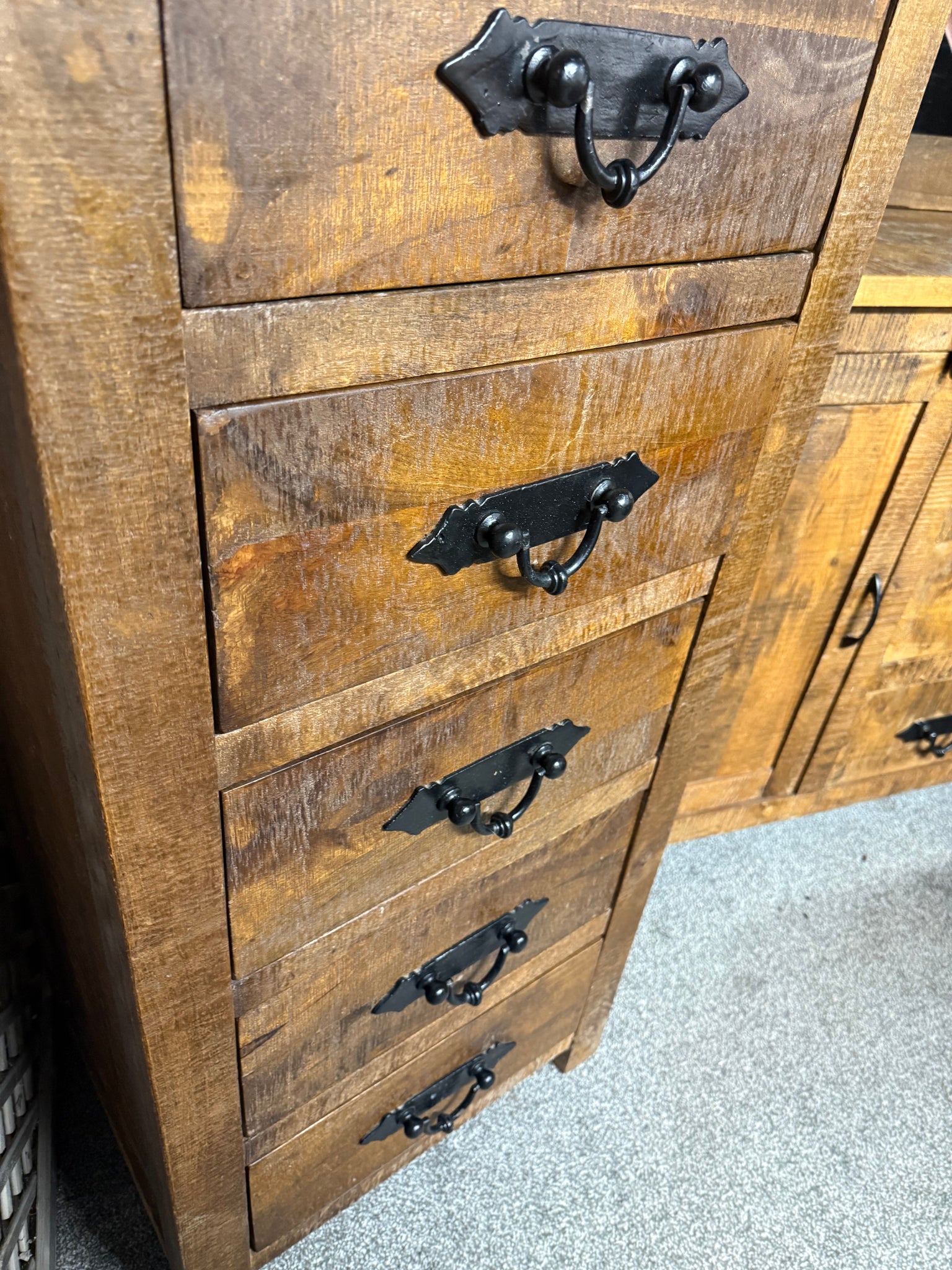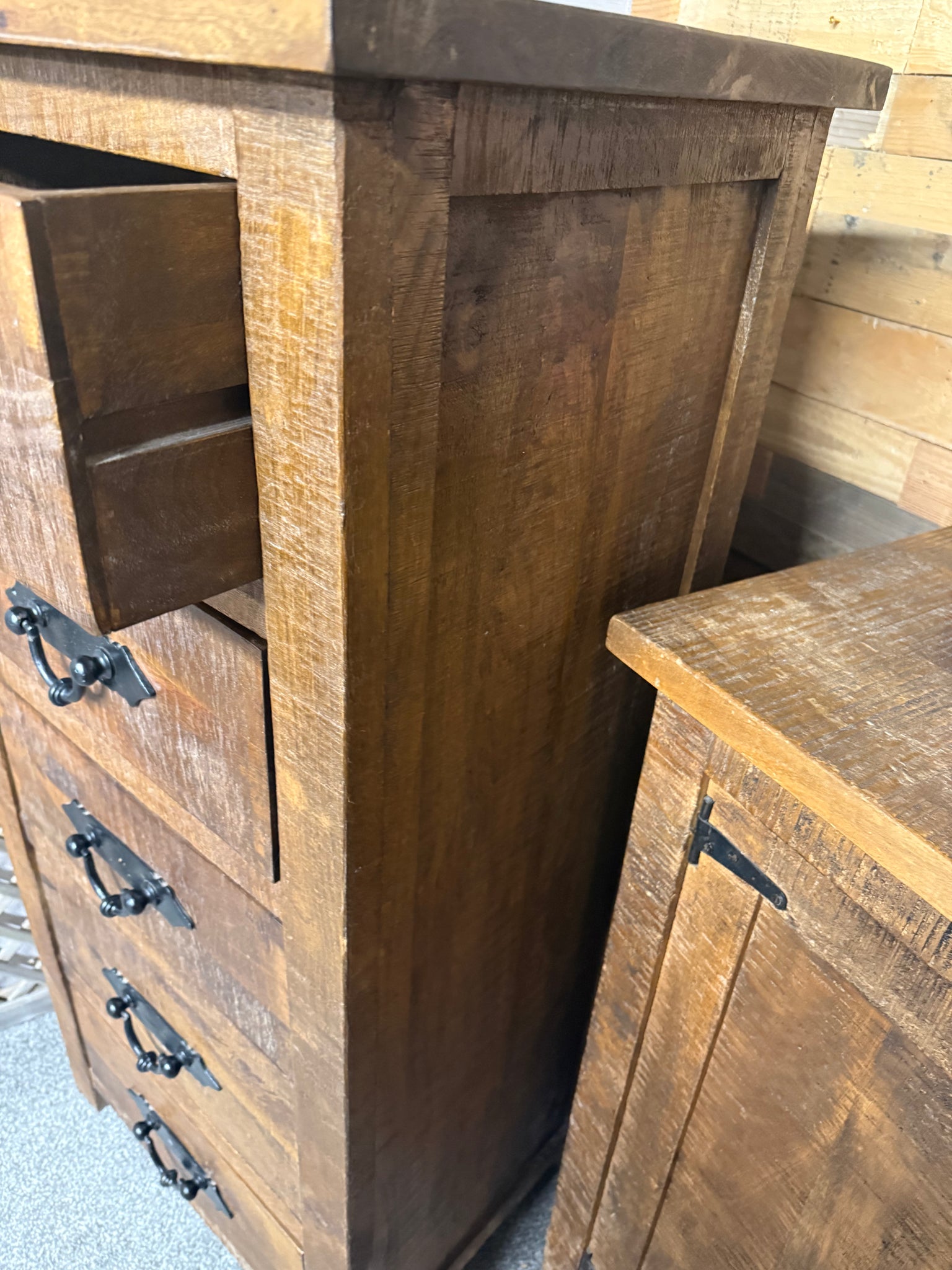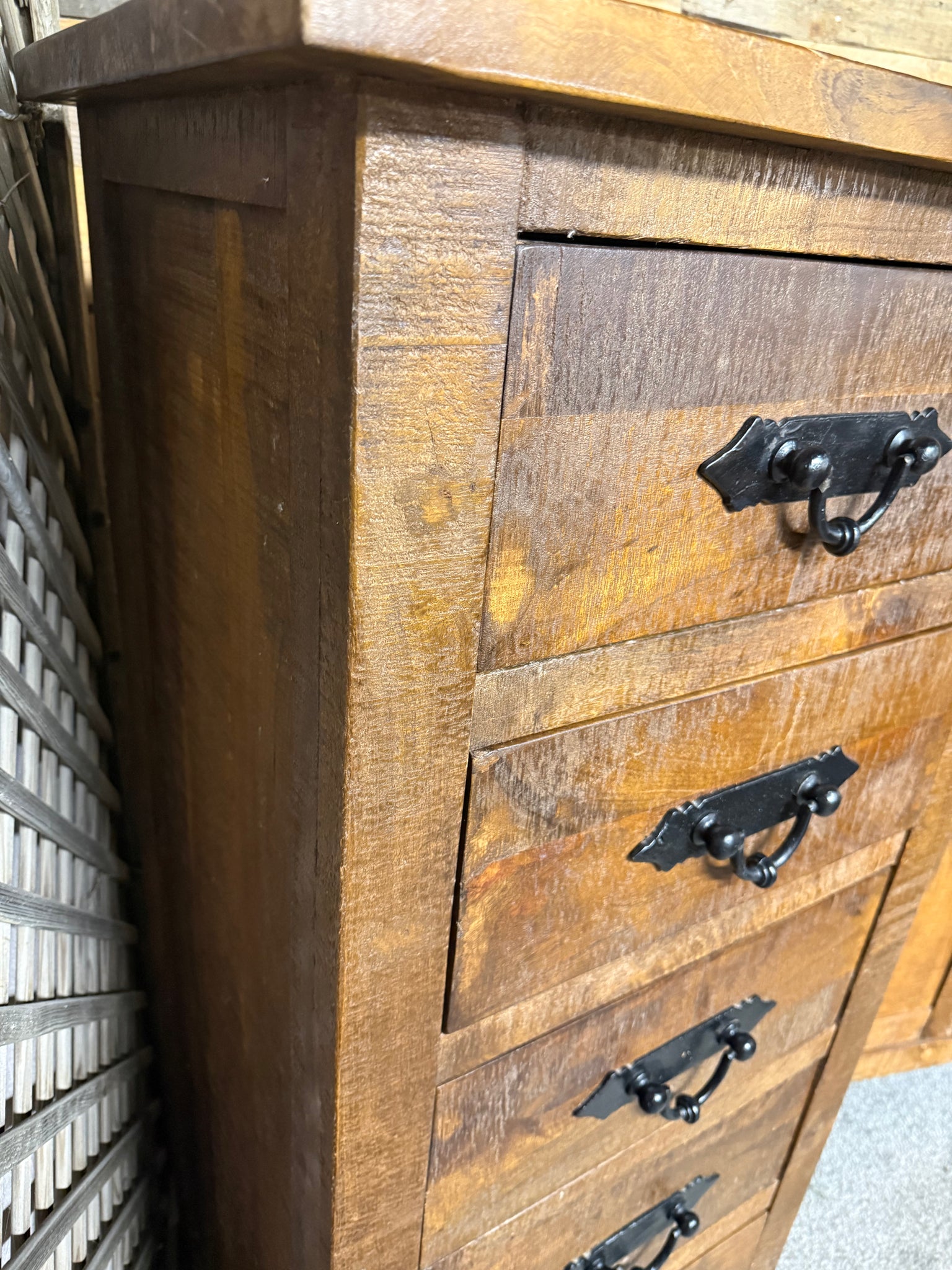 Crafted from solid wood, this rustic tallboy combines timeless character with practical storage. Five spacious drawers provide ample room for clothing, linens, or personal items. The piece bears the natural signs of use—subtle marks and weathering that enhance its authentic charm. Structurally sound and ready to become a distinctive focal point in any bedroom or living space.